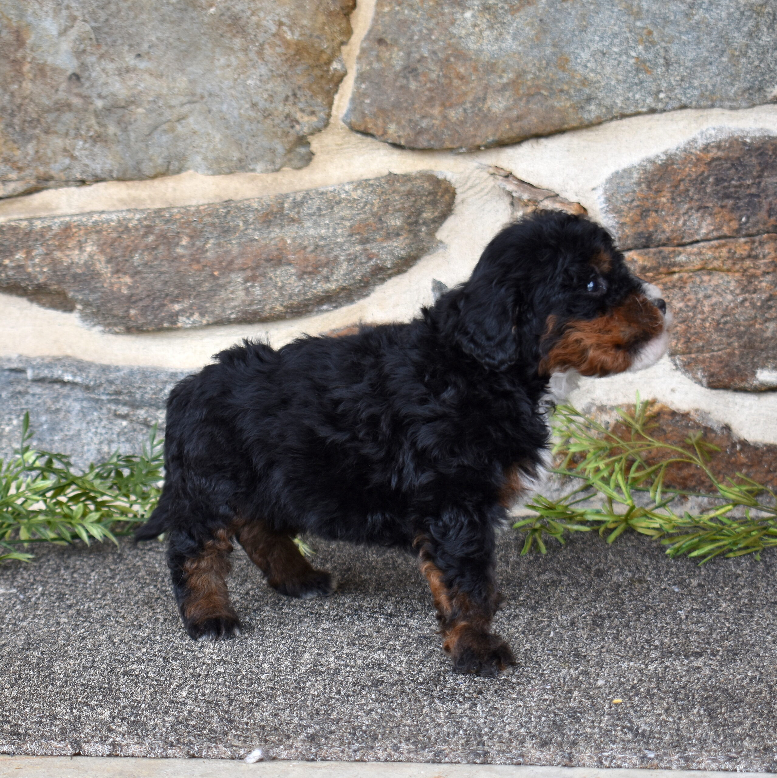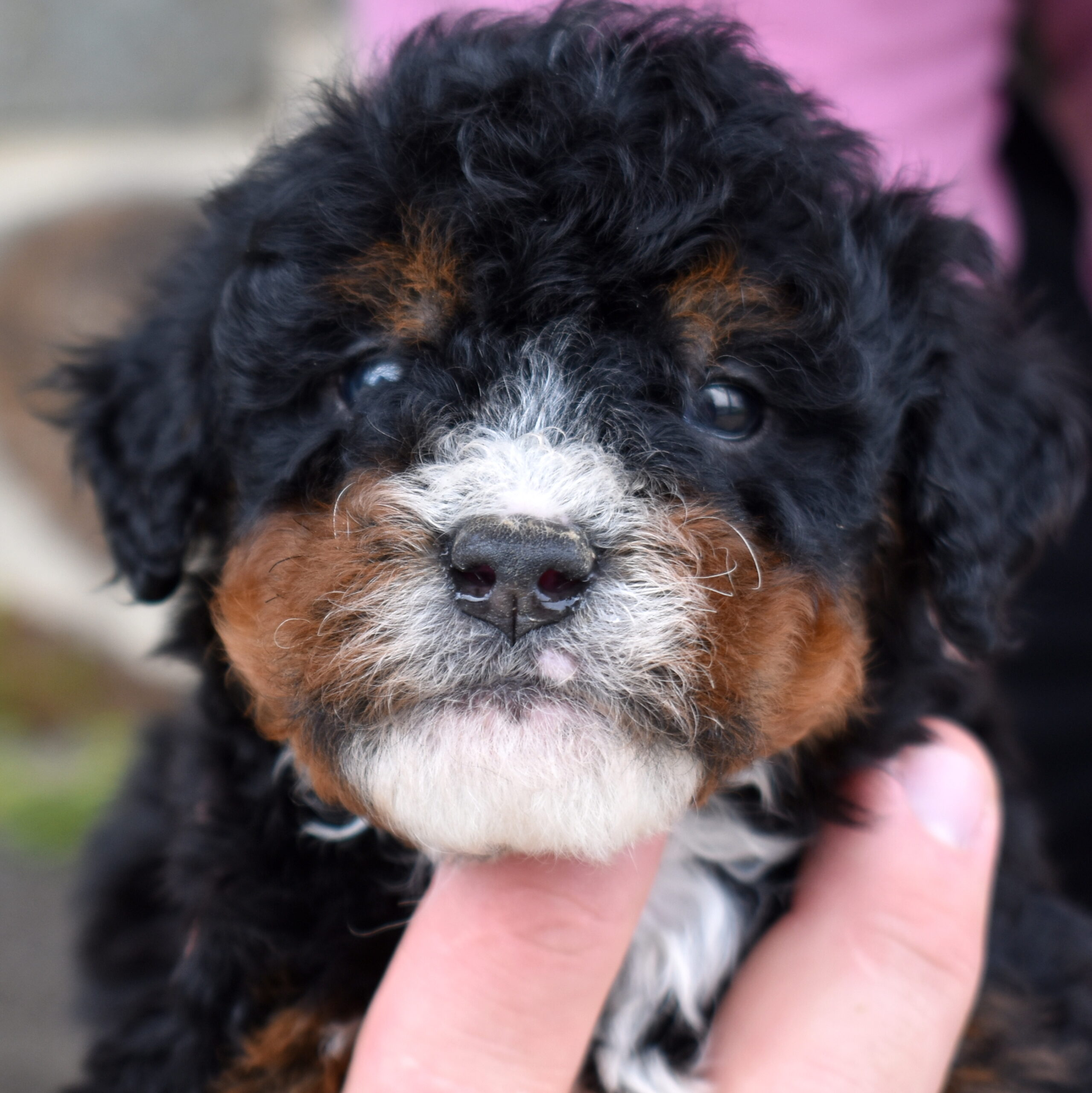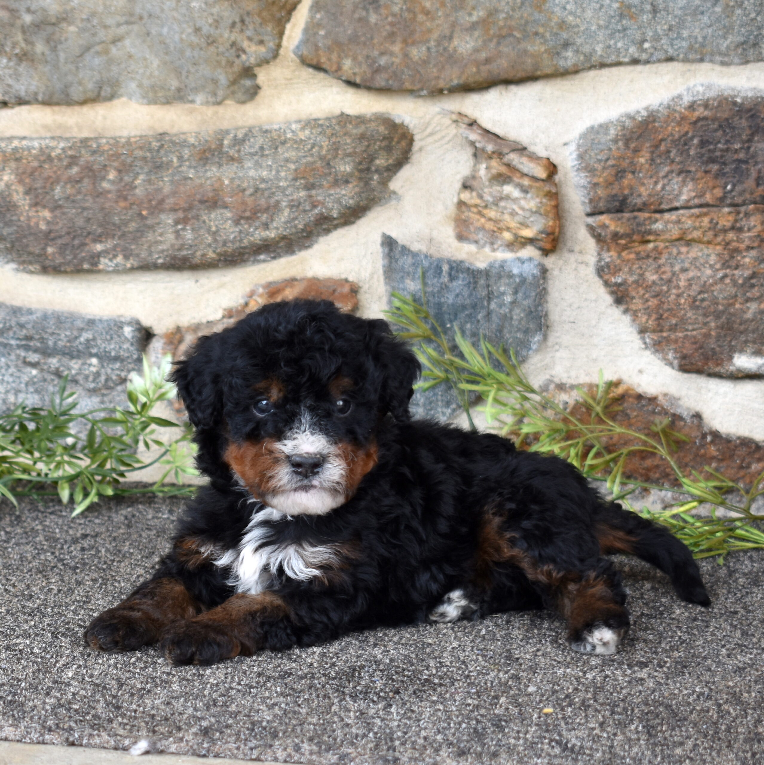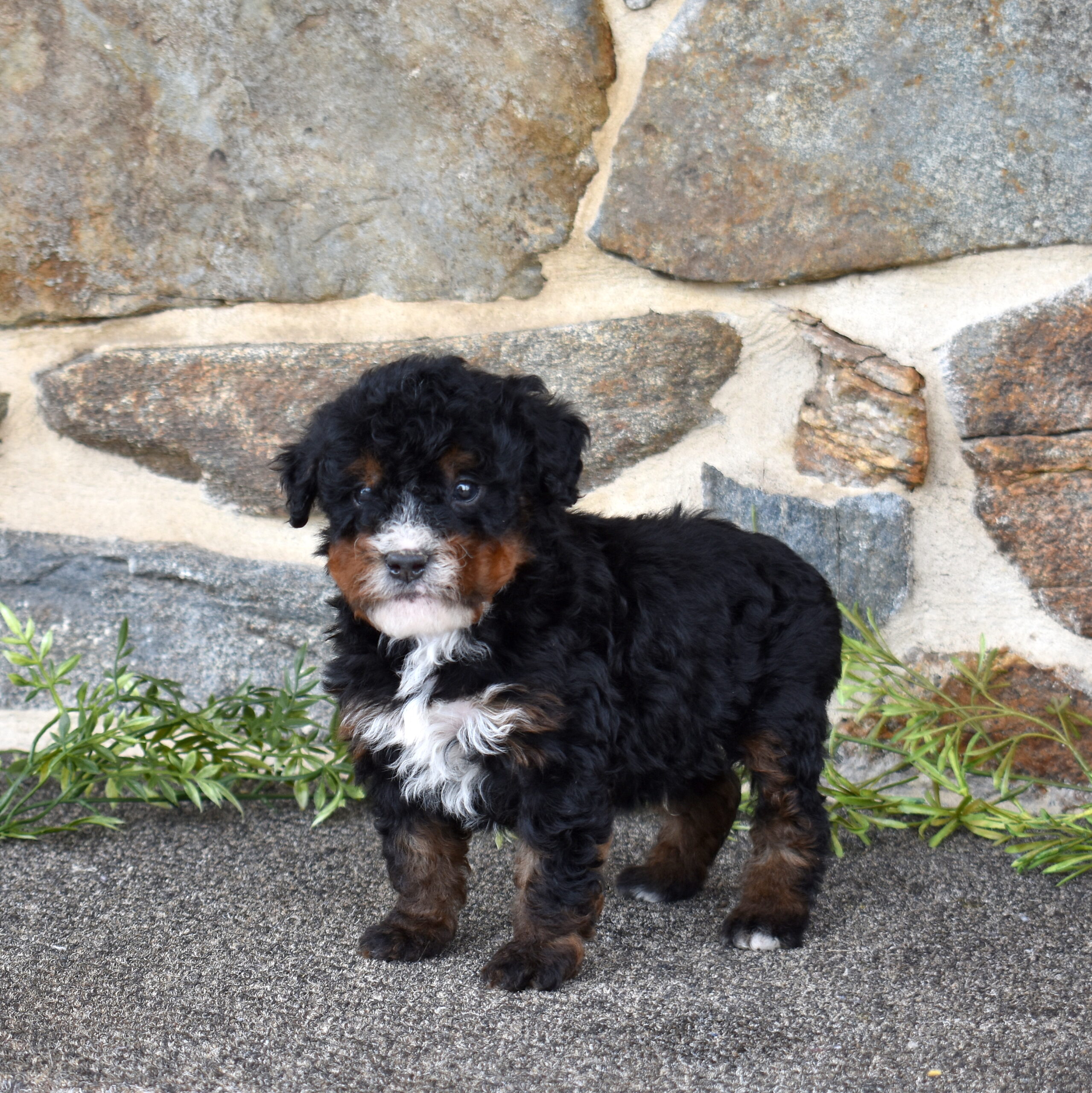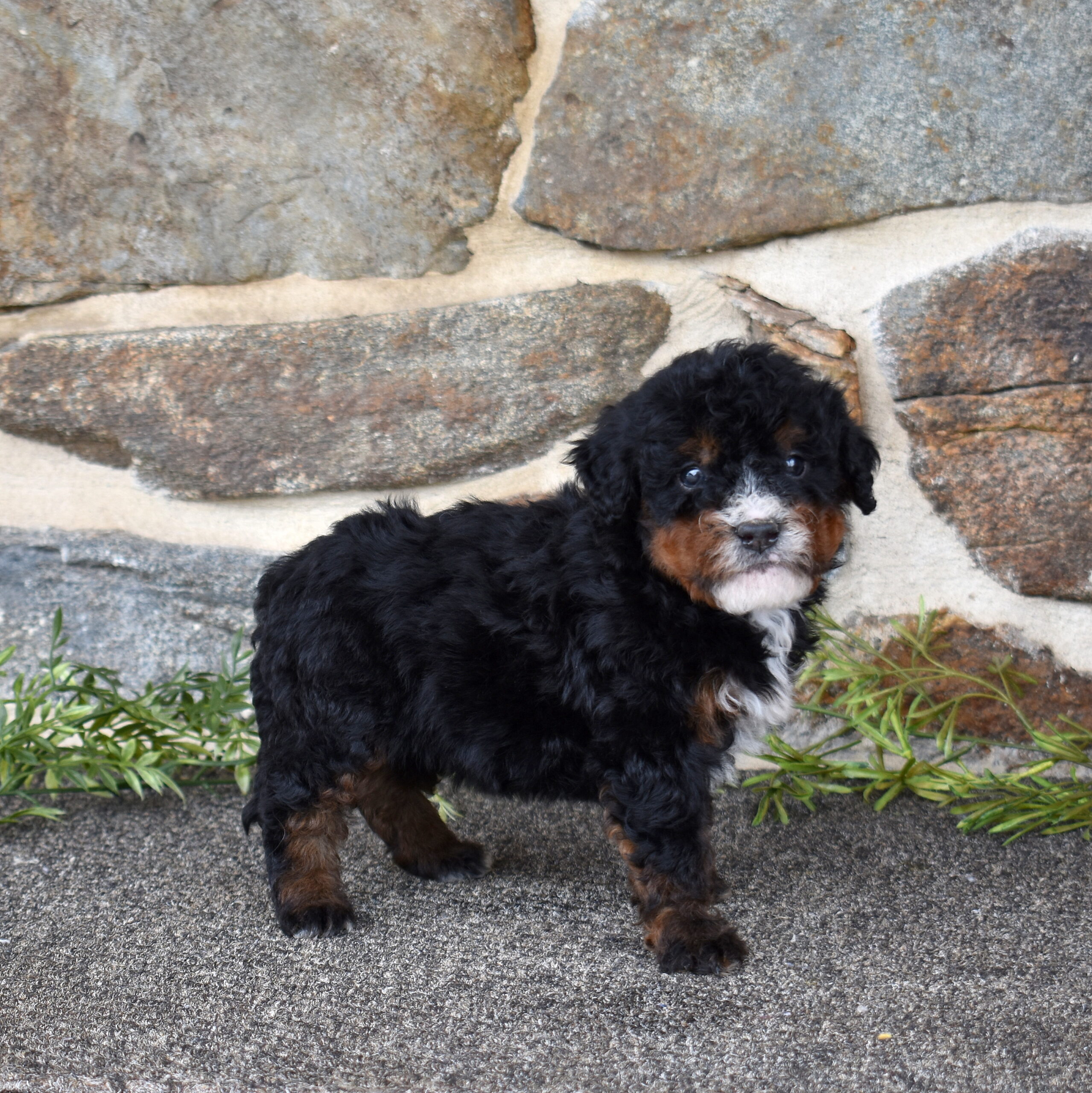 Bandit is a handsome tri color boy with a soft, curly coat and a relaxed, easygoing presence already starting to show. As part of this special Bernadoodle litter from Cuddles and Mr. Blue, we are excited to watch his personality grow and develop. Mom Cuddles is a 30-pound, laid-back and happy-to-please companion, while dad Mr. Blue is a 40-pound calm and reserved observer—both genetically tested. With this pairing, Bandit is expected to have a curlier, allergy-friendly coat thanks to the 55% Poodle and 45% Bernese mix.