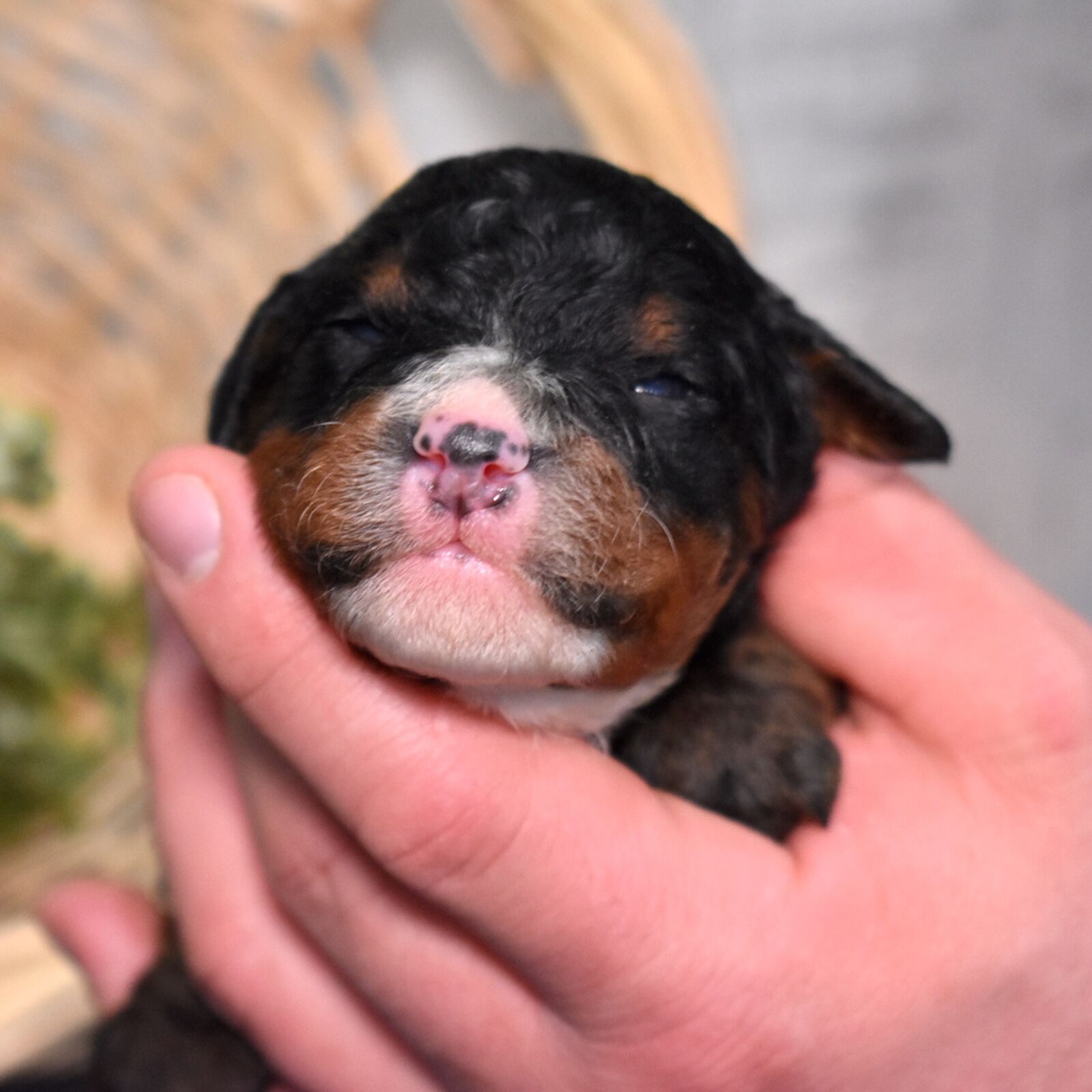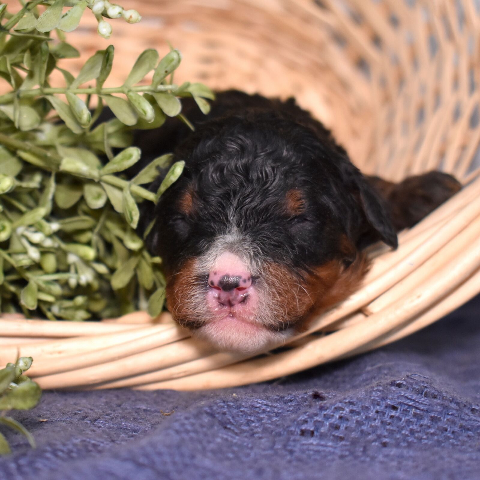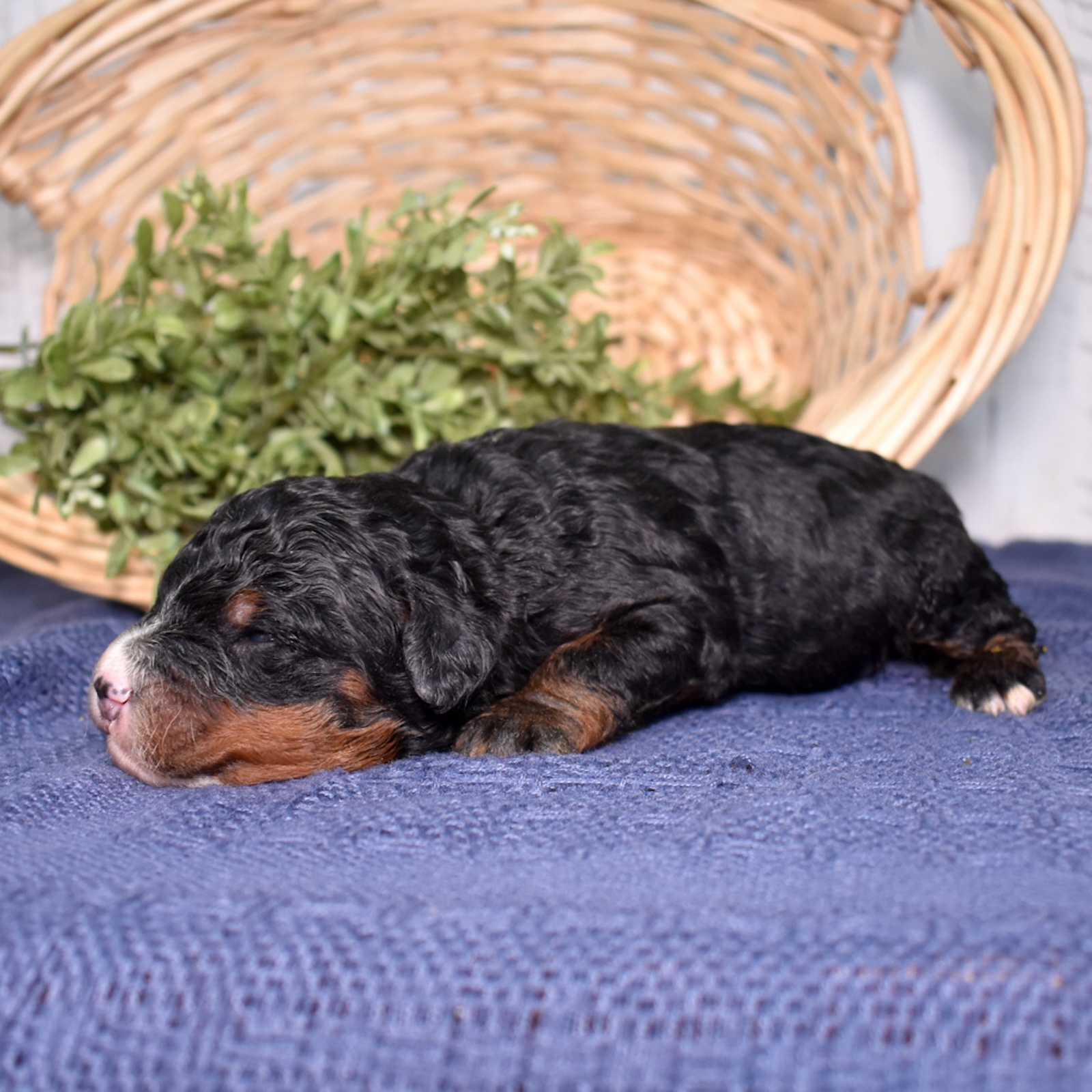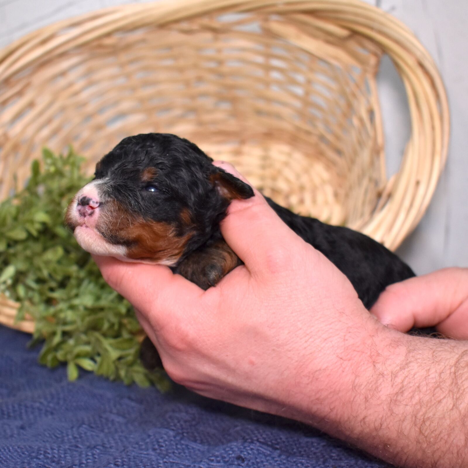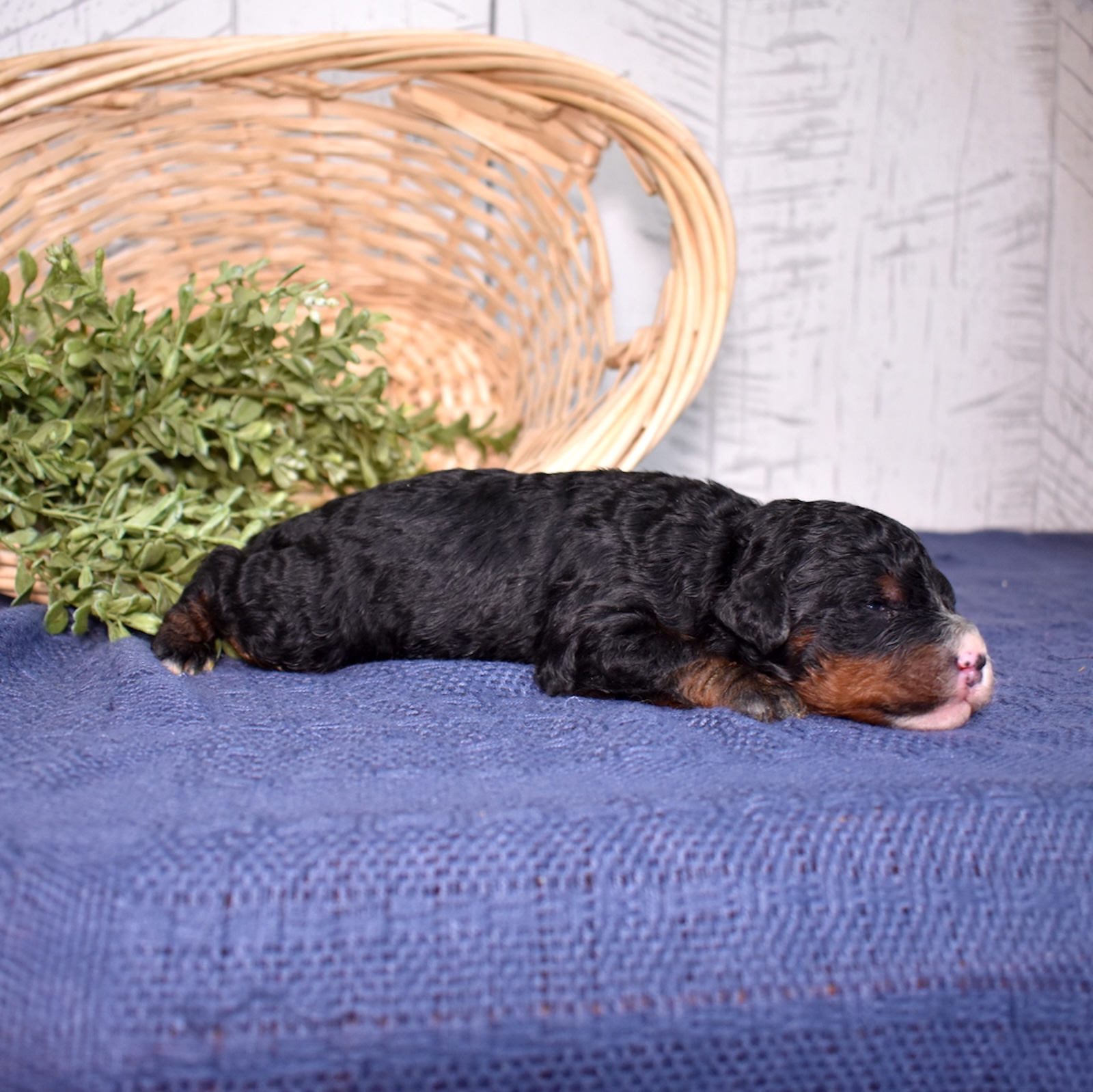 Bandit is a handsome tri color boy with a soft, curly coat and a relaxed, easygoing presence already starting to show. As part of this special Bernadoodle litter from Cuddles and Mr. Blue, we are excited to watch his personality grow and develop. Mom Cuddles is a 30-pound, laid-back and happy-to-please companion, while dad Mr. Blue is a 40-pound calm and reserved observer—both genetically tested. With this pairing, Bandit is expected to have a curlier, allergy-friendly coat thanks to the 55% Poodle and 45% Bernese mix.