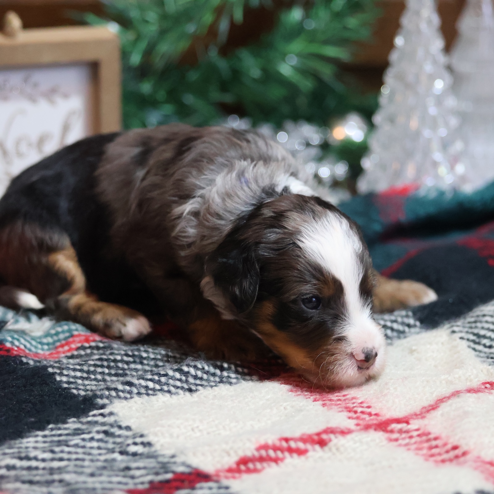 Meet Lucy, our gorgeous F1B Bernedoodle mama with a striking black tri-color coat and the kind of curls people fall in love with at first sight. Her coat is rich and glossy, with soft, springy ringlets that give her that classic teddy-bear look F1B Bernedoodles are known for. Those curls aren’t just beautiful—they’re also a sign of the low-shedding, family-friendly coat many homes hope for. Lucy carries herself with a calm confidence, and her gentle personality matches her plush, curly charm perfectly. As a mother, Lucy is truly exceptional. She pours her heart into caring for her puppies from the very first moment, keeping them warm, clean, and close. She’s attentive without being anxious, patient without missing a beat—always aware of each puppy’s needs. Whether she’s curling around them for comfort, guiding them back to nurse, or quietly watching as they begin to explore, Lucy’s steady presence helps her babies grow safe, secure, and curious about the world. Her nurturing nature is one of the reasons her puppies thrive so beautifully. Lucy is also part of our guardian home program, which means she lives day-to-day as a treasured companion with her guardian family. She enjoys all the routines of family life—relaxing in cozy spaces, playing outside, and being surrounded by the love and attention every dog deserves. When it’s time for a litter, Lucy raises her puppies in her family’s home as well, supported closely by our team and her guardian family. This home environment gives her pups early exposure to everyday sights and sounds, gentle handling, and lots of positive interaction right from the start. Lucy’s role as a guardian-home mom allows her to do what she does best—be a beloved family dog and a devoted mother. With her curly black tri-color coat, sweet temperament, and incredible care for her puppies, Lucy is a shining example of the heart behind our program and the wonderful beginnings we want for every puppy we raise.