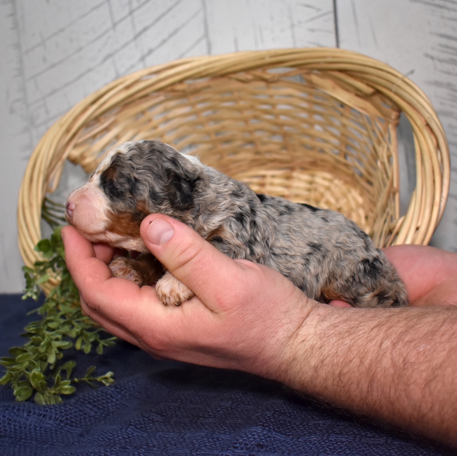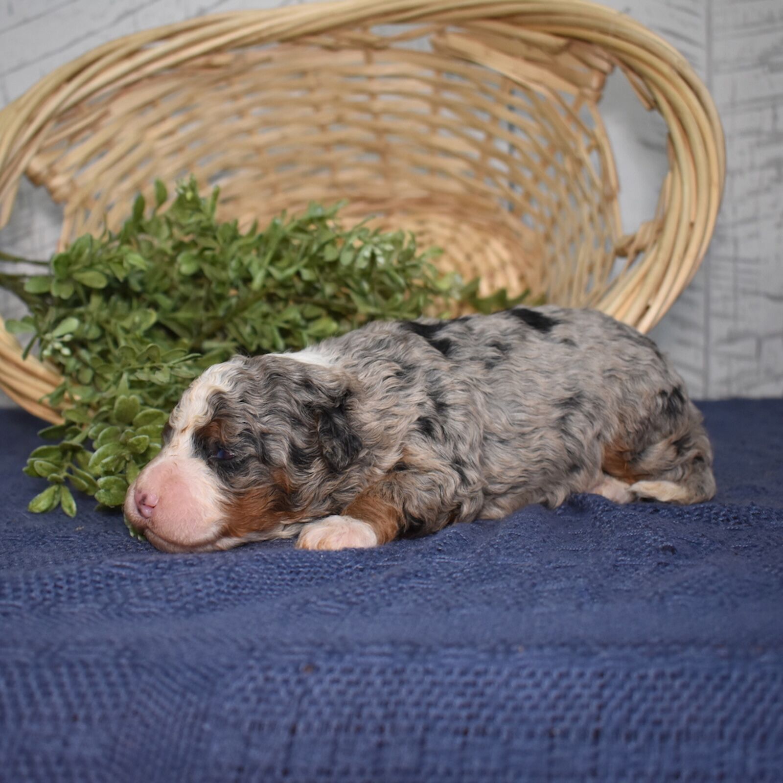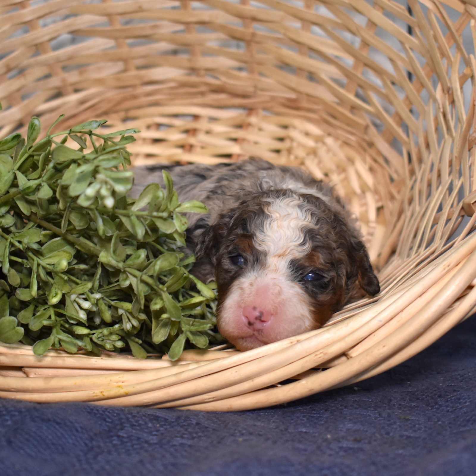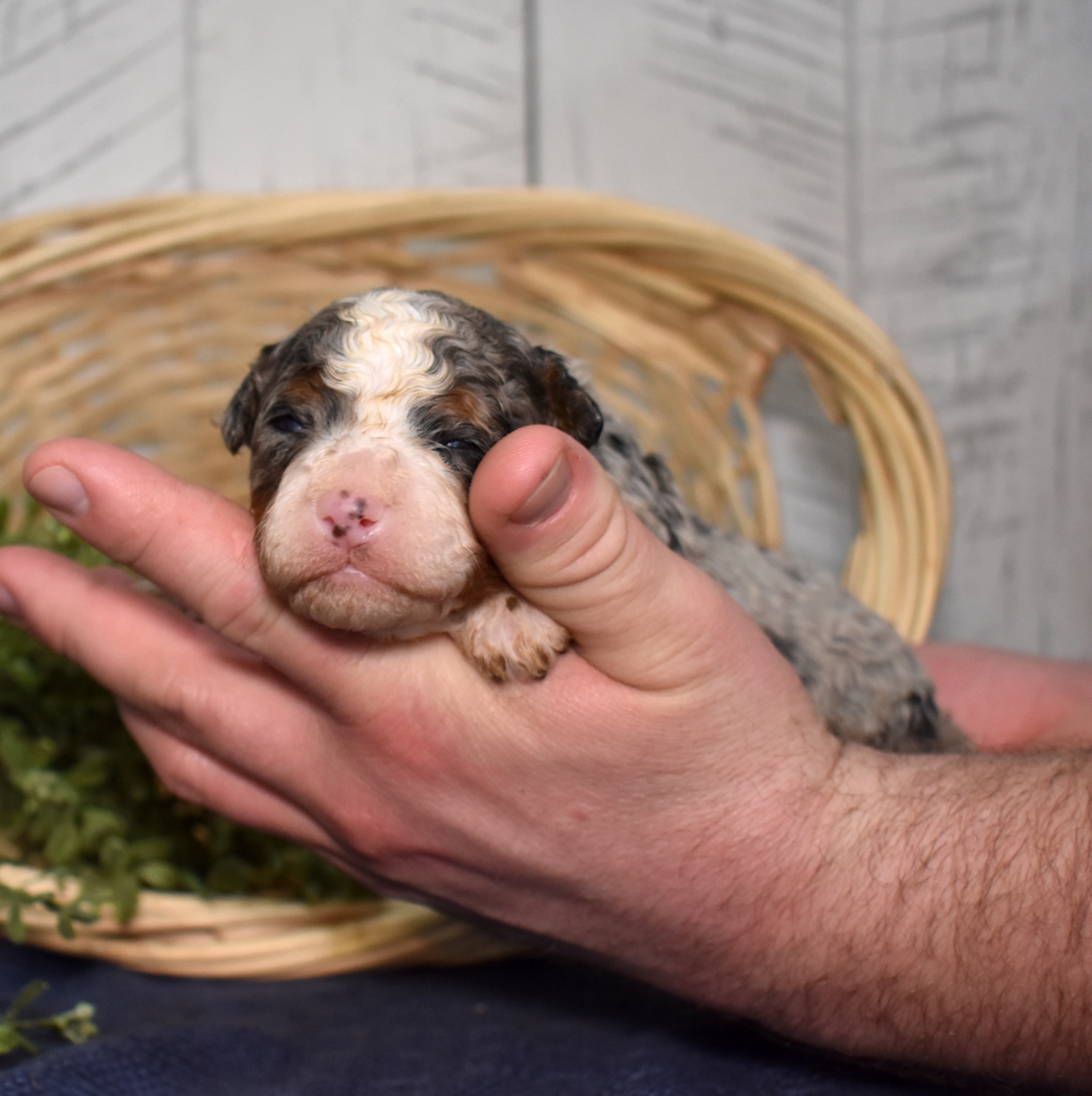 Bingo is a beautiful merle girl with a striking coat pattern and a gentle, curious nature. Coming from experienced Bernedoodle breeders, this Cuddles x Mr. Blue litter has so much potential, and we are eager to see her personality unfold. Cuddles brings her 30-pound, easygoing and affectionate temperament, while Mr. Blue contributes his calm and observant demeanor at 40 pounds—both genetically tested. Bingo is expected to have a curlier coat that is great for allergy-sensitive homes.