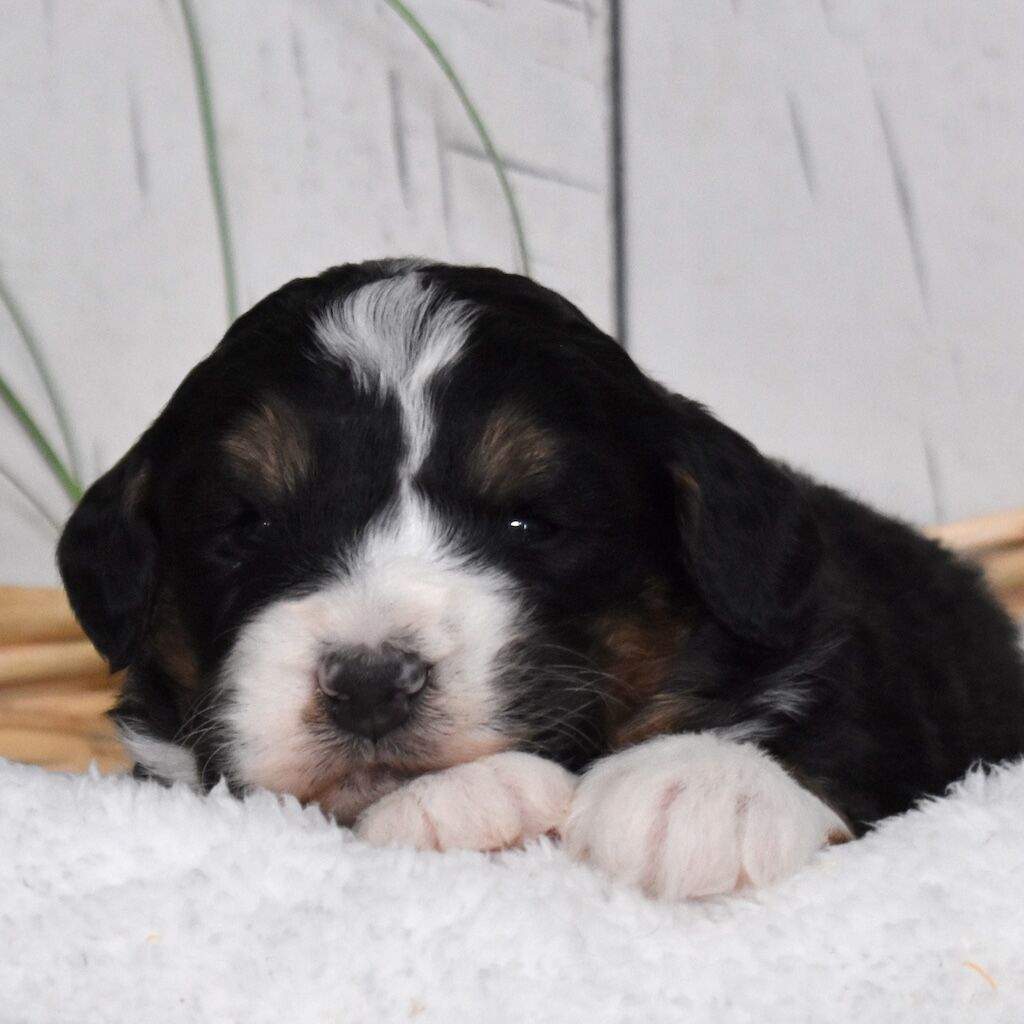 Oakley is a stunning Bernese Mountain Dog with the kind of gentle spirit the breed is famous for. She has a beautiful, well-balanced build, rich tri-color markings, and a calm, expressive face that instantly puts everyone at ease. Oakley is incredibly affectionate and thrives on being close to her people. Whether she’s lounging nearby, following you from room to room, or soaking up belly rubs, she loves being part of the family. True to her Bernese nature, Oakley is patient, nurturing, and exceptionally sweet. She has a steady temperament that makes her wonderful with children and other animals, and she approaches new situations with confidence and grace. Oakley is intelligent and eager to please, which makes her easy to work with and a joy to have around. As a mother, Oakley is attentive and loving, instinctively caring for her puppies with gentleness and devotion. Her calm demeanor and affectionate personality shine through in her babies, giving them a strong foundation for becoming loyal, family-friendly companions. Oakley truly represents the heart of the Bernese Mountain Dog—loving, dependable, and endlessly gentle.