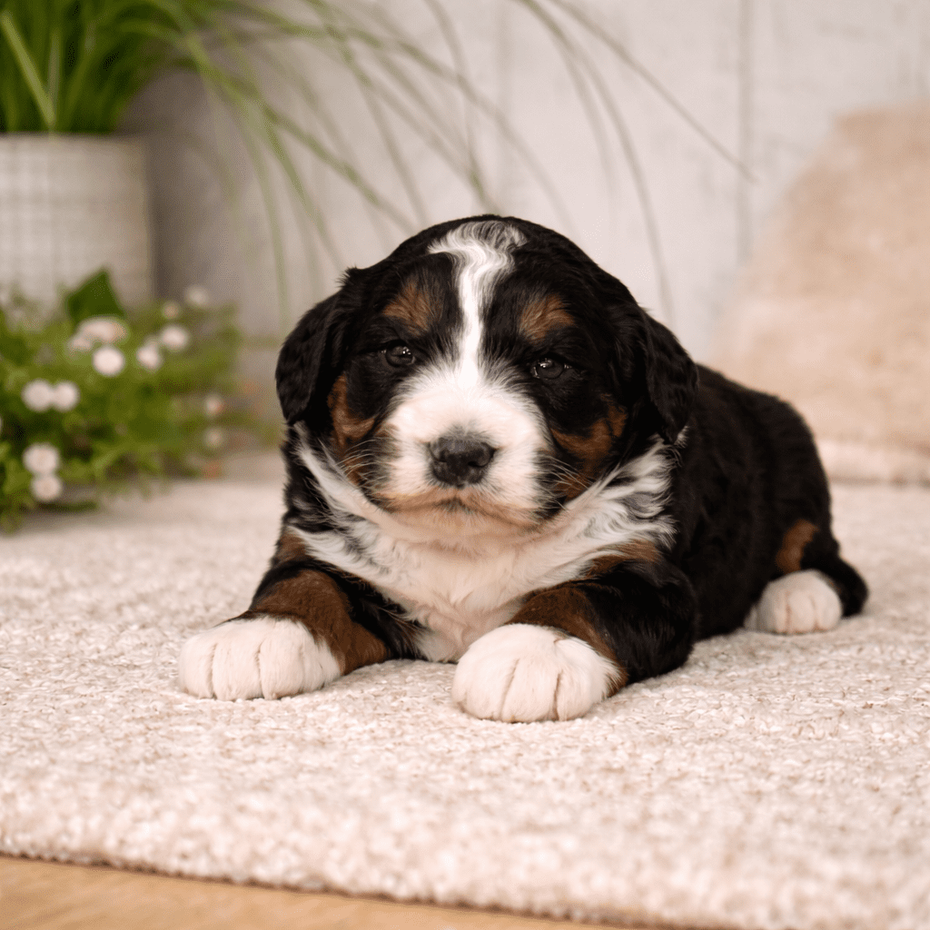 Oakley is a stunning Bernese Mountain Dog with the kind of gentle spirit the breed is famous for. She has a beautiful, well-balanced build, rich tri-color markings, and a calm, expressive face that instantly puts everyone at ease. Oakley is incredibly affectionate and thrives on being close to her people. Whether she’s lounging nearby, following you from room to room, or soaking up belly rubs, she loves being part of the family. True to her Bernese nature, Oakley is patient, nurturing, and exceptionally sweet. She has a steady temperament that makes her wonderful with children and other animals, and she approaches new situations with confidence and grace. Oakley is intelligent and eager to please, which makes her easy to work with and a joy to have around. As a mother, Oakley is attentive and loving, instinctively caring for her puppies with gentleness and devotion. Her calm demeanor and affectionate personality shine through in her babies, giving them a strong foundation for becoming loyal, family-friendly companions. Oakley truly represents the heart of the Bernese Mountain Dog—loving, dependable, and endlessly gentle.