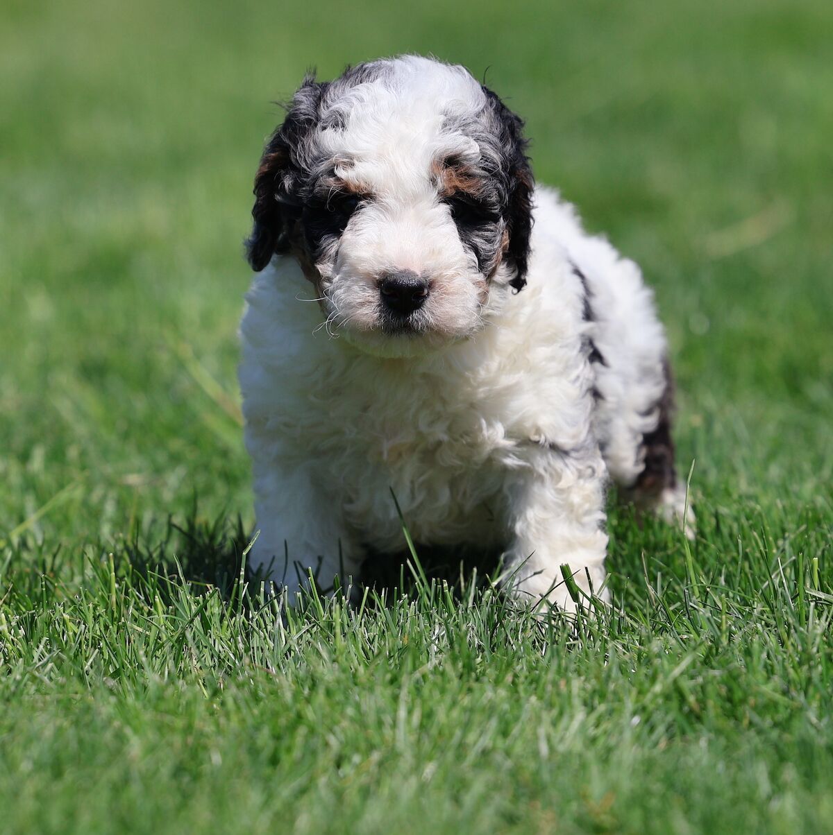 This crossbreed mixes the ingenious silliness of the poodle, with the even-tempered fidelity of the Berner. It is also a smaller sized dog for those who think a Bernese Mountain Dog is a bit too large, or have small children in the house and fear that a large dog breed may be too much of a handful. Bernedoodles shed less than Berners, making them safer for people with allergies.