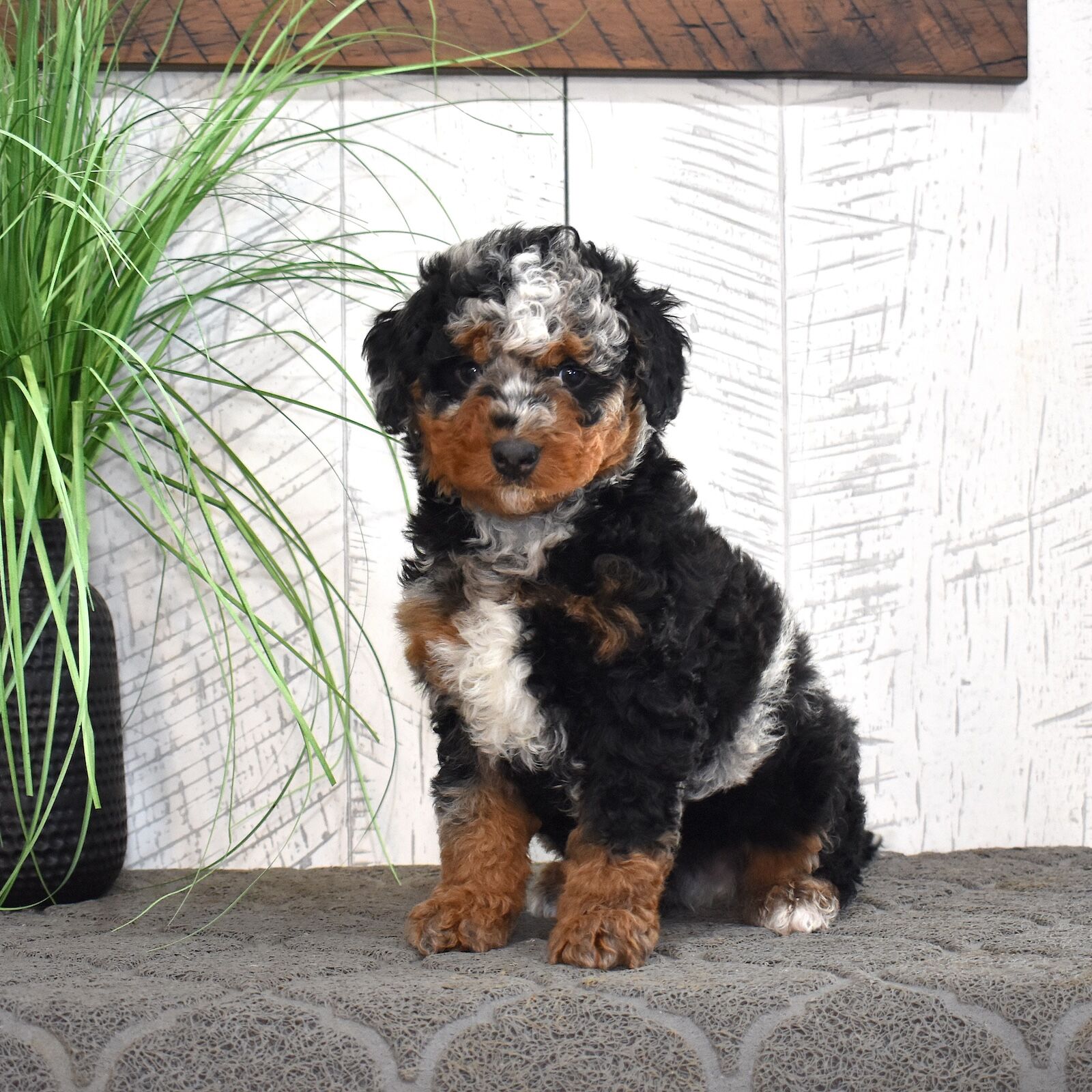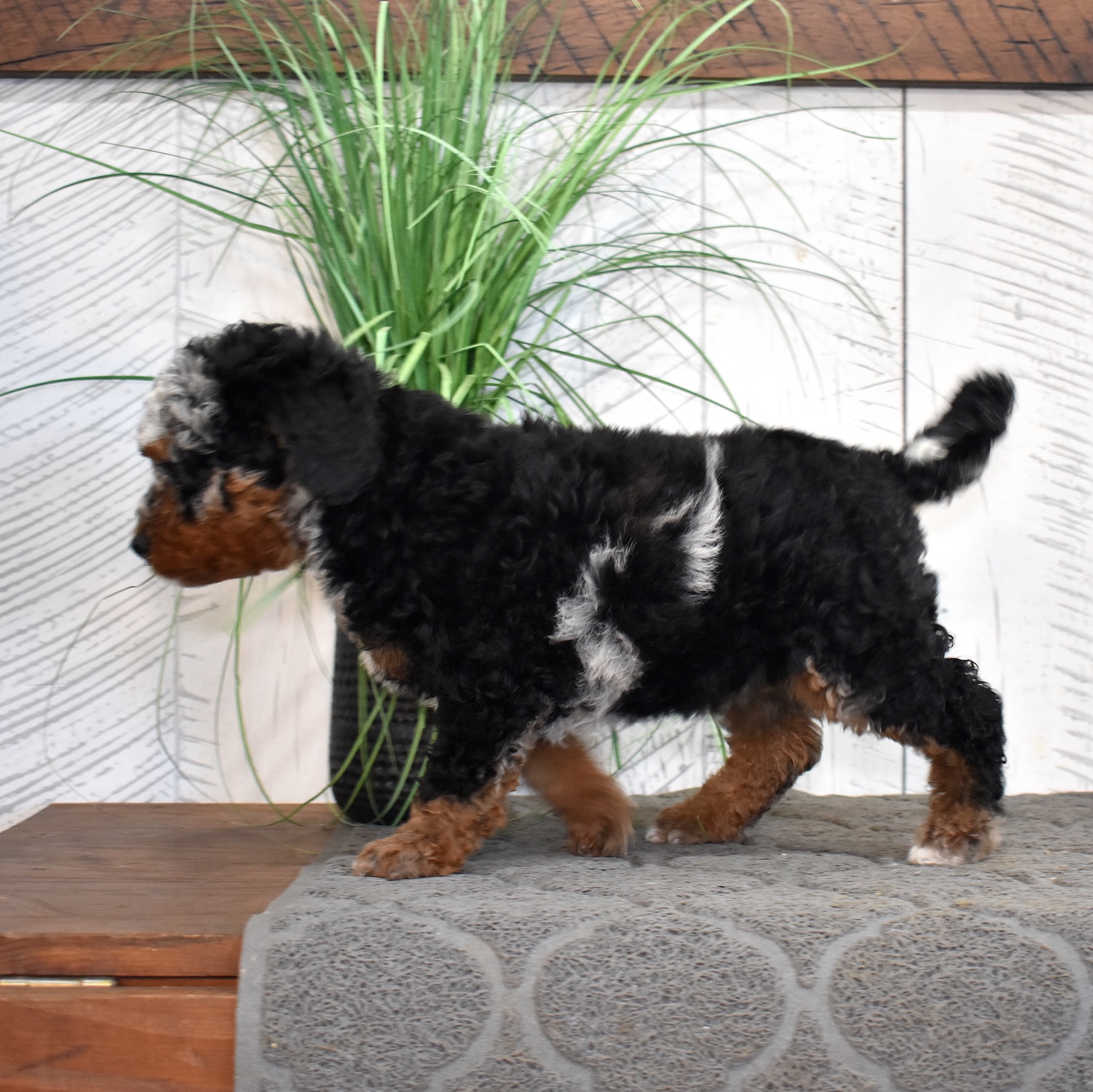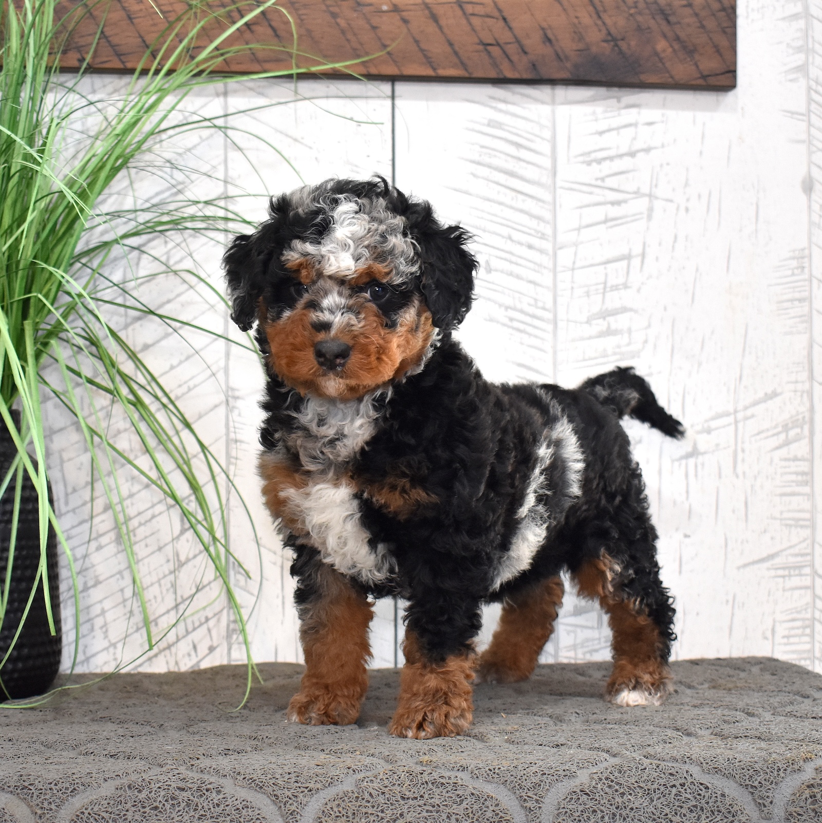 Jasper is a handsome mini Bernedoodle dad with an exceptional look and a personality to match. As a 60% Poodle mini Bernedoodle, Jasper brings strong Poodle influence to his puppies, making him an excellent choice for families hoping for curlier coats and lower-shedding traits. He’s confident, affectionate, and eager to please, with a sweet temperament that shines through in every interaction. One of Jasper’s most impressive features is his stunning curly chocolate tri-color coat. His rich chocolate base is beautifully accented with warm tan points and crisp white markings, creating a rare and striking tri-color pattern. The tight curls give him a plush, teddy-bear appearance while also adding to the soft, luxurious texture Bernedoodles are known for. Jasper is the perfect combination of gorgeous coloring, curlier coat genetics, and a loving, family-friendly personality—making him a standout sire in our mini Bernedoodle program.