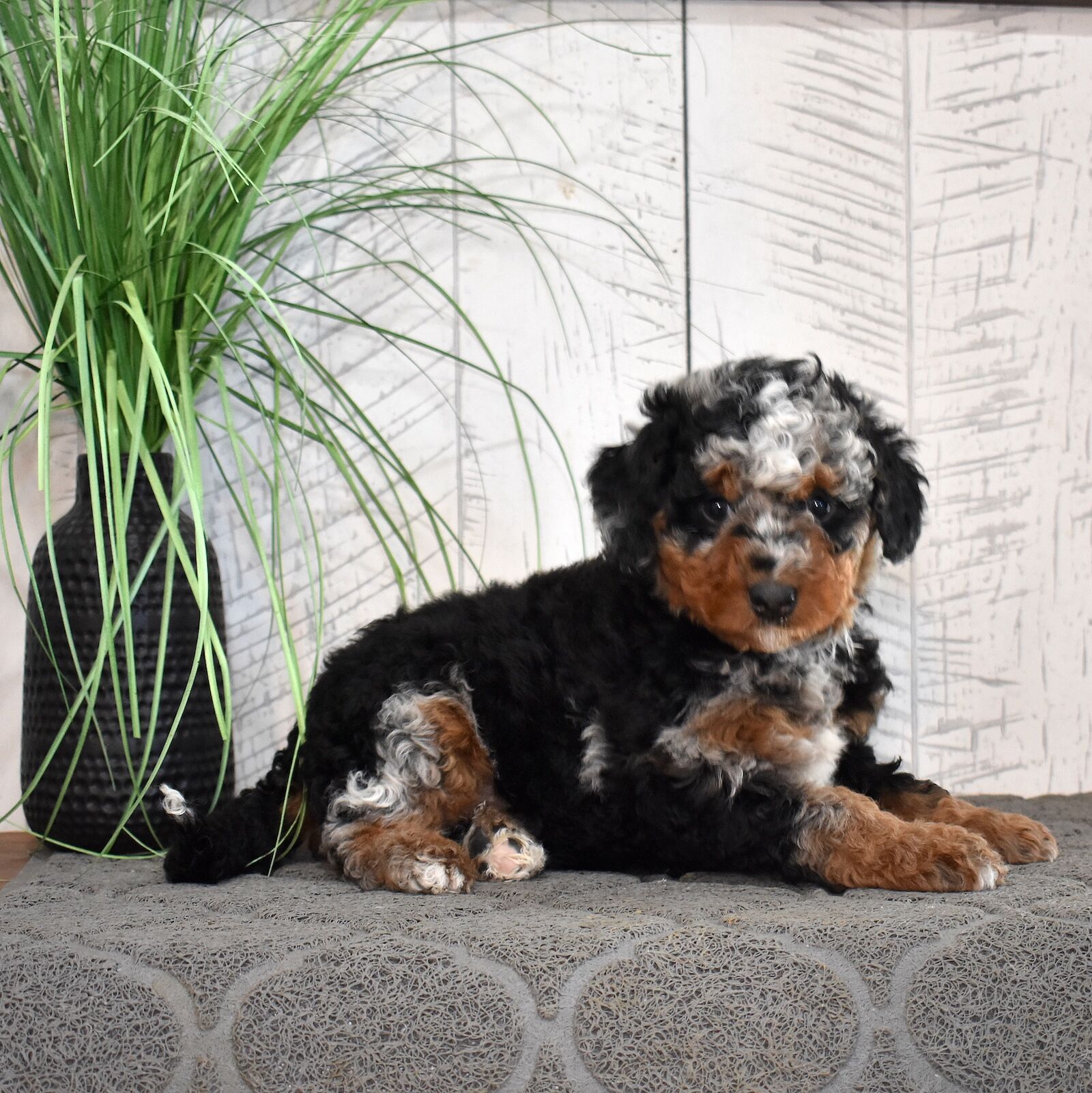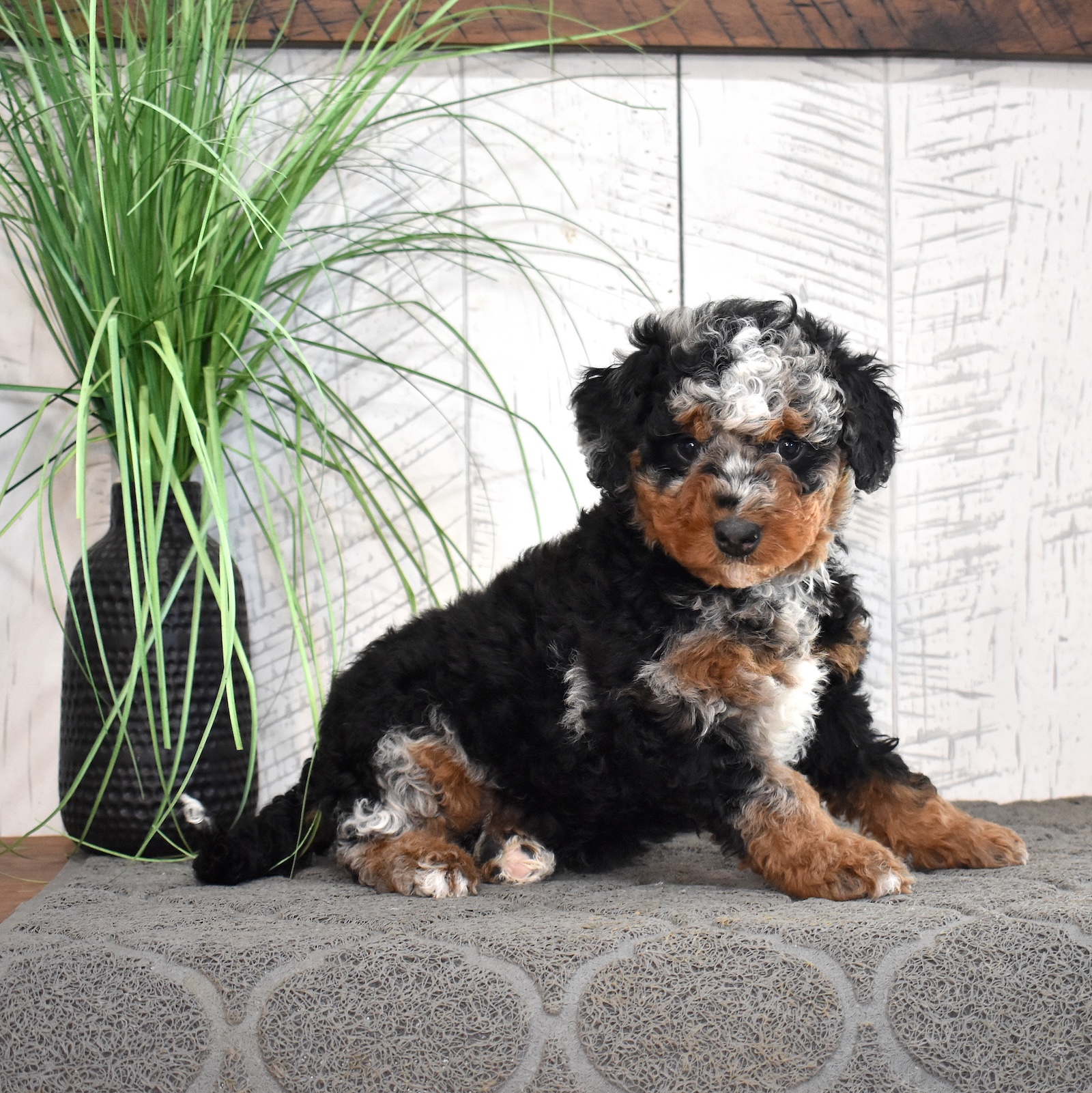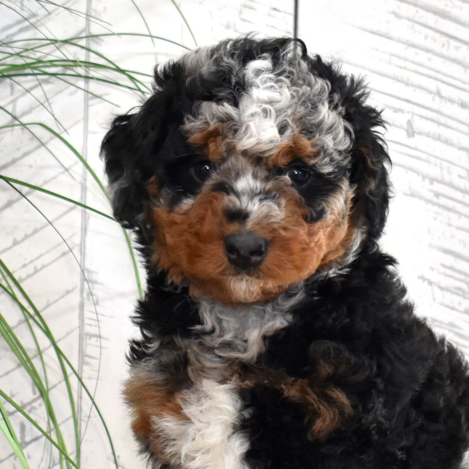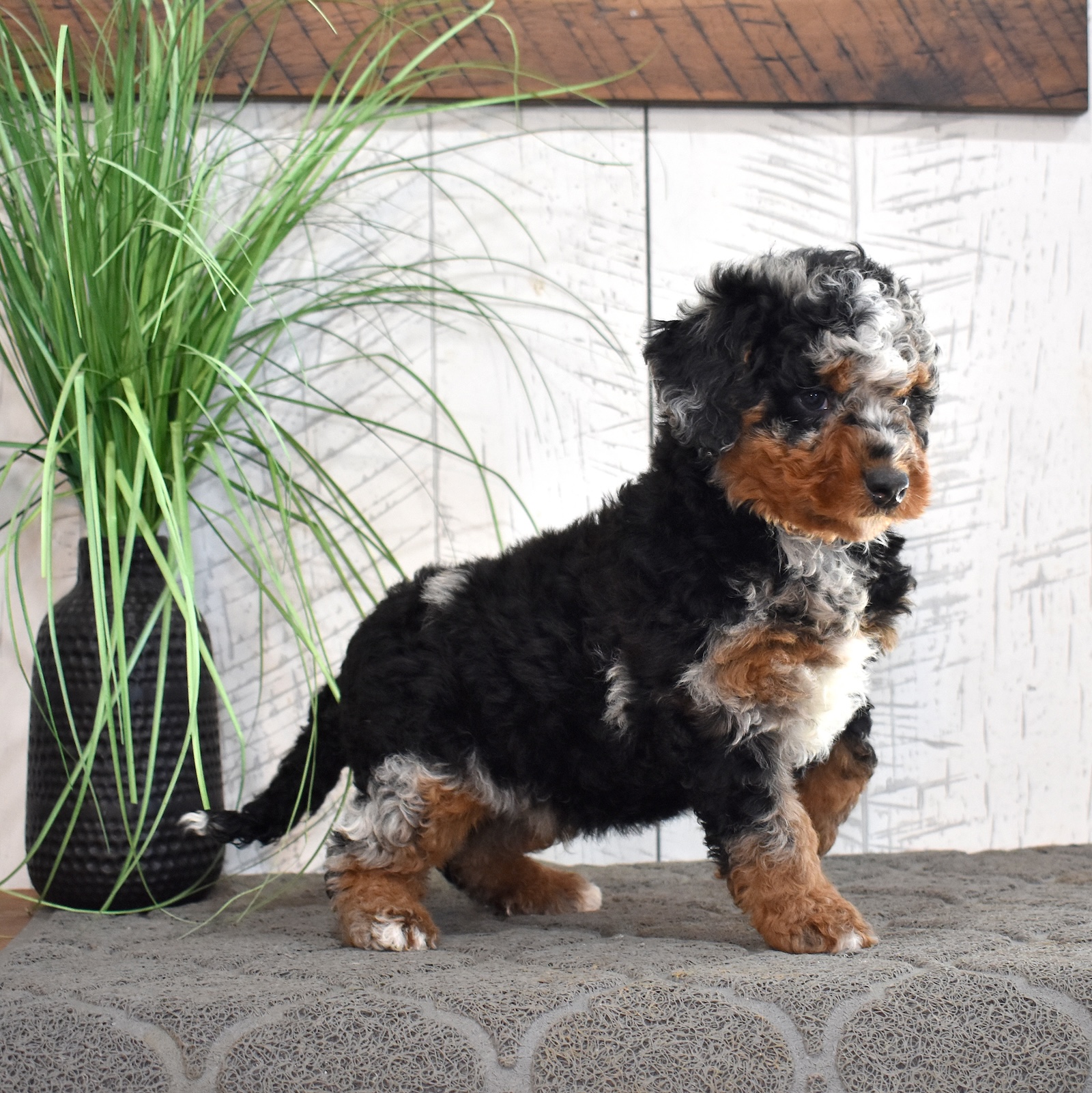 Jasper is a handsome mini Bernedoodle dad with an exceptional look and a personality to match. As a 60% Poodle mini Bernedoodle, Jasper brings strong Poodle influence to his puppies, making him an excellent choice for families hoping for curlier coats and lower-shedding traits. He’s confident, affectionate, and eager to please, with a sweet temperament that shines through in every interaction. One of Jasper’s most impressive features is his stunning curly chocolate tri-color coat. His rich chocolate base is beautifully accented with warm tan points and crisp white markings, creating a rare and striking tri-color pattern. The tight curls give him a plush, teddy-bear appearance while also adding to the soft, luxurious texture Bernedoodles are known for. Jasper is the perfect combination of gorgeous coloring, curlier coat genetics, and a loving, family-friendly personality—making him a standout sire in our mini Bernedoodle program.