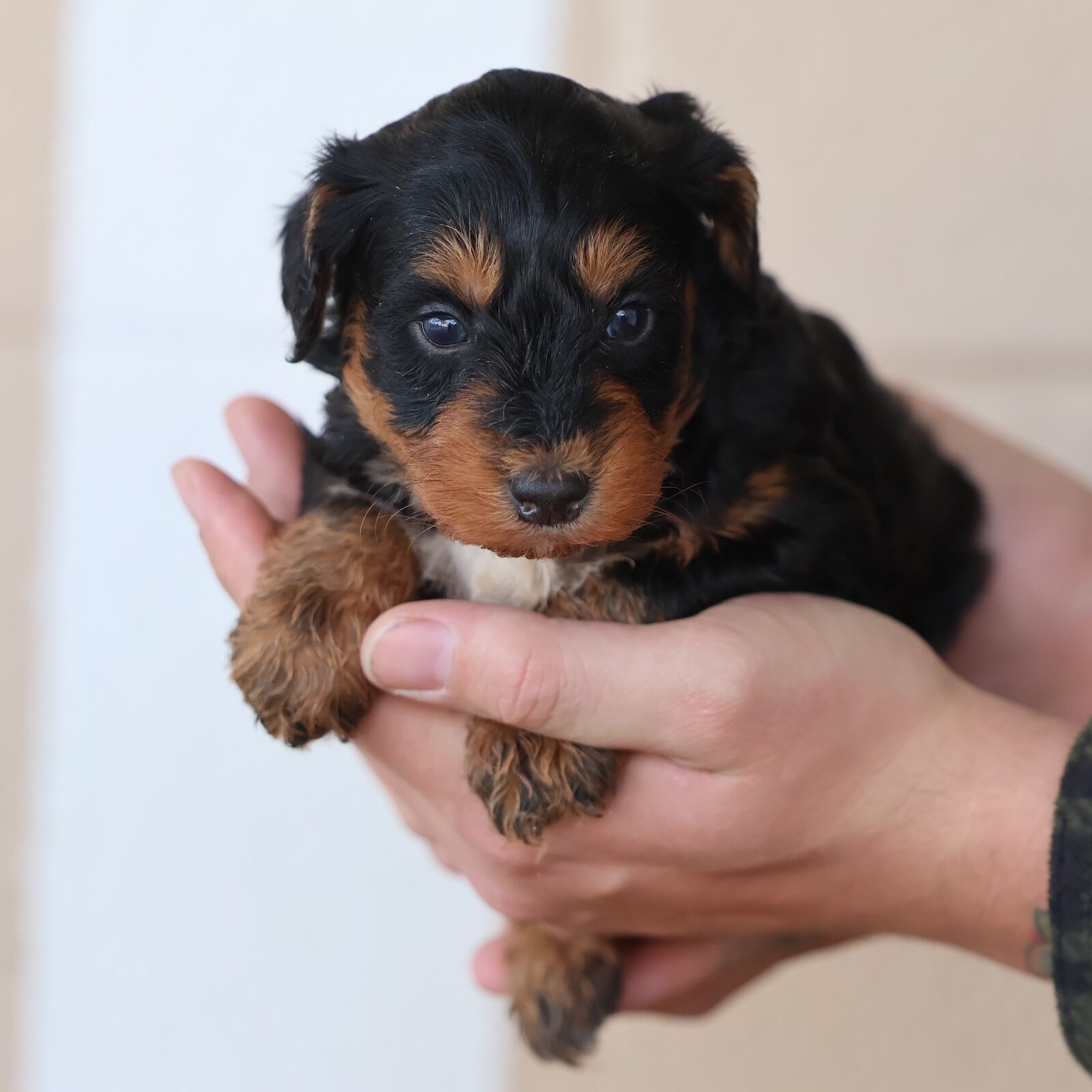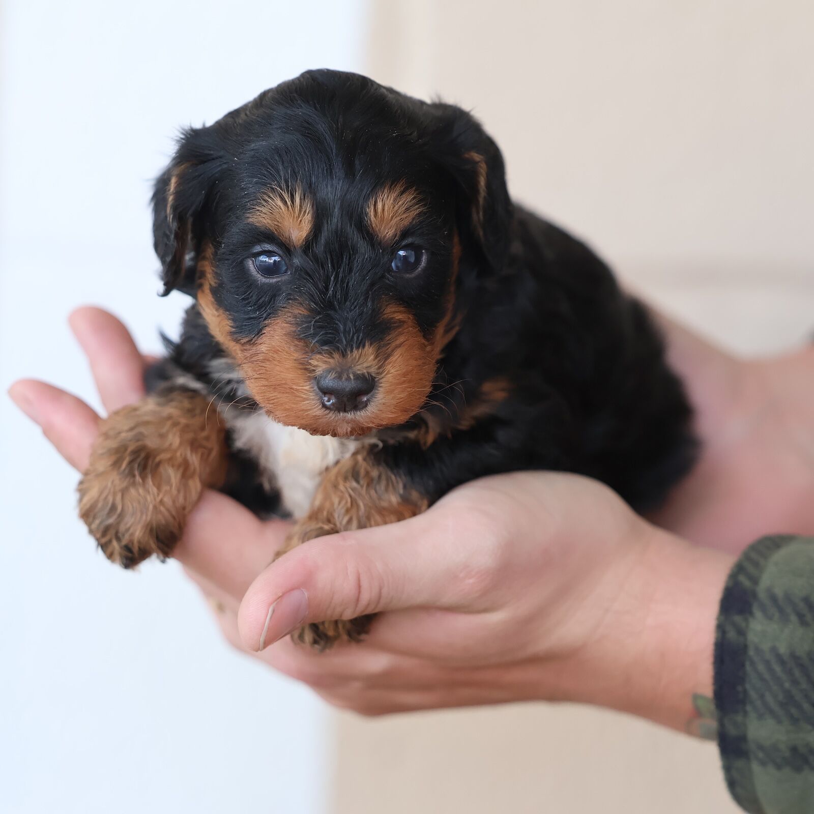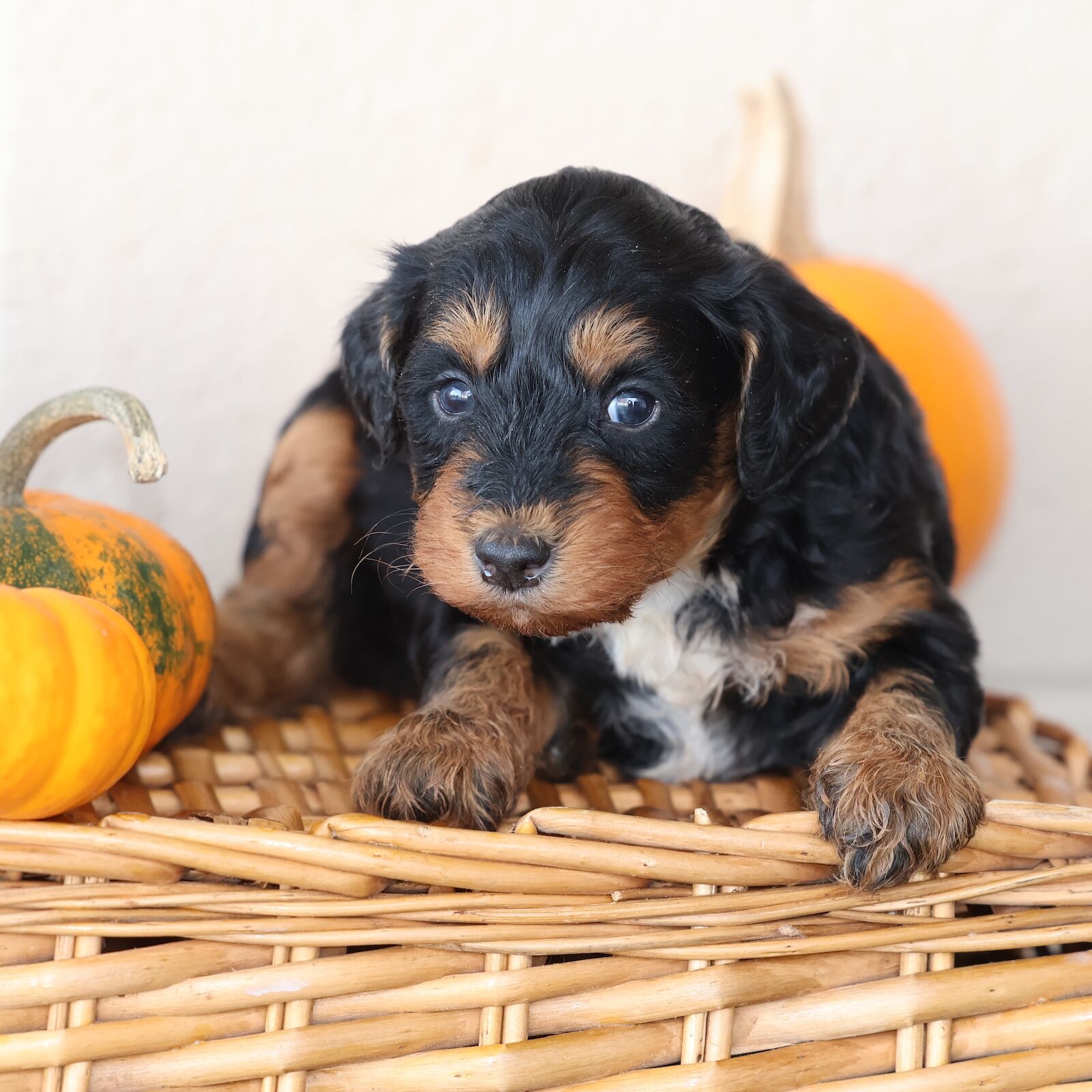 Tammy is a stunning F1 Bernedoodle mom whose charm is impossible to overlook. Her traditional black tri-color coat is a perfect blend of silky black, warm rust, and crisp white — a timeless Bernedoodle look that feels both classic and comforting. What makes Tammy truly stand out, though, is the texture of her coat. It’s beautifully curly yet incredibly soft to the touch, like a luxurious blanket that invites cuddles. Whether she’s trotting across the yard or lying in the sunshine, her curls bounce gently with every move, giving her an effortlessly elegant presence. Beyond her gorgeous appearance, Tammy has a personality that radiates pure joy. She’s a smiley girl through and through — always wearing a happy expression that makes everyone around her feel lighter. Whether she’s playing with her favorite toy, greeting visitors with enthusiasm, or simply lounging contentedly after a walk, her cheerful nature shines bright. She approaches everything she does with heart and a wagging tail, bringing warmth and laughter to every moment. Tammy’s gentle intelligence and affectionate spirit also make her an exceptional mom. She’s attentive, patient, and nurturing, always ensuring her puppies feel safe and loved. Her combination of beauty, kindness, and a joyful soul makes her a true treasure in every way. With her soft, curly coat and constant smile, Tammy embodies everything people adore about Bernedoodles — a perfect mix of elegance, sweetness, and genuine happiness.