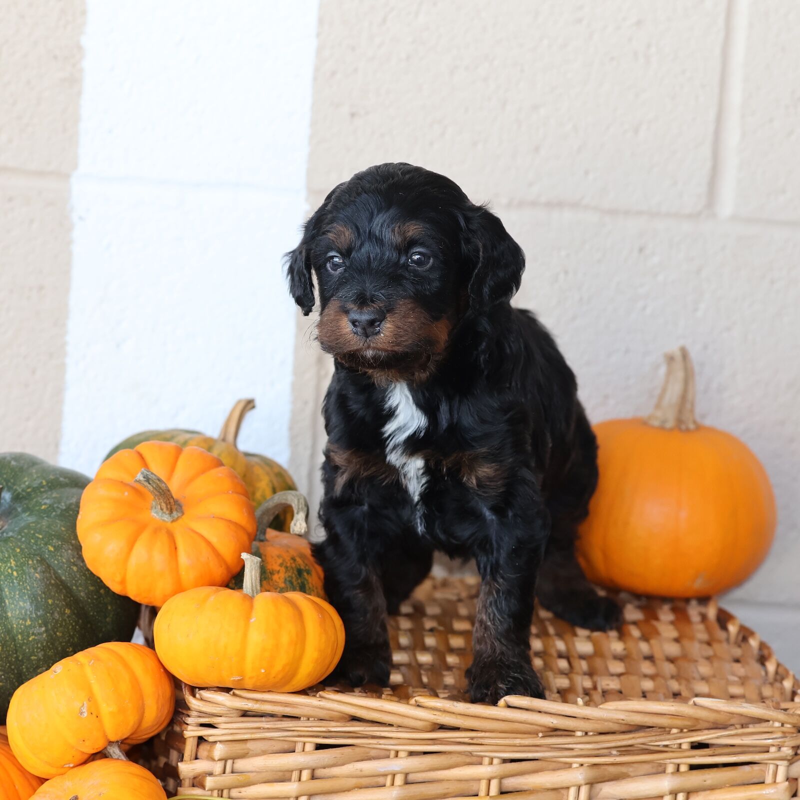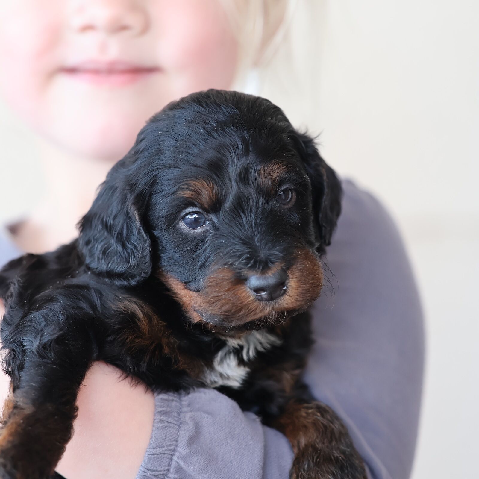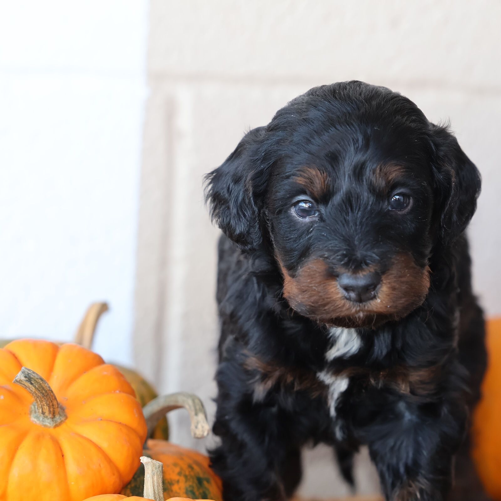 Tammy is a stunning F1 Bernedoodle mom whose charm is impossible to overlook. Her traditional black tri-color coat is a perfect blend of silky black, warm rust, and crisp white — a timeless Bernedoodle look that feels both classic and comforting. What makes Tammy truly stand out, though, is the texture of her coat. It’s beautifully curly yet incredibly soft to the touch, like a luxurious blanket that invites cuddles. Whether she’s trotting across the yard or lying in the sunshine, her curls bounce gently with every move, giving her an effortlessly elegant presence. Beyond her gorgeous appearance, Tammy has a personality that radiates pure joy. She’s a smiley girl through and through — always wearing a happy expression that makes everyone around her feel lighter. Whether she’s playing with her favorite toy, greeting visitors with enthusiasm, or simply lounging contentedly after a walk, her cheerful nature shines bright. She approaches everything she does with heart and a wagging tail, bringing warmth and laughter to every moment. Tammy’s gentle intelligence and affectionate spirit also make her an exceptional mom. She’s attentive, patient, and nurturing, always ensuring her puppies feel safe and loved. Her combination of beauty, kindness, and a joyful soul makes her a true treasure in every way. With her soft, curly coat and constant smile, Tammy embodies everything people adore about Bernedoodles — a perfect mix of elegance, sweetness, and genuine happiness.
