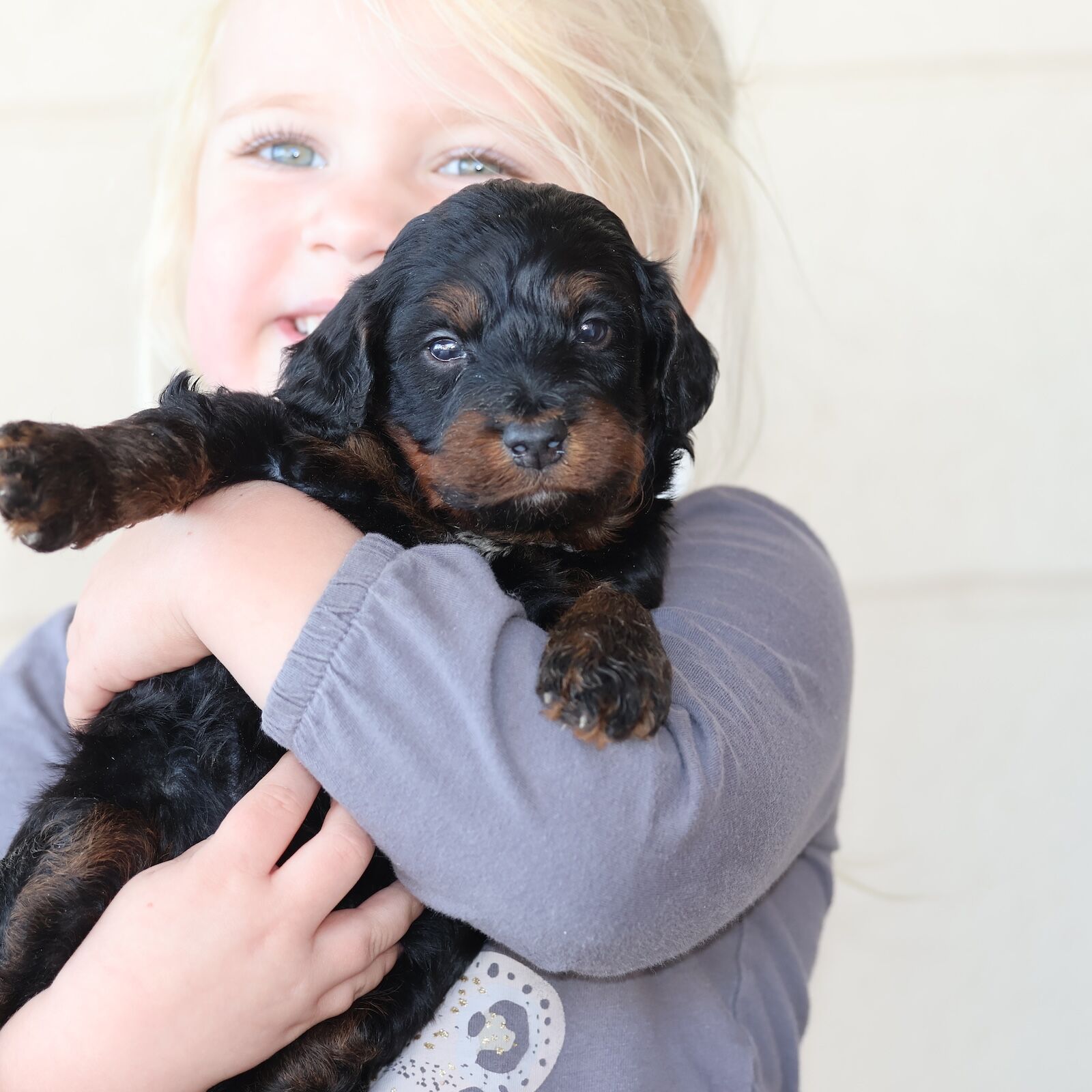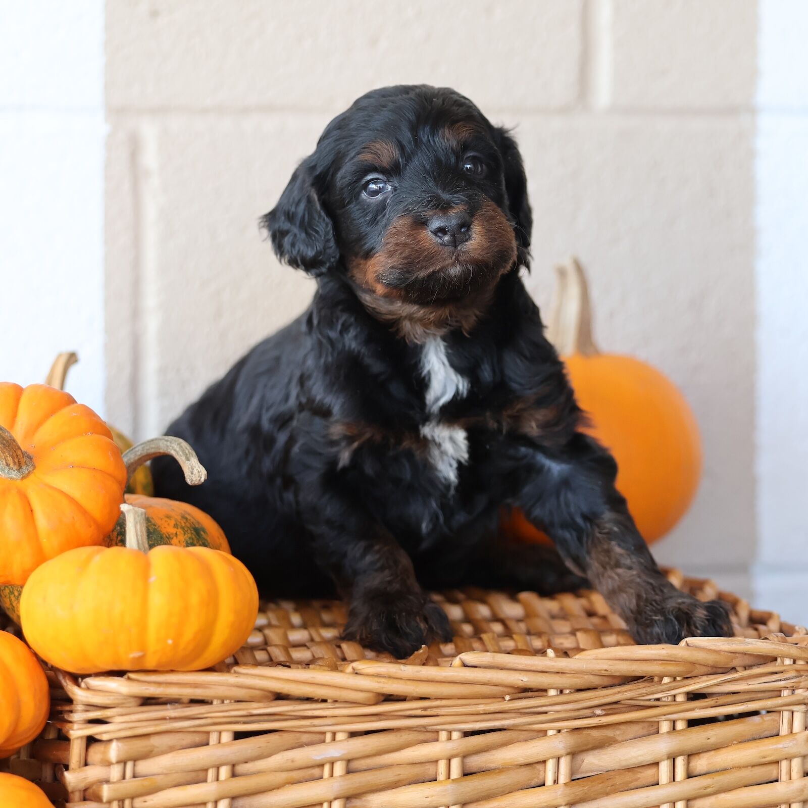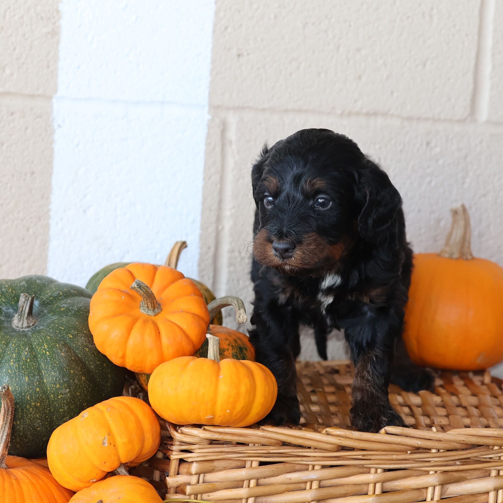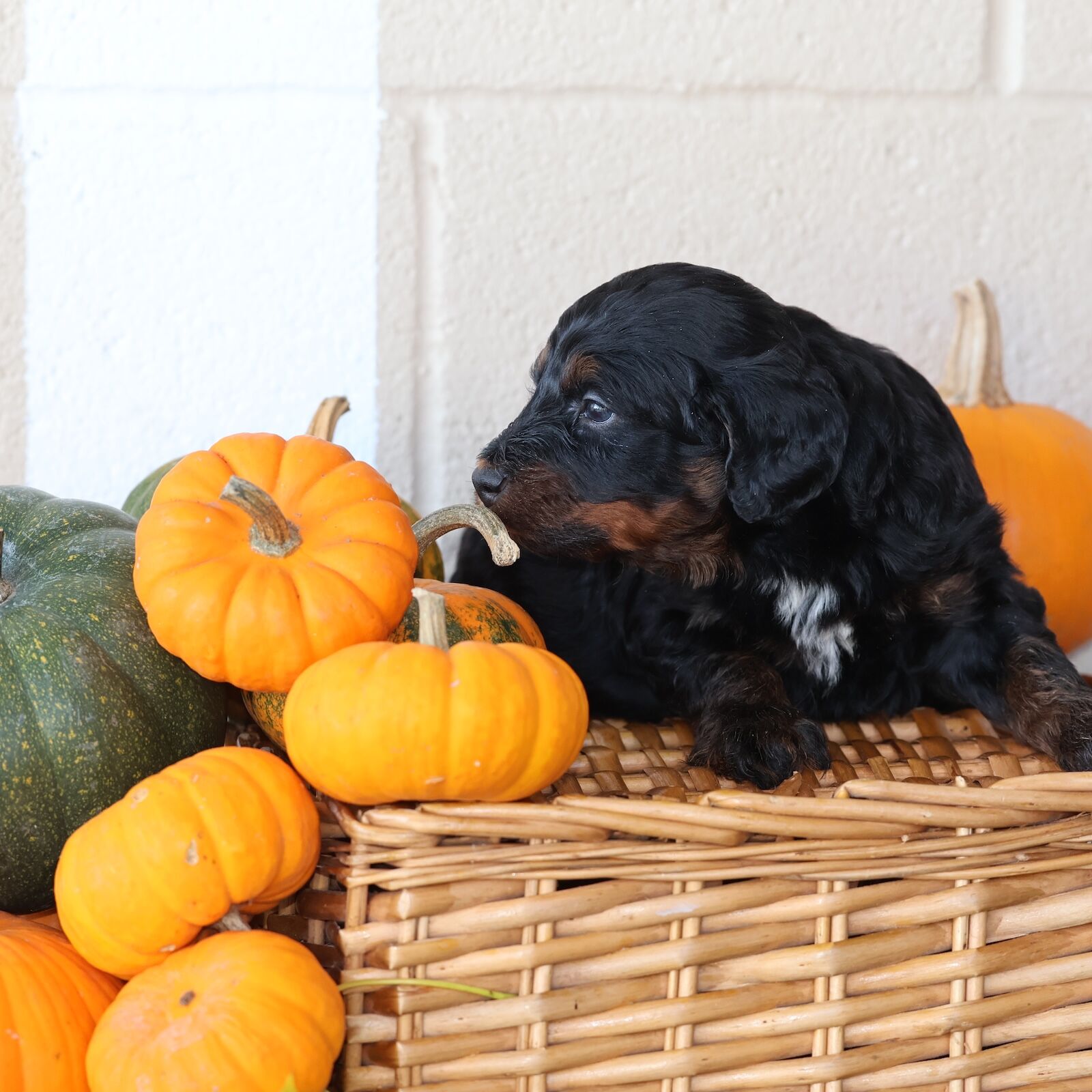 Tammy is a stunning F1 Bernedoodle mom whose charm is impossible to overlook. Her traditional black tri-color coat is a perfect blend of silky black, warm rust, and crisp white — a timeless Bernedoodle look that feels both classic and comforting. What makes Tammy truly stand out, though, is the texture of her coat. It’s beautifully curly yet incredibly soft to the touch, like a luxurious blanket that invites cuddles. Whether she’s trotting across the yard or lying in the sunshine, her curls bounce gently with every move, giving her an effortlessly elegant presence. Beyond her gorgeous appearance, Tammy has a personality that radiates pure joy. She’s a smiley girl through and through — always wearing a happy expression that makes everyone around her feel lighter. Whether she’s playing with her favorite toy, greeting visitors with enthusiasm, or simply lounging contentedly after a walk, her cheerful nature shines bright. She approaches everything she does with heart and a wagging tail, bringing warmth and laughter to every moment. Tammy’s gentle intelligence and affectionate spirit also make her an exceptional mom. She’s attentive, patient, and nurturing, always ensuring her puppies feel safe and loved. Her combination of beauty, kindness, and a joyful soul makes her a true treasure in every way. With her soft, curly coat and constant smile, Tammy embodies everything people adore about Bernedoodles — a perfect mix of elegance, sweetness, and genuine happiness.