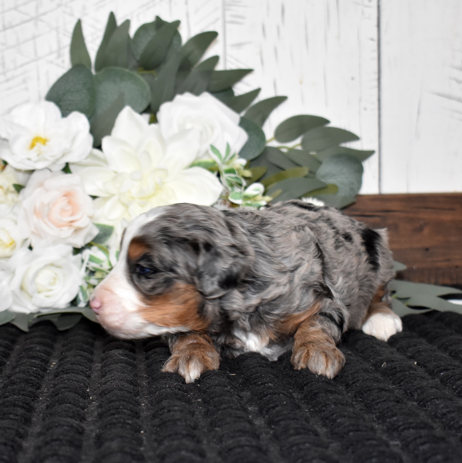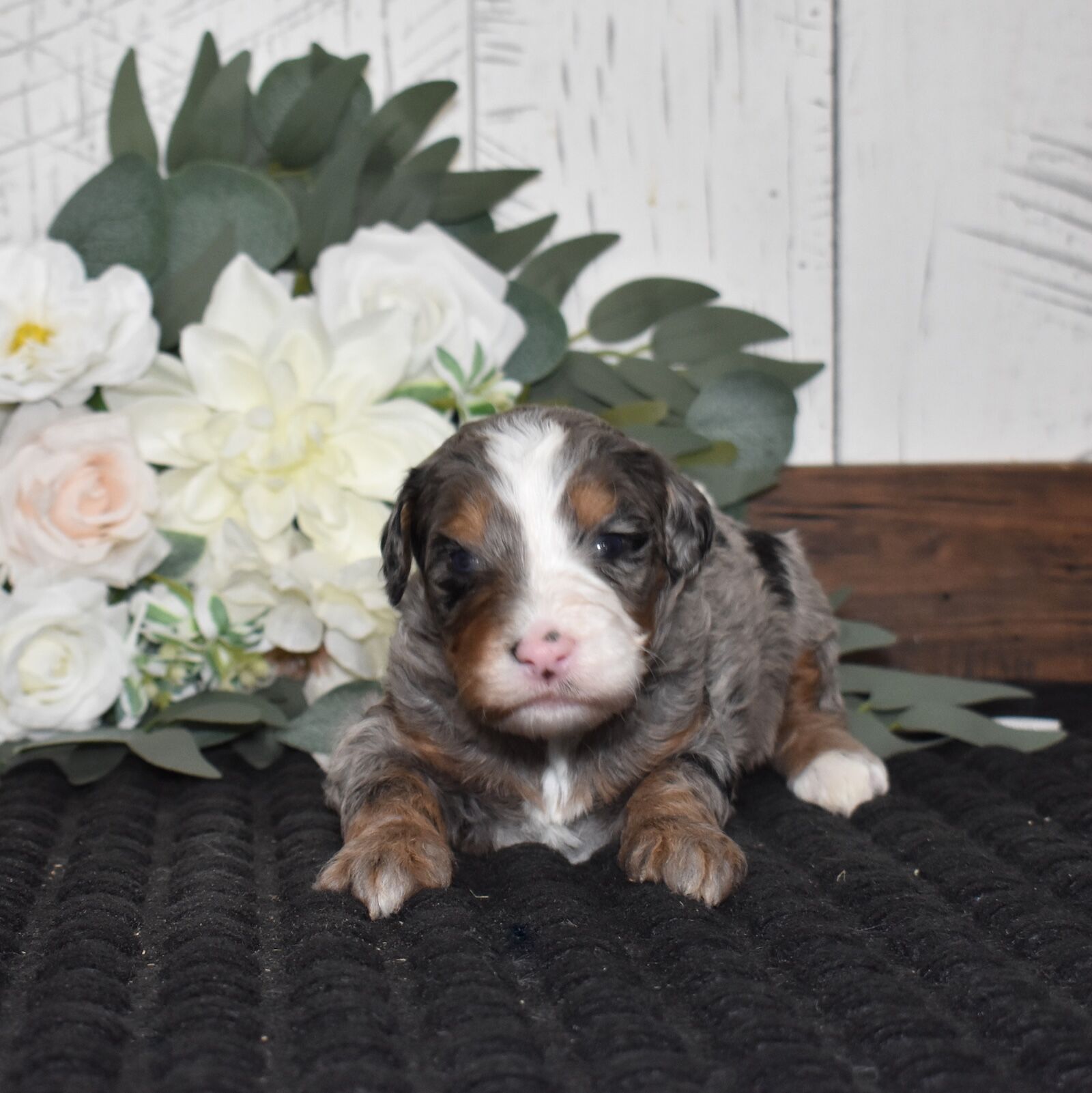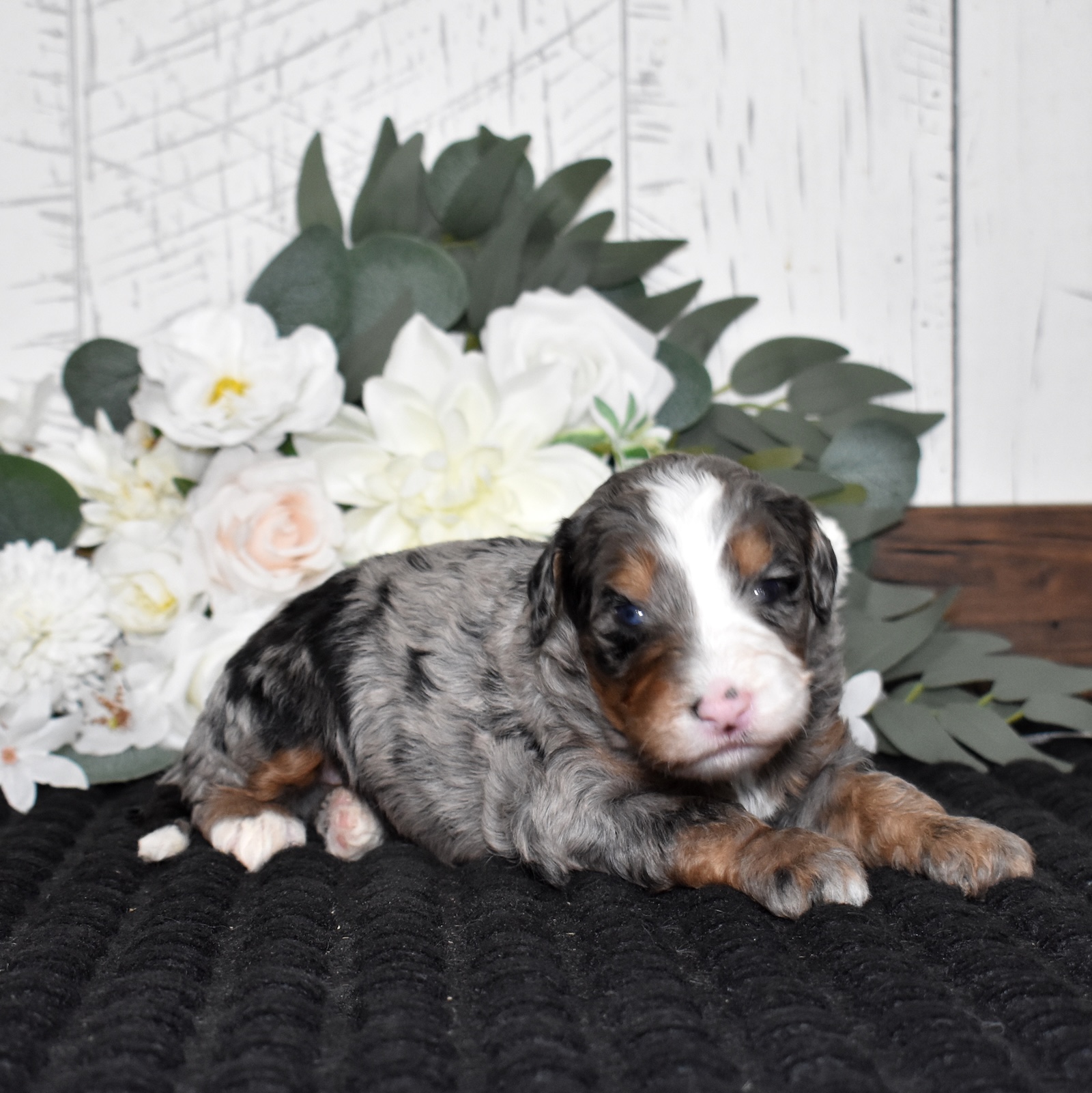 Panda is a beautiful Bernedoodle mom with a black tri color coat. She is a gentle and loving dog who is always happy to see her puppies. Panda is a great mom who takes good care of her puppies. She is always there to feed them, clean them, and play with them. Panda is a great example of a loving and caring mother. Panda is a very intelligent dog. She is quick to learn new things and is always eager to please. Panda is a great companion and is always happy to go for walks or play in the yard. Panda is a very healthy dog. She has been genetically tested and is clear of all common Bernedoodle health problems.