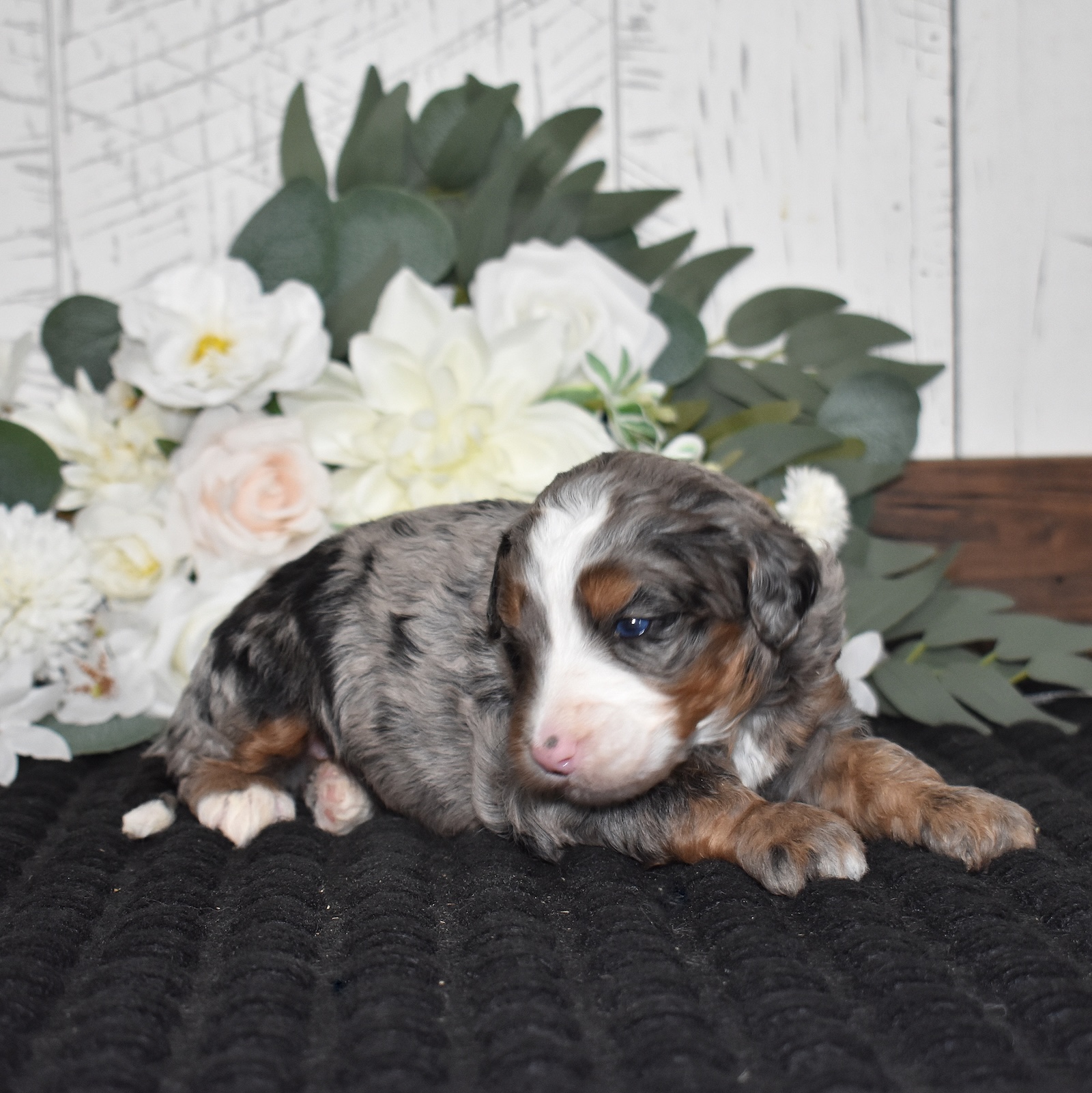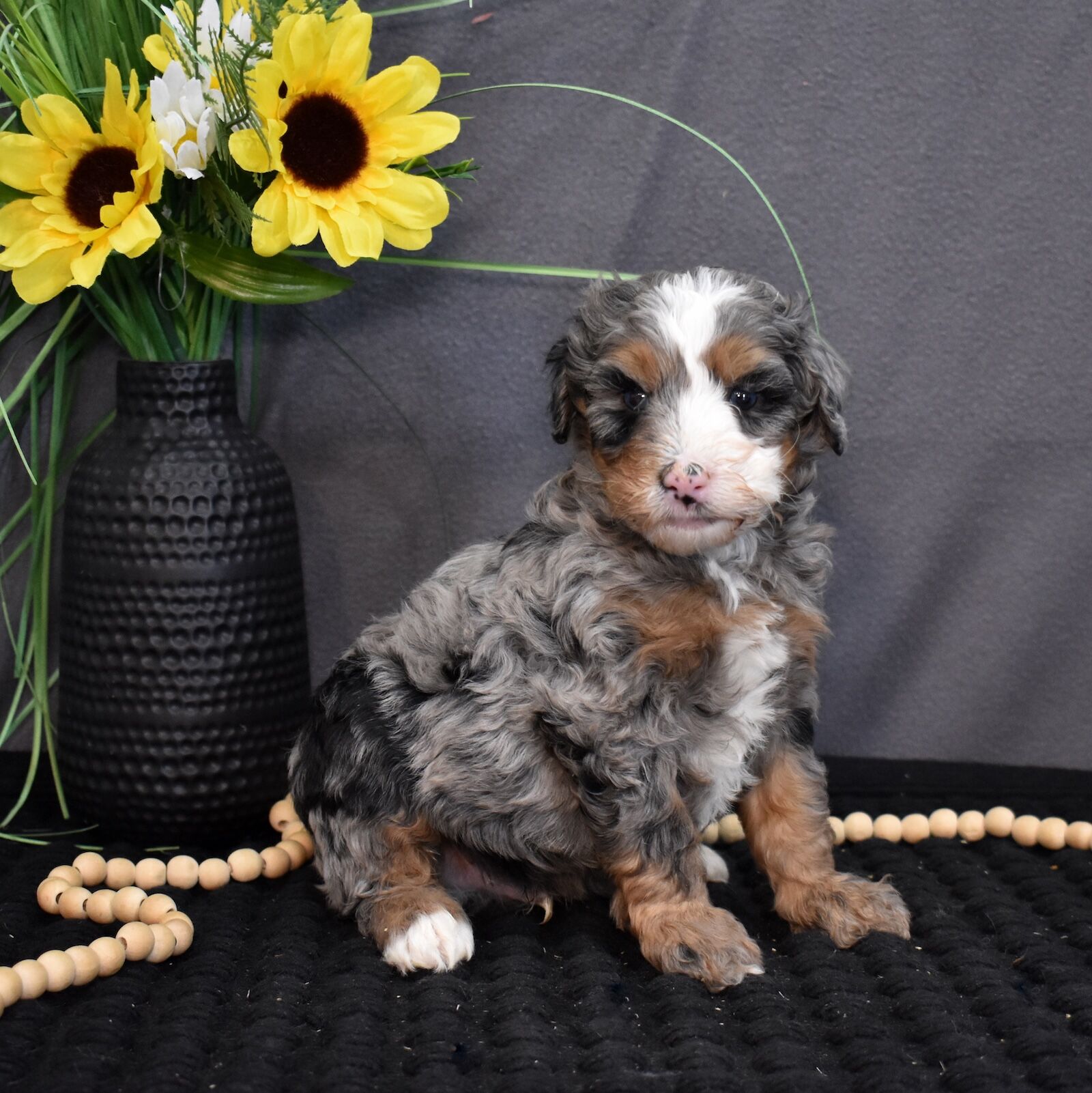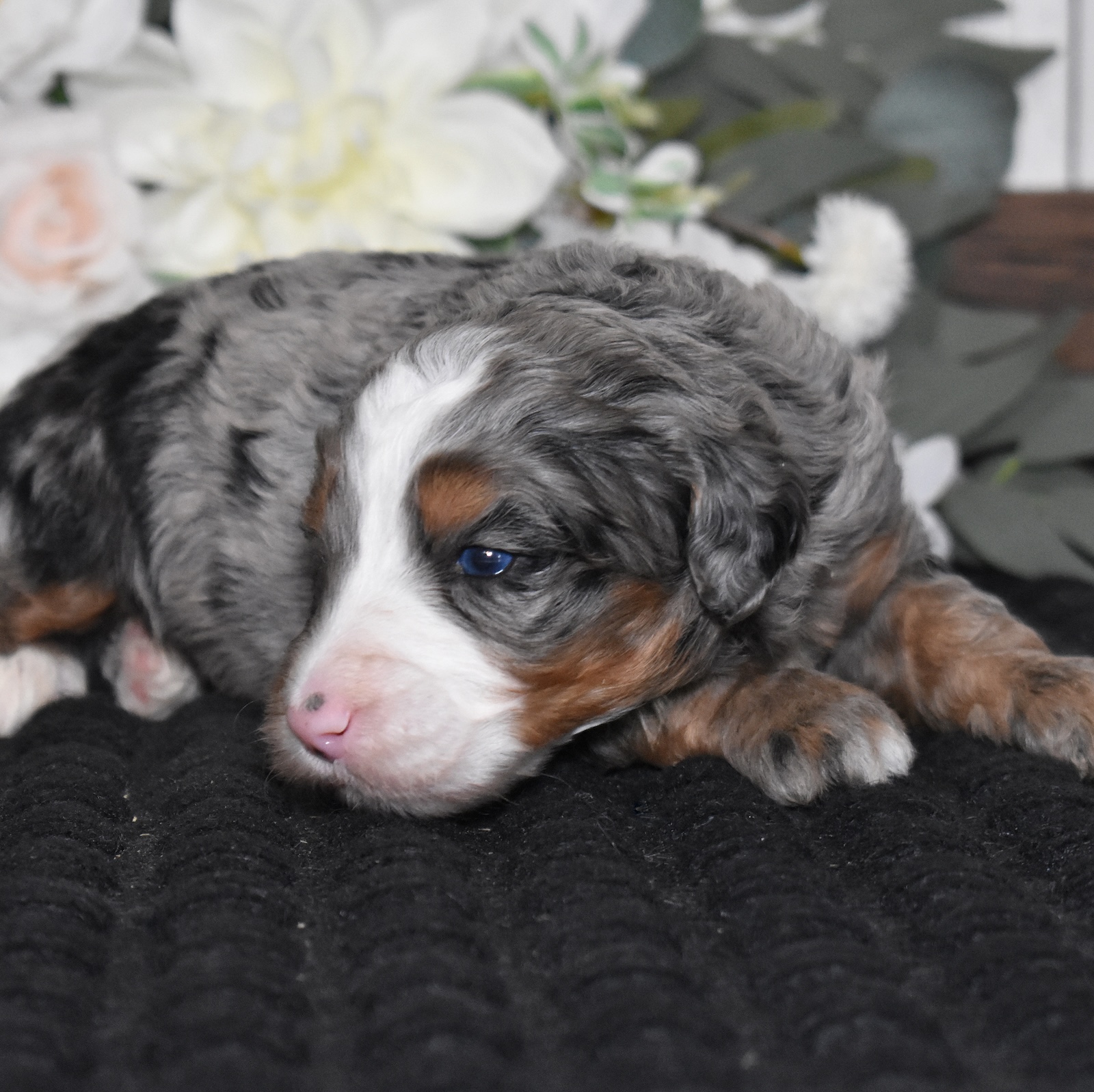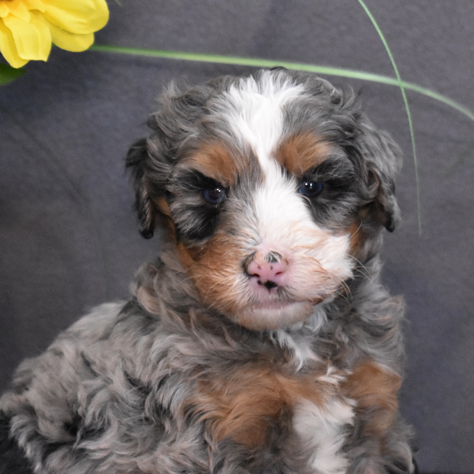 Meet Mr. Blue, the Bernedoodle dad with a coat dreams are made of! His dreamy merle curly coat shimmers with unique shades of silver, slate, and charcoal, each curl a testament to his stunning genetics. Beyond his captivating looks, Mr. Blue is pure joy. He approaches every day with an infectious enthusiasm, his tail wagging a happy rhythm. Whether he’s romping in the park, enjoying a cuddle, or just observing the world with a gentle gaze, his joy for life is undeniable. He’s a magnificent boy, inside and out.