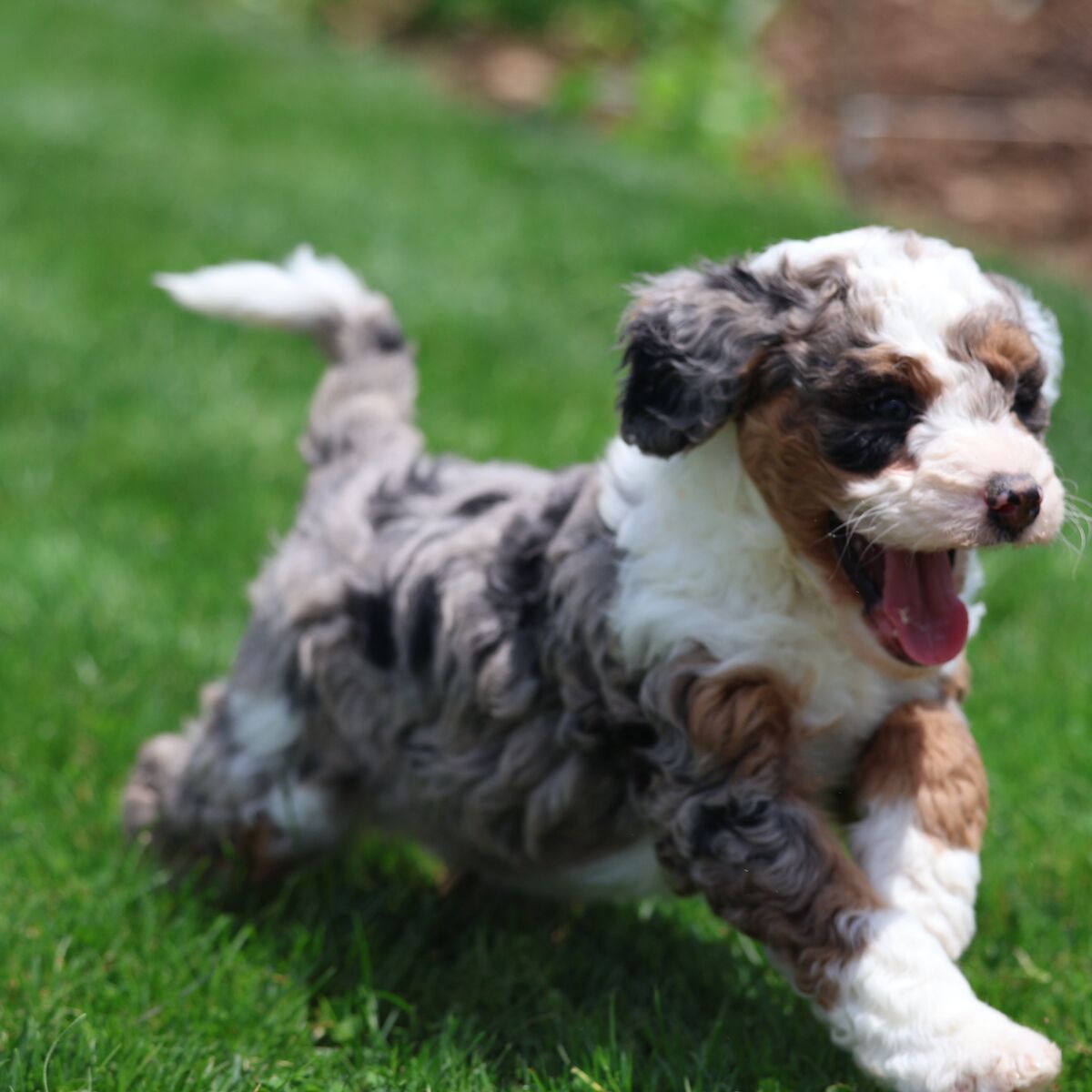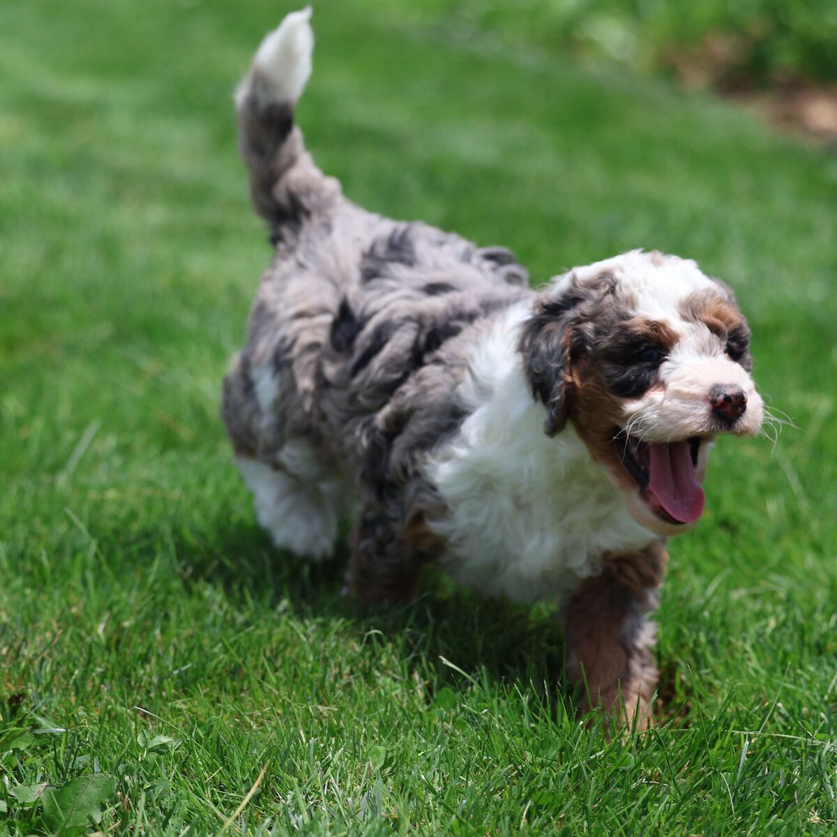 Meet Mr. Blue, the Bernedoodle dad with a coat dreams are made of! His dreamy merle curly coat shimmers with unique shades of silver, slate, and charcoal, each curl a testament to his stunning genetics. Beyond his captivating looks, Mr. Blue is pure joy. He approaches every day with an infectious enthusiasm, his tail wagging a happy rhythm. Whether he’s romping in the park, enjoying a cuddle, or just observing the world with a gentle gaze, his joy for life is undeniable. He’s a magnificent boy, inside and out.
