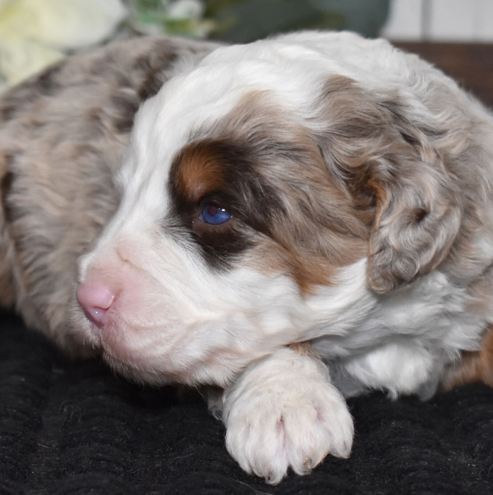Meet Mr. Blue, the Bernedoodle dad with a coat dreams are made of! His dreamy merle curly coat shimmers with unique shades of silver, slate, and charcoal, each curl a testament to his stunning genetics. Beyond his captivating looks, Mr. Blue is pure joy. He approaches every day with an infectious enthusiasm, his tail wagging a happy rhythm. Whether he’s romping in the park, enjoying a cuddle, or just observing the world with a gentle gaze, his joy for life is undeniable. He’s a magnificent boy, inside and out.
