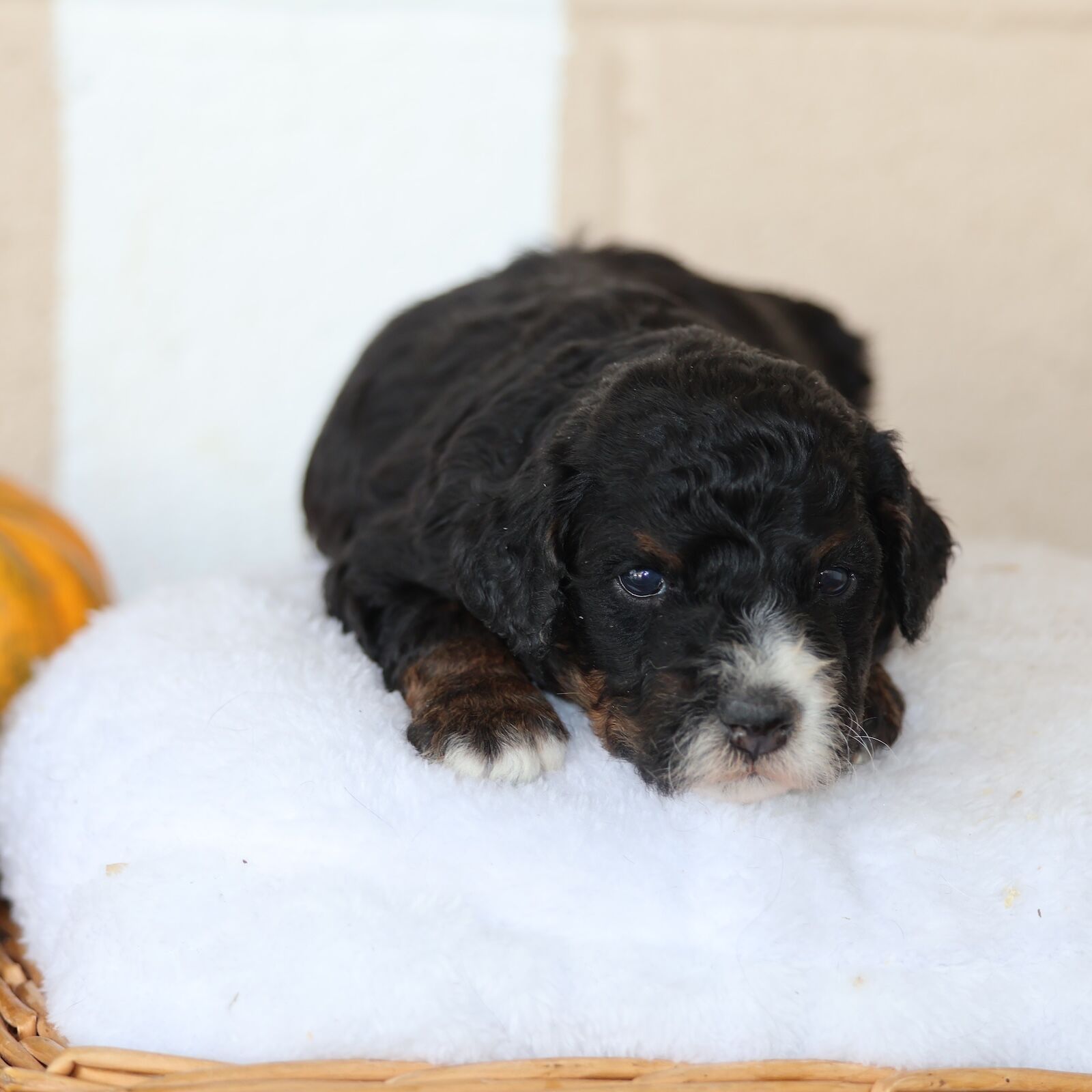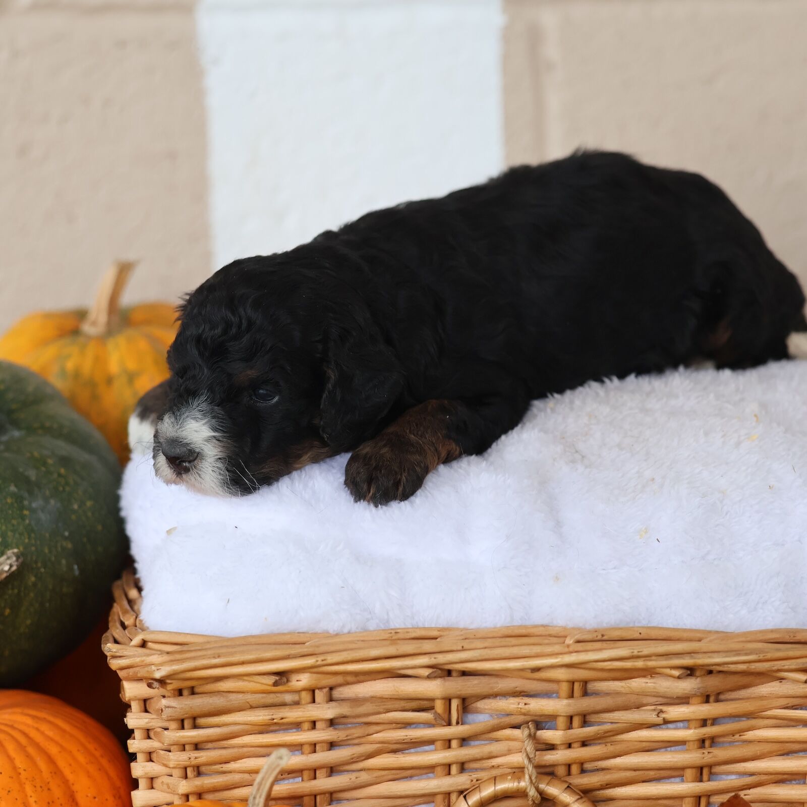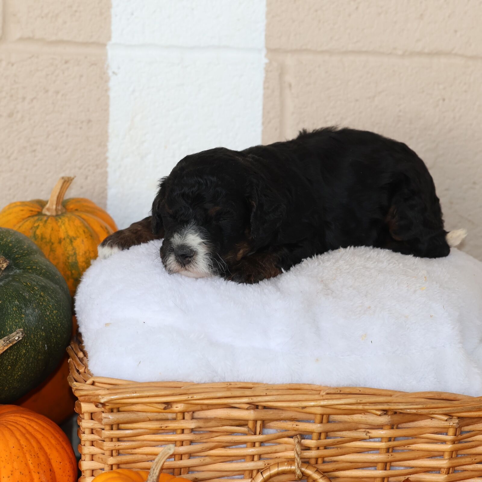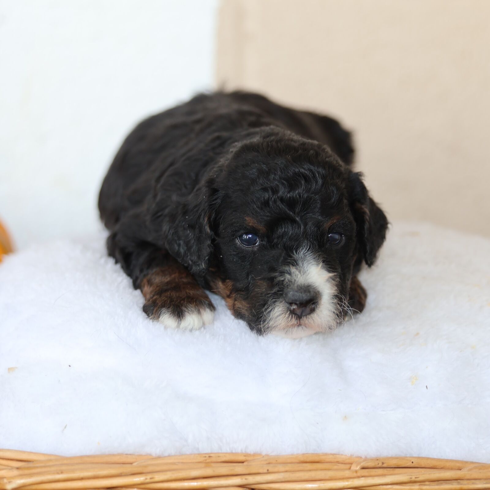Sasha is a radiant F1B Bernedoodle mom whose joyful personality shines as brightly as her beautiful, curly coat. With her plush, soft curls cascading like waves of warmth, she’s the perfect picture of elegance and cheer. Her coat isn’t just stunning—it’s also wonderfully low-shedding, making her an ideal example of the Bernedoodle’s signature hypoallergenic charm. Every moment with Sasha is filled with happiness. She greets each day with a wagging tail and bright, expressive eyes that seem to smile back at you. Whether she’s trotting alongside you on a walk or curling up for quiet snuggles, Sasha’s sweet, affectionate nature never fails to brighten the mood. She has an intuitive sense of connection, knowing exactly when to play and when to rest her head gently in your lap. As a devoted mom, Sasha’s nurturing side truly shines. She brings that same warmth and joyful spirit to her puppies, caring for them with patience and love. Her kind heart, intelligence, and playful energy are everything people adore about Bernedoodles. Sasha is more than a dog—she’s a daily reminder of joy, comfort, and the simple beauty found in companionship.