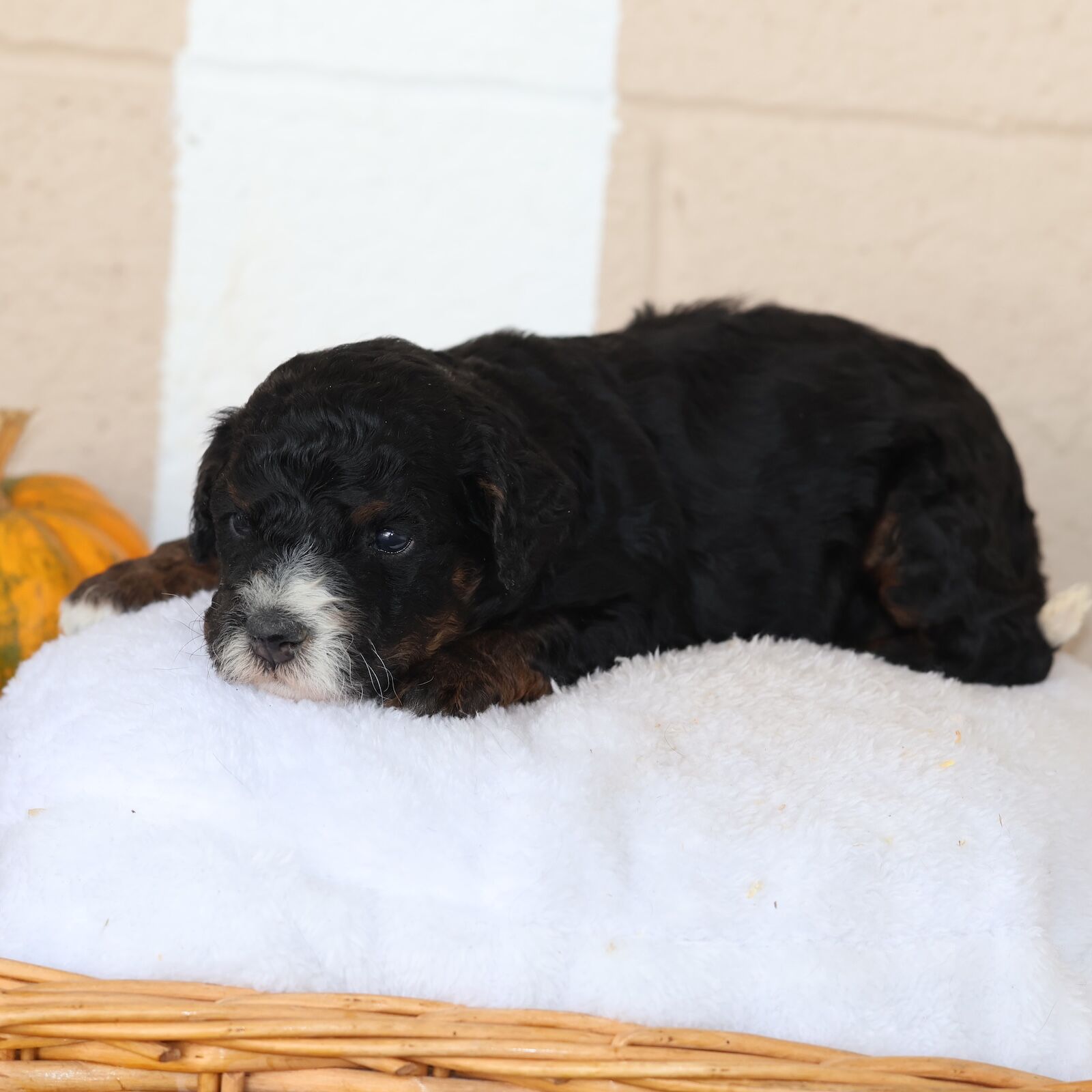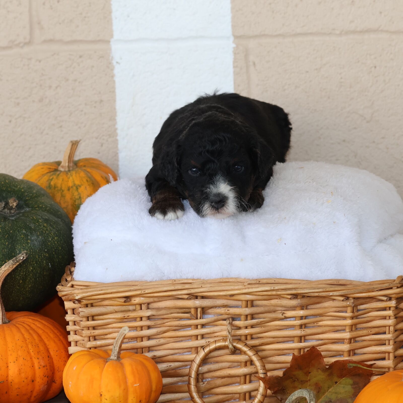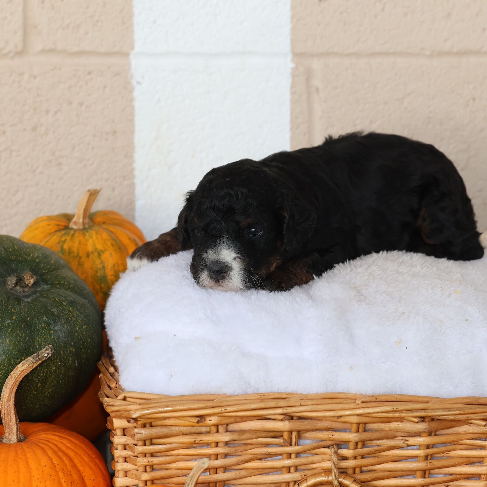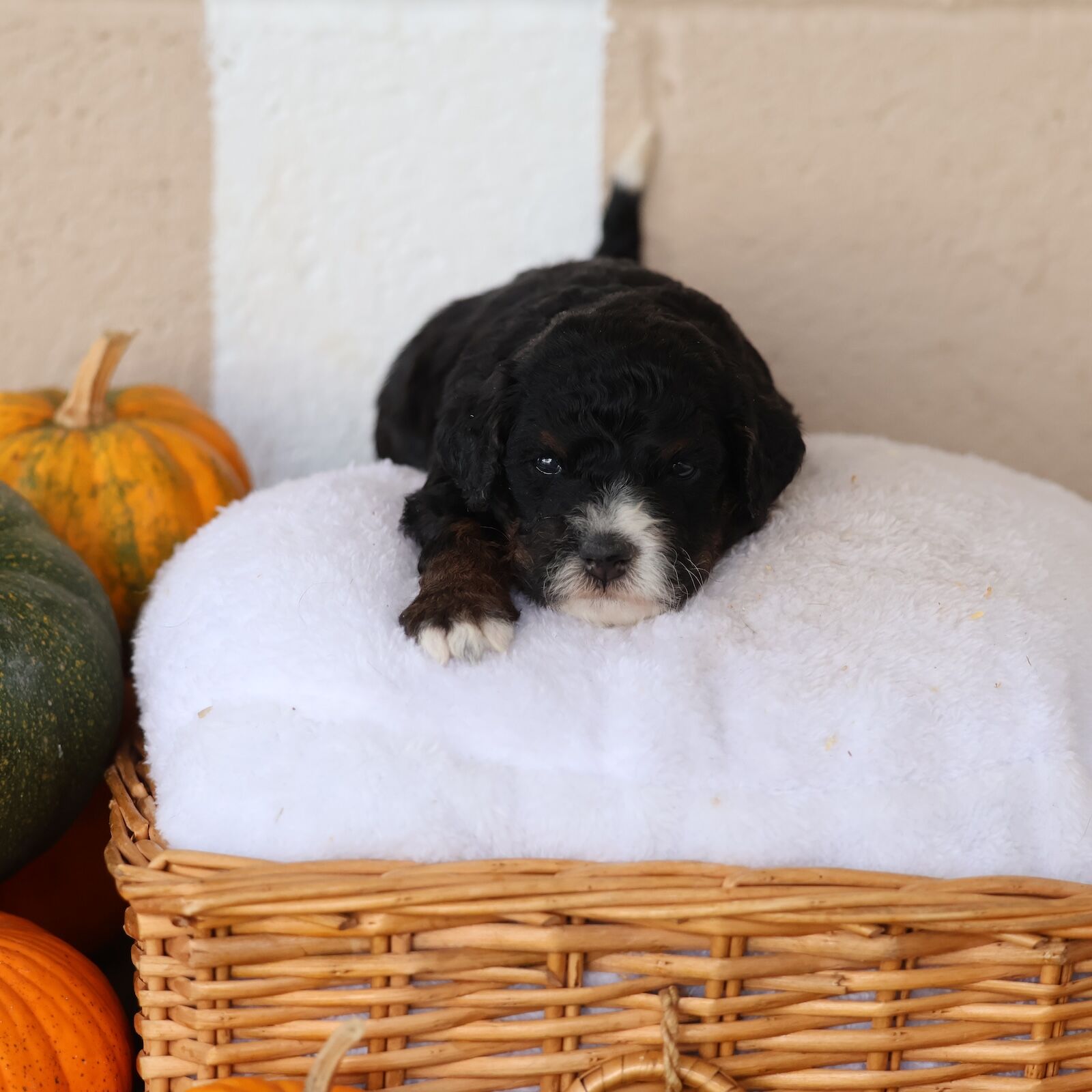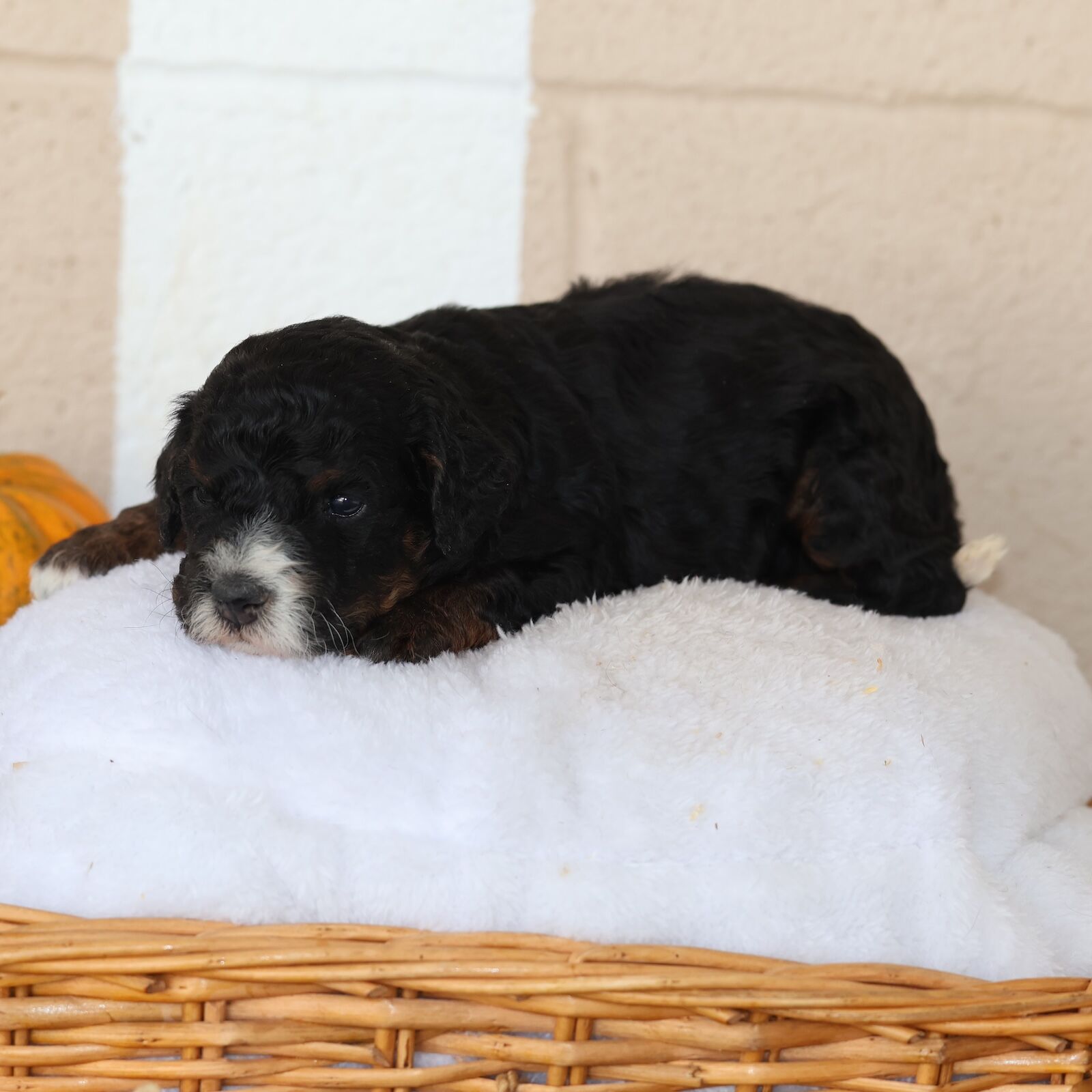 Sasha is a radiant F1B Bernedoodle mom whose joyful personality shines as brightly as her beautiful, curly coat. With her plush, soft curls cascading like waves of warmth, she’s the perfect picture of elegance and cheer. Her coat isn’t just stunning—it’s also wonderfully low-shedding, making her an ideal example of the Bernedoodle’s signature hypoallergenic charm. Every moment with Sasha is filled with happiness. She greets each day with a wagging tail and bright, expressive eyes that seem to smile back at you. Whether she’s trotting alongside you on a walk or curling up for quiet snuggles, Sasha’s sweet, affectionate nature never fails to brighten the mood. She has an intuitive sense of connection, knowing exactly when to play and when to rest her head gently in your lap. As a devoted mom, Sasha’s nurturing side truly shines. She brings that same warmth and joyful spirit to her puppies, caring for them with patience and love. Her kind heart, intelligence, and playful energy are everything people adore about Bernedoodles. Sasha is more than a dog—she’s a daily reminder of joy, comfort, and the simple beauty found in companionship.