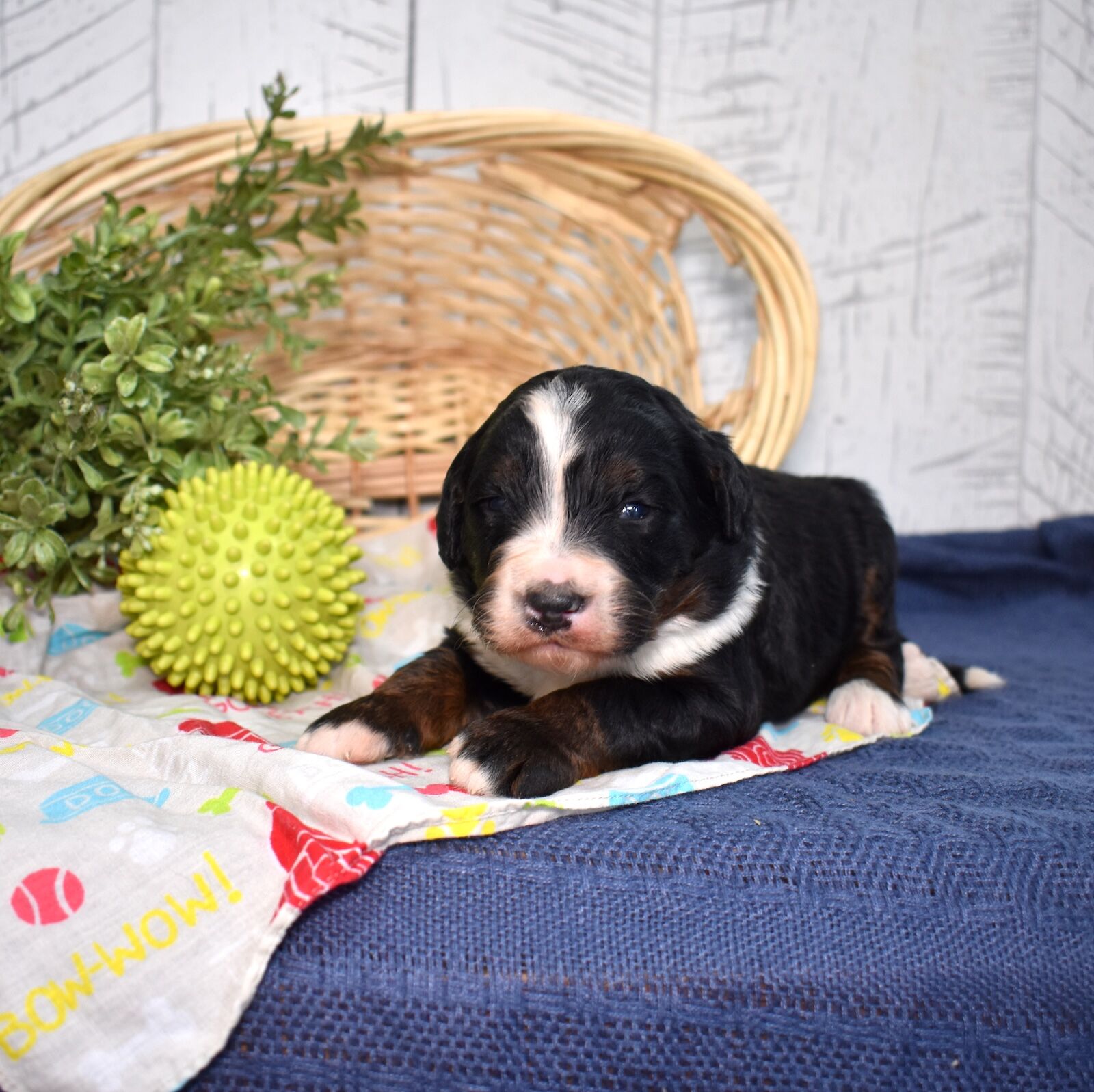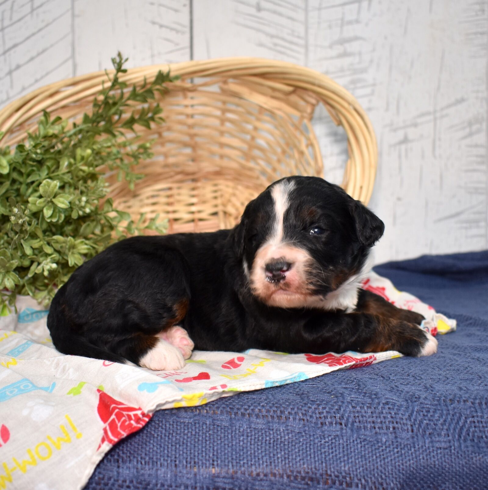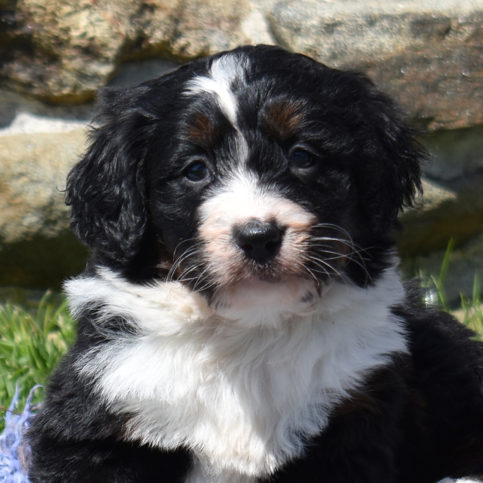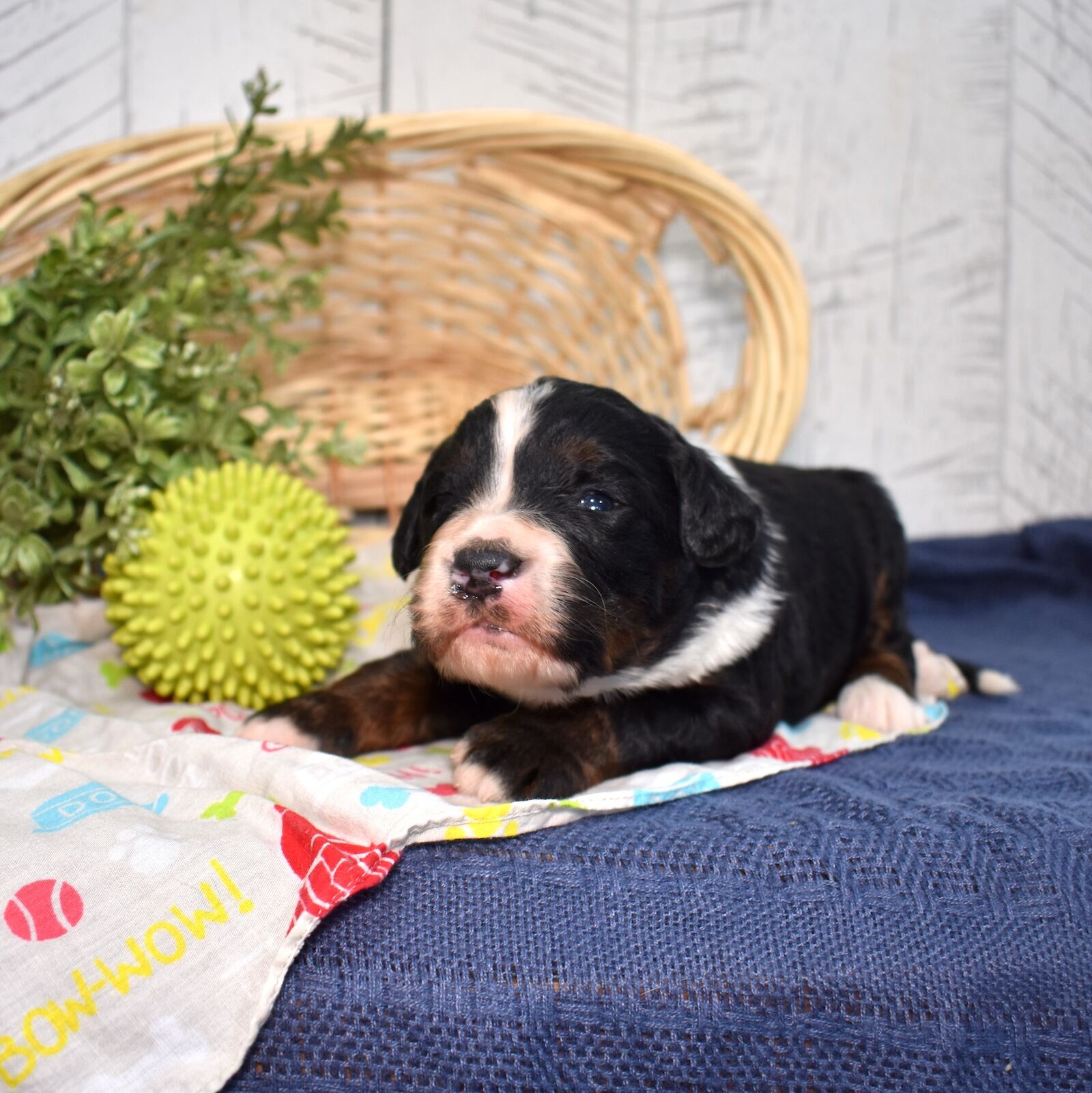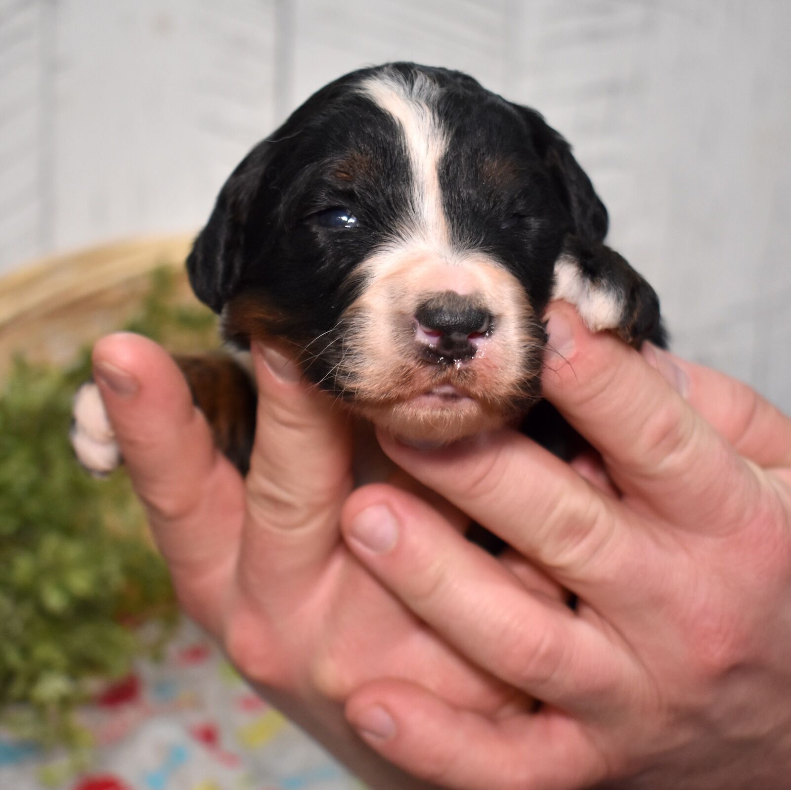 Jane is grace and joy wrapped in the most beautiful black tri color coat and she has already captured every heart in our program. This stunning F1 Standard Bernedoodle has those rich classic markings that are timeless and an incredibly gentle calm energy that makes her an absolute pleasure to be around. Her mom Jody is a 115 pound genetic tested Bernese mountain dog whose happy go lucky spirit and loving nature light up everything around her and her dad Andes a 55 pound genetic tested merle standard poodle whose royal composed confidence balances the litter beautifully. Jane is the kind of puppy you watch quietly and just know she is going to grow into something truly extraordinary. We are so excited to see the personality this sweet girl is stepping into.