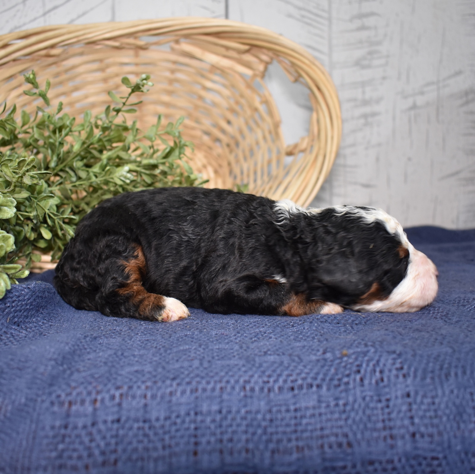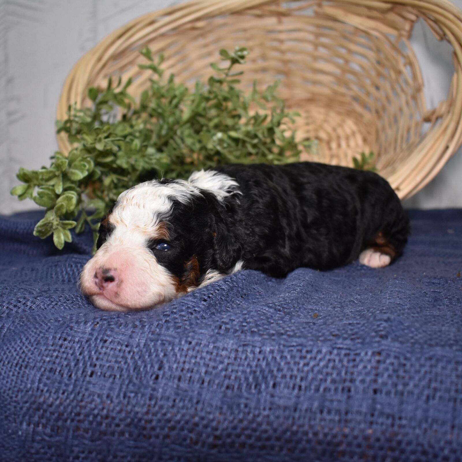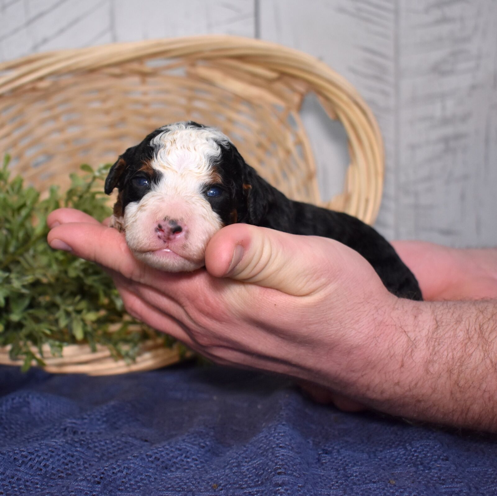 Chloe is a gorgeous tri color female with a soft, curly coat and a gentle, sweet demeanor. If you are searching for an f1b mini bernedoodle for sale, Chloe is a wonderful example of this pairing. We are excited to watch her personality grow as she matures. Her mom Cuddles is a 30-pound, happy-to-please companion, and dad Mr. Blue is a 40-pound calm and thoughtful observer—both genetically tested. Chloe will have a curlier, allergy-friendly coat from her 55% Poodle and 45% Bernese background.