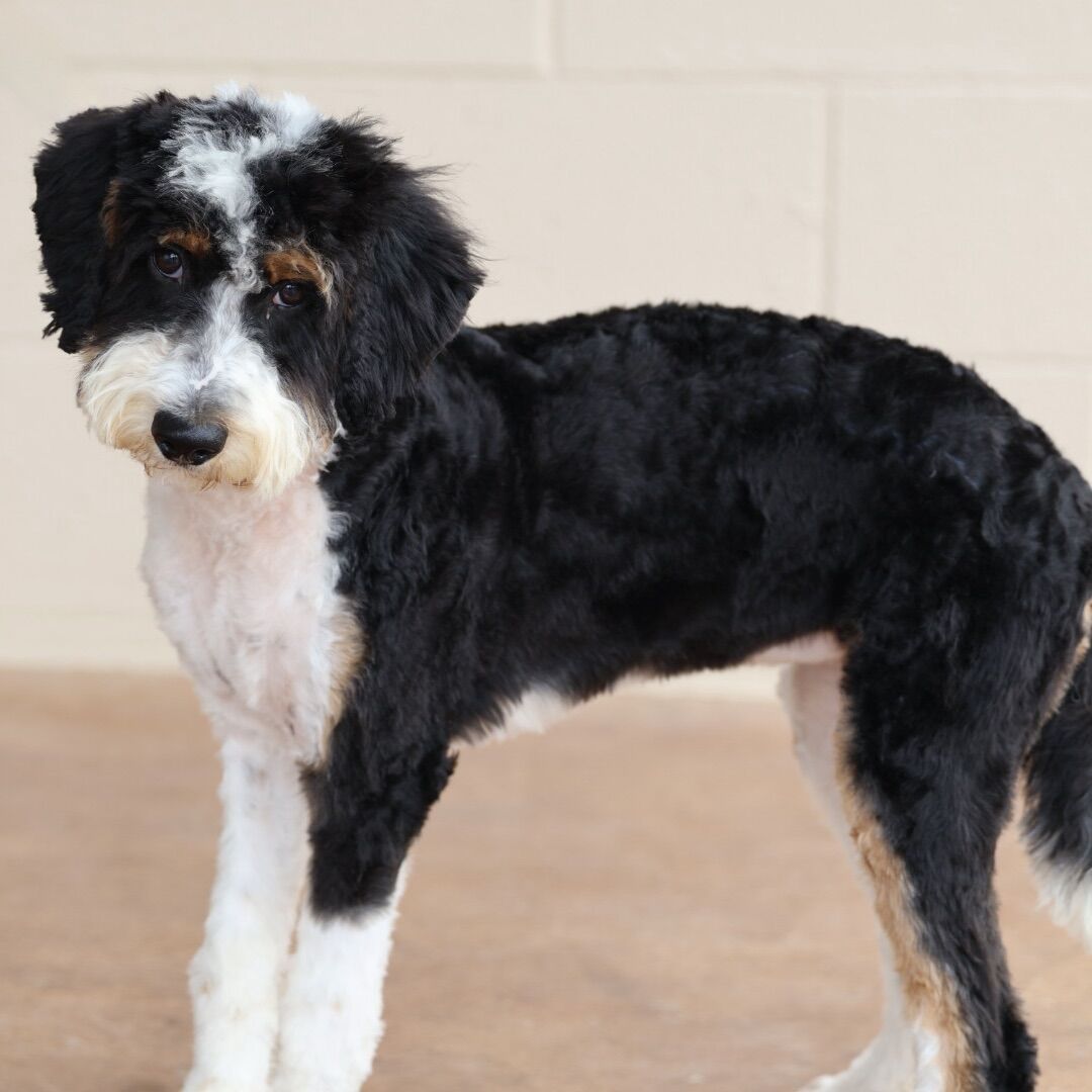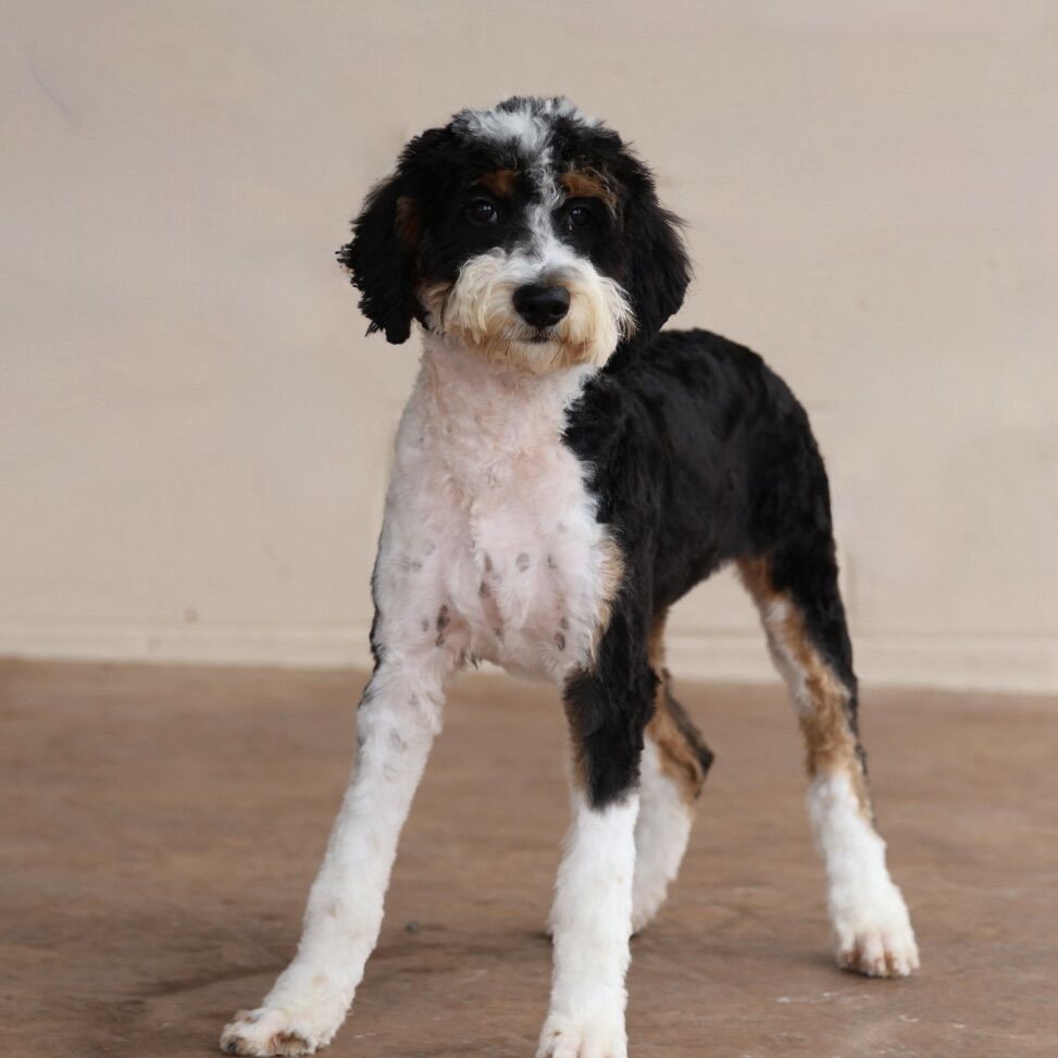 Kye is an absolute charmer! He is one of our Bernedoodle puppies with striking markings. His tender nature makes him a lovable companion, while his energetic spirit keeps him always on the go. As a young male, Kye is full of curiosity and excitement, eager to explore the world around him.