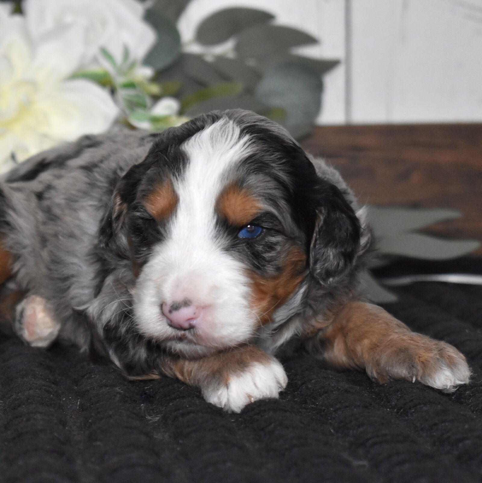 Panda is a beautiful Bernedoodle mom with a black tri color coat. She is a gentle and loving dog who is always happy to see her puppies. Panda is a great mom who takes good care of her puppies. She is always there to feed them, clean them, and play with them. Panda is a great example of a loving and caring mother. Panda is a very intelligent dog. She is quick to learn new things and is always eager to please. Panda is a great companion and is always happy to go for walks or play in the yard. Panda is a very healthy dog. She has been genetically tested and is clear of all common Bernedoodle health problems.