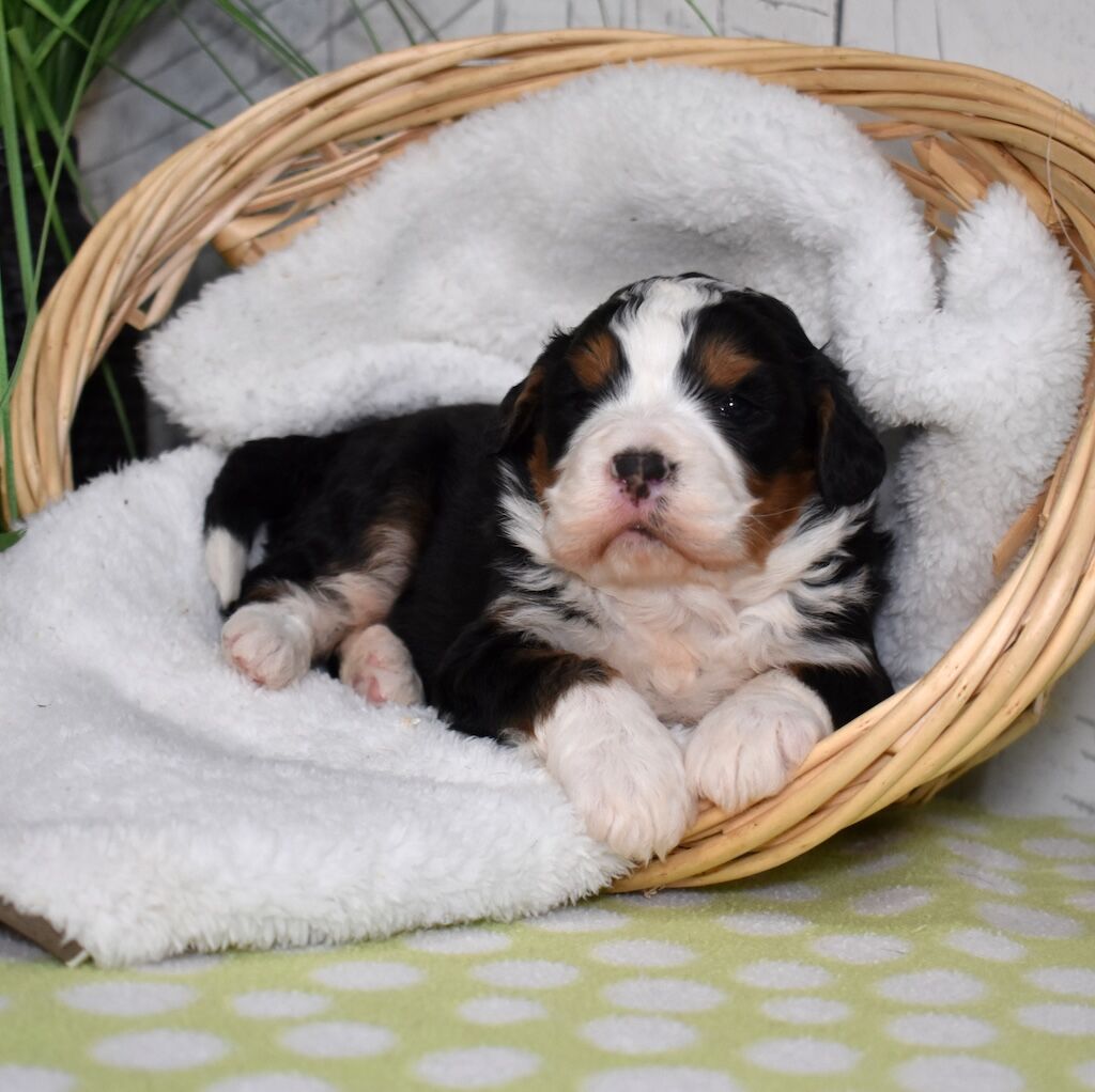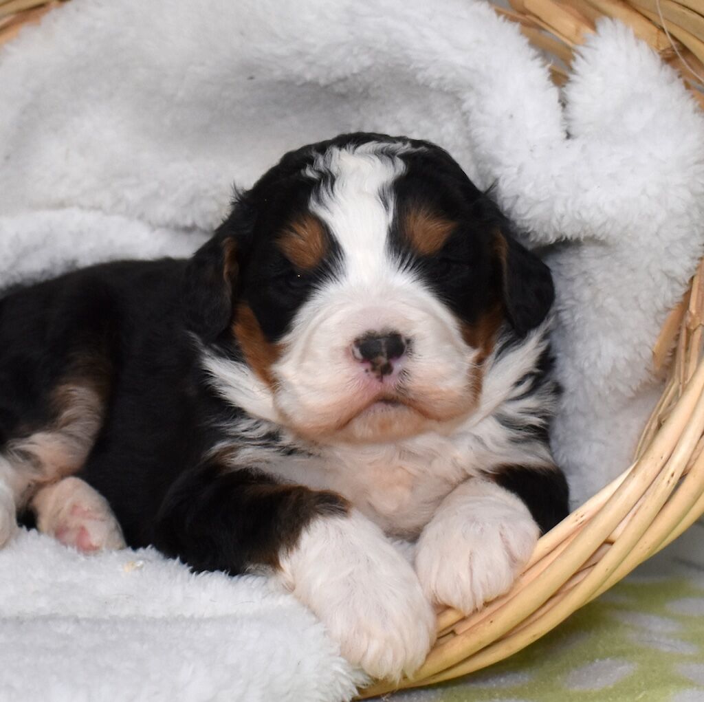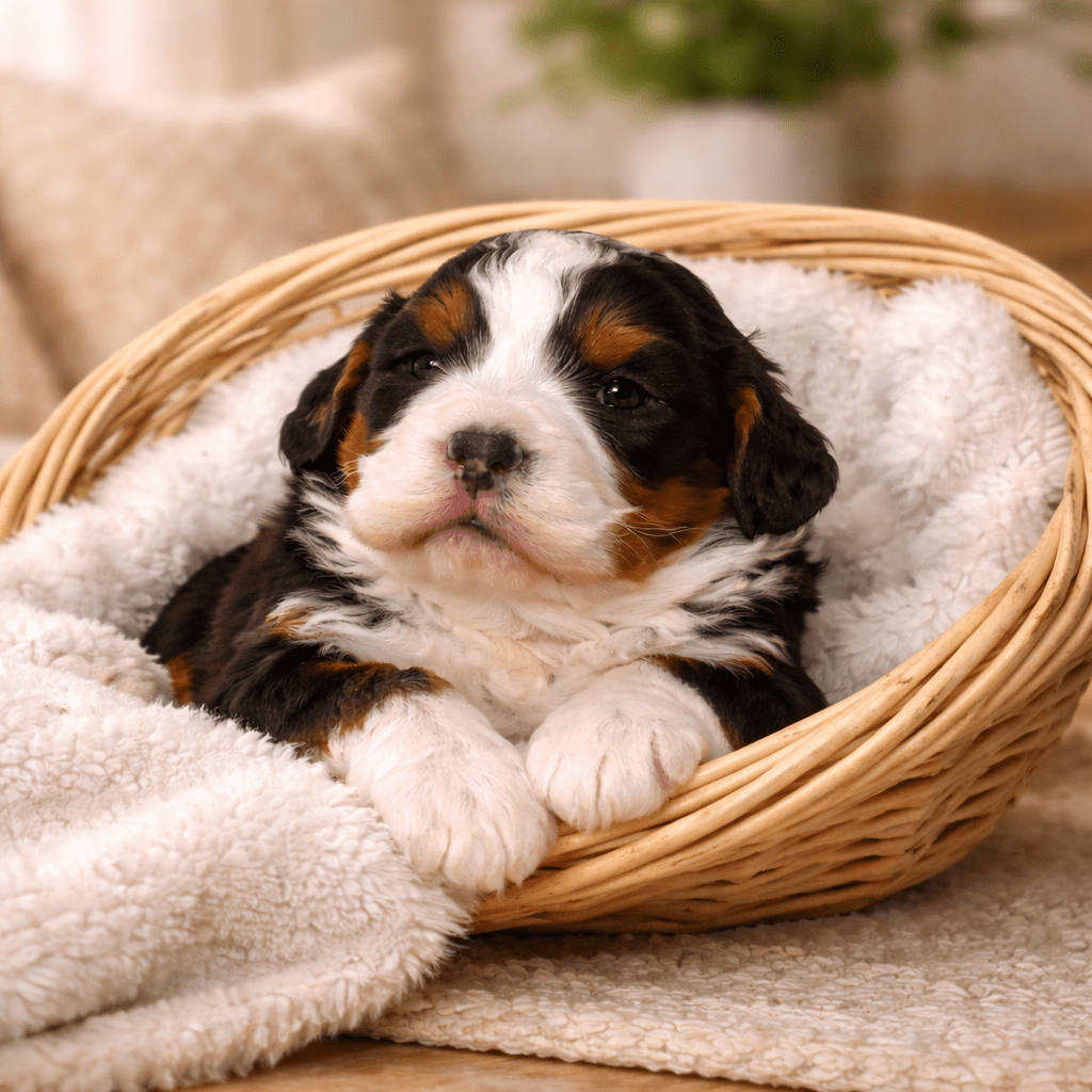 Oakley is a stunning Bernese Mountain Dog with the kind of gentle spirit the breed is famous for. She has a beautiful, well-balanced build, rich tri-color markings, and a calm, expressive face that instantly puts everyone at ease. Oakley is incredibly affectionate and thrives on being close to her people. Whether she’s lounging nearby, following you from room to room, or soaking up belly rubs, she loves being part of the family. True to her Bernese nature, Oakley is patient, nurturing, and exceptionally sweet. She has a steady temperament that makes her wonderful with children and other animals, and she approaches new situations with confidence and grace. Oakley is intelligent and eager to please, which makes her easy to work with and a joy to have around. As a mother, Oakley is attentive and loving, instinctively caring for her puppies with gentleness and devotion. Her calm demeanor and affectionate personality shine through in her babies, giving them a strong foundation for becoming loyal, family-friendly companions. Oakley truly represents the heart of the Bernese Mountain Dog—loving, dependable, and endlessly gentle.