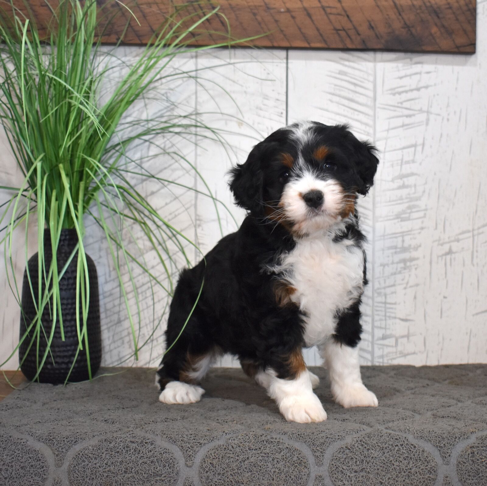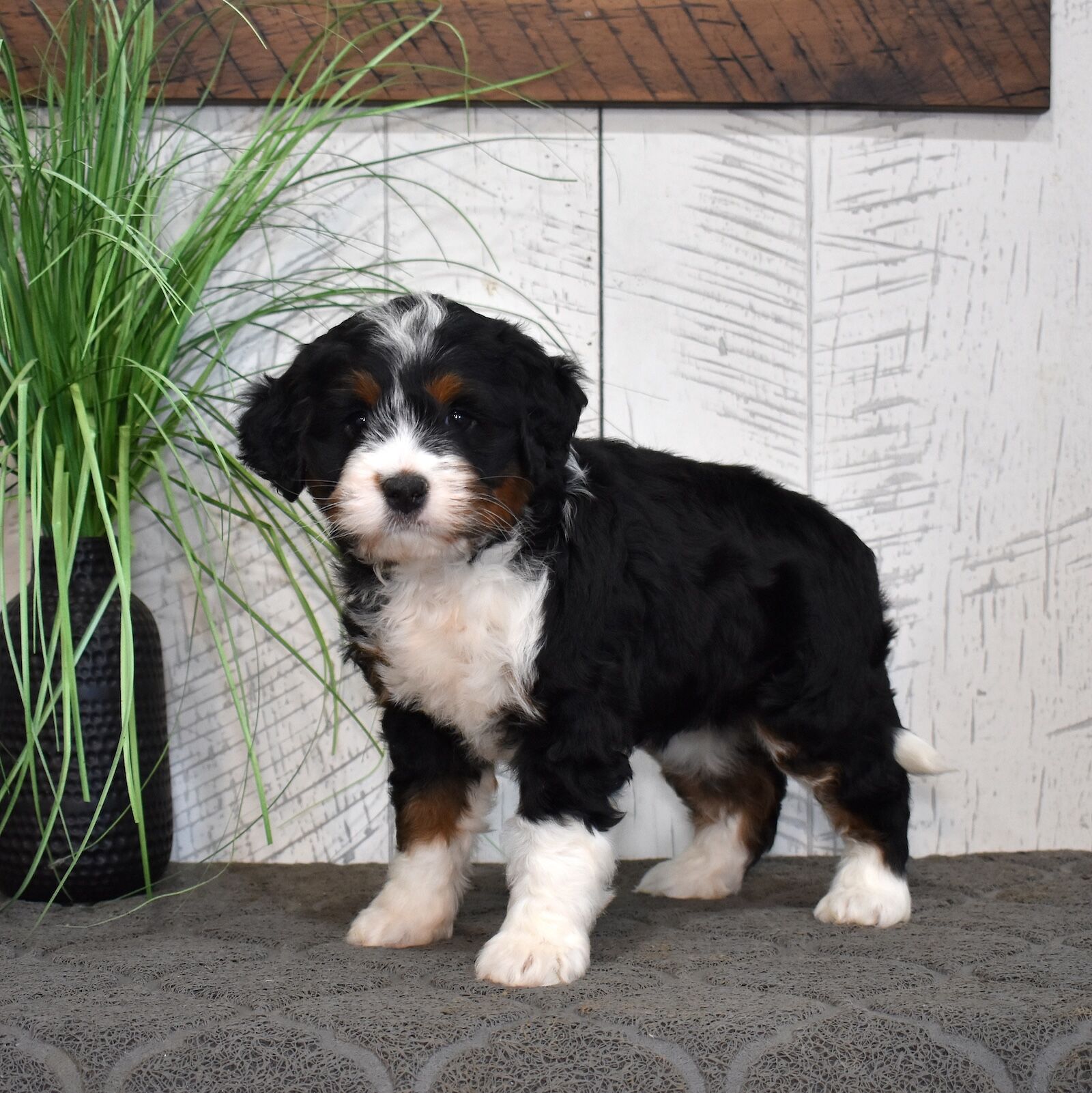 Tully is one of a kind — quite literally. As the sole puppy of her litter, she has had something truly rare from the very beginning: undivided attention, undivided care, and a start in life that most puppies simply don’t get. Her black tri color coat is rich and beautifully marked, with that classic contrast of deep black, warm tan, and soft white that makes tri color Bernedoodles so deeply beloved. As a medium sized female, Tully sits in a wonderful size range — present and substantial without being too large, perfectly suited for a wide range of homes and lifestyles. Her wavy coat gives her a softer, more relaxed texture than her curlier littermates — flowing and silky with a gentle wave that is beautiful in its own right and still wonderfully easy to manage. Being the only pup of her litter means Tully has had every advantage from day one — all the warmth, all the socialization, all the care focused entirely on her. She is a puppy who has never had to compete for a lap, a hand, or a moment of connection. That kind of start produces something special, and it shows. Tully is ready to bring that same singular devotion to the family lucky enough to bring her home.