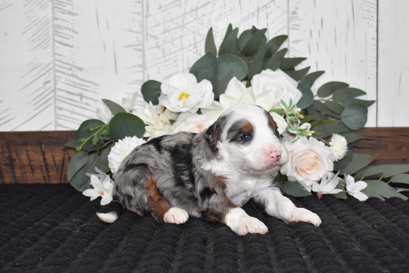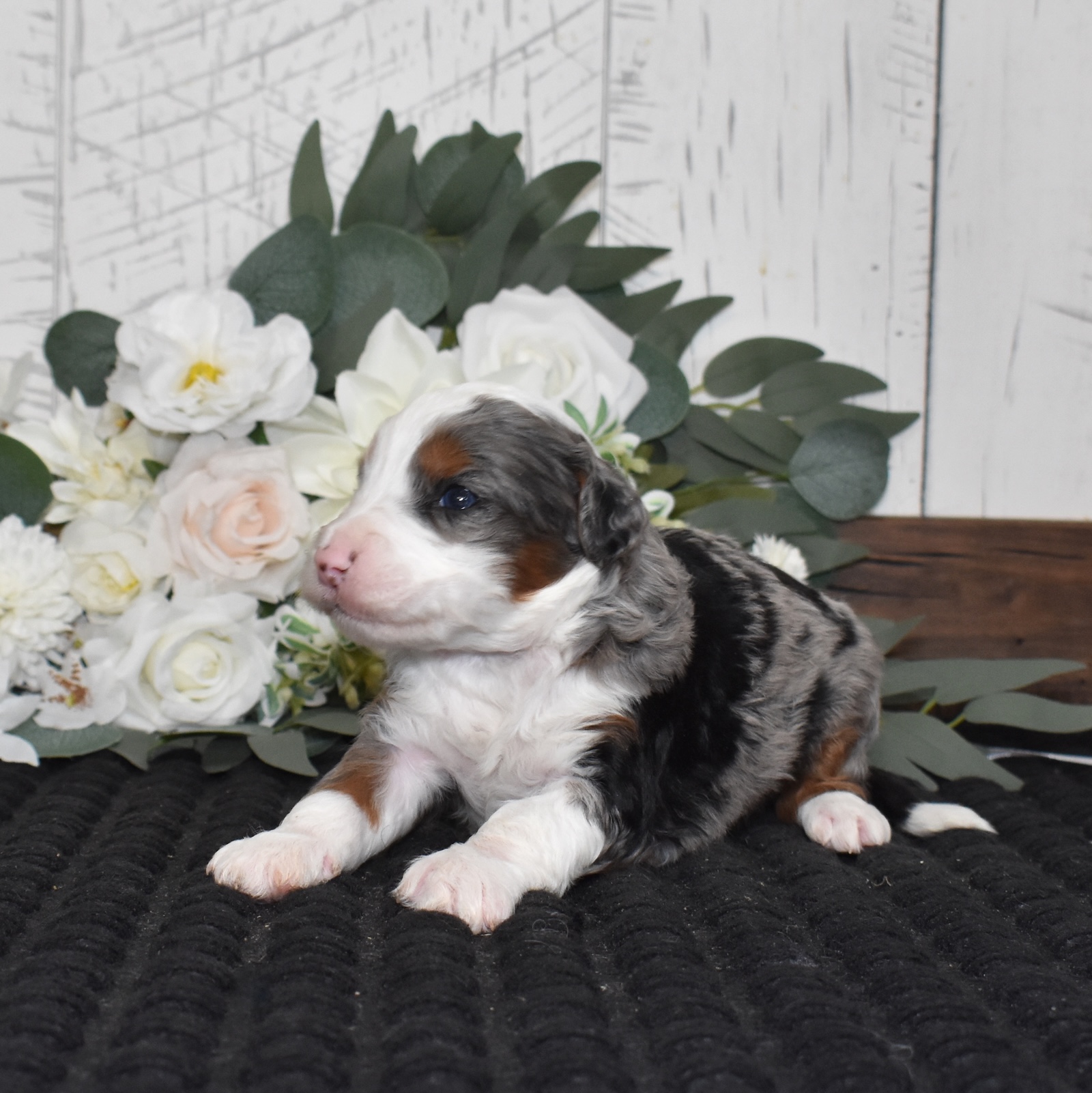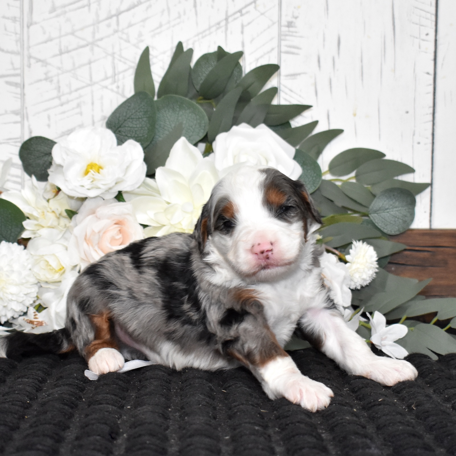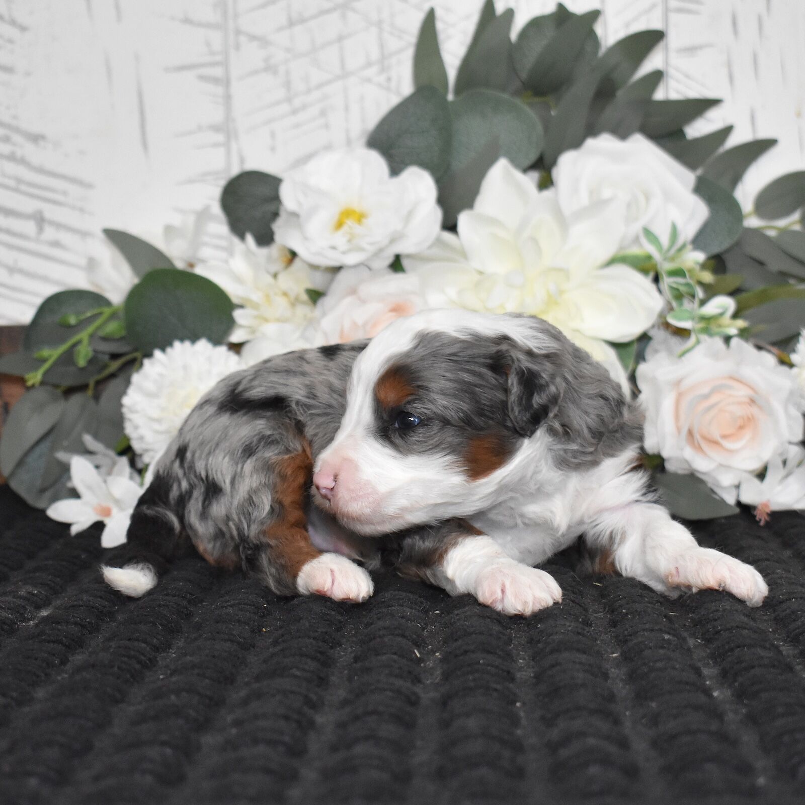 Panda is a beautiful Bernedoodle mom with a black tri color coat. She is a gentle and loving dog who is always happy to see her puppies. Panda is a great mom who takes good care of her puppies. She is always there to feed them, clean them, and play with them. Panda is a great example of a loving and caring mother. Panda is a very intelligent dog. She is quick to learn new things and is always eager to please. Panda is a great companion and is always happy to go for walks or play in the yard. Panda is a very healthy dog. She has been genetically tested and is clear of all common Bernedoodle health problems.