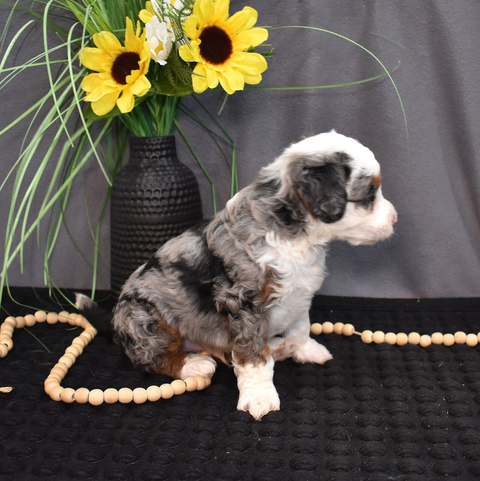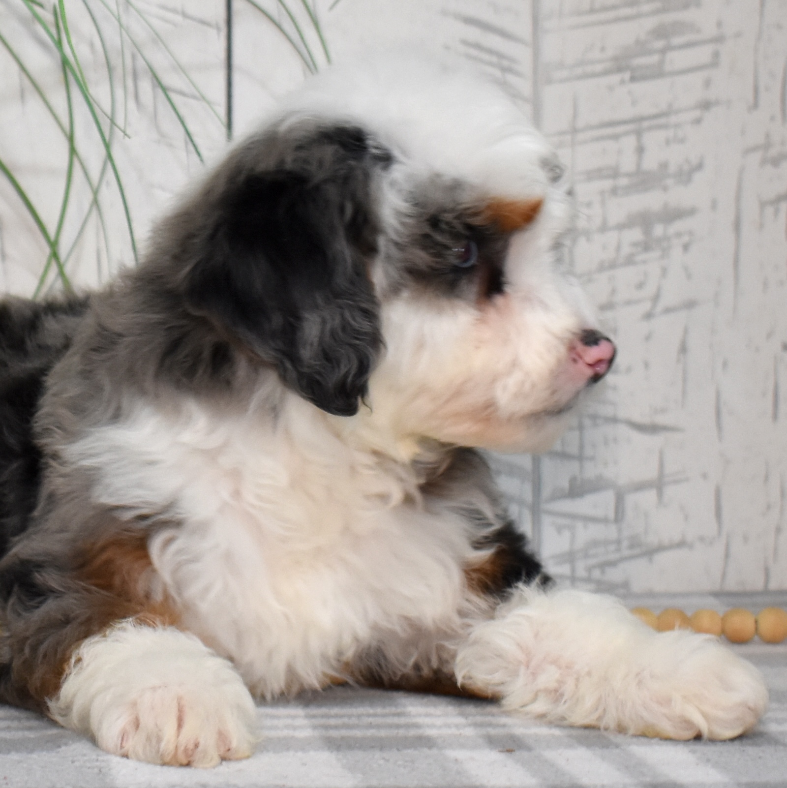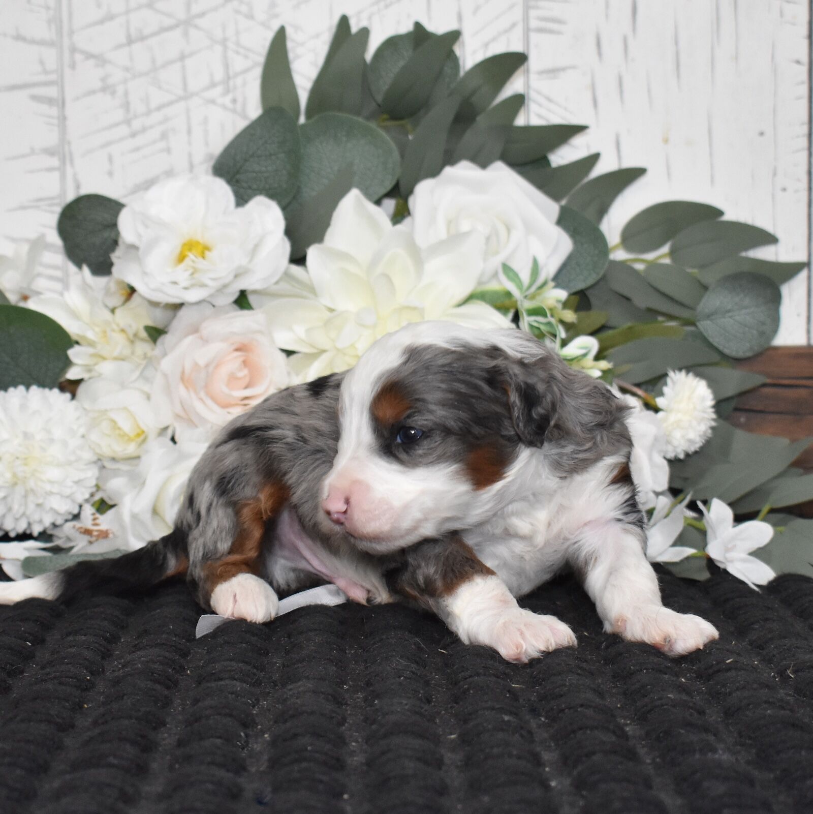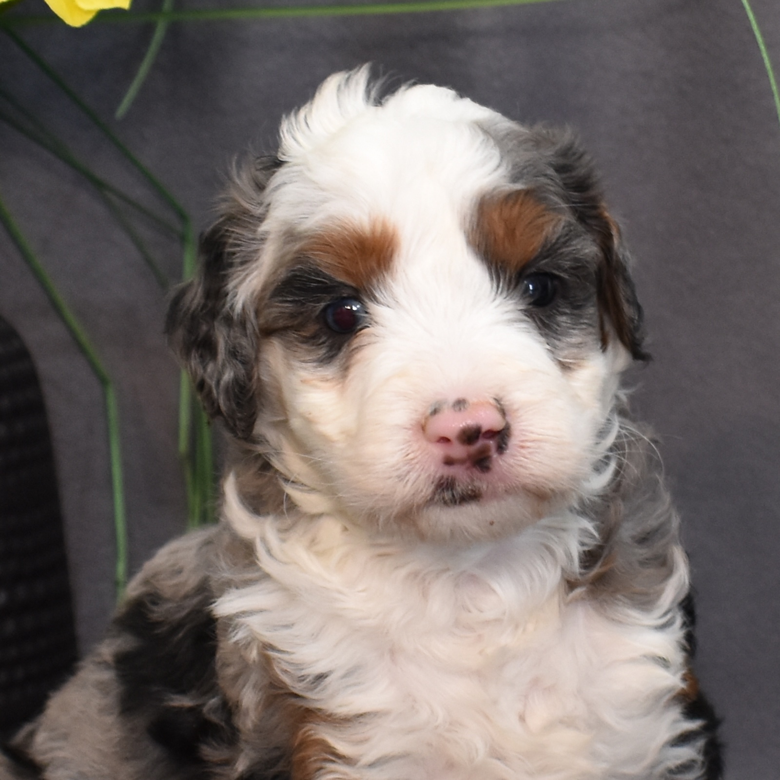 Meet Mr. Blue, the Bernedoodle dad with a coat dreams are made of! His dreamy merle curly coat shimmers with unique shades of silver, slate, and charcoal, each curl a testament to his stunning genetics. Beyond his captivating looks, Mr. Blue is pure joy. He approaches every day with an infectious enthusiasm, his tail wagging a happy rhythm. Whether he’s romping in the park, enjoying a cuddle, or just observing the world with a gentle gaze, his joy for life is undeniable. He’s a magnificent boy, inside and out.