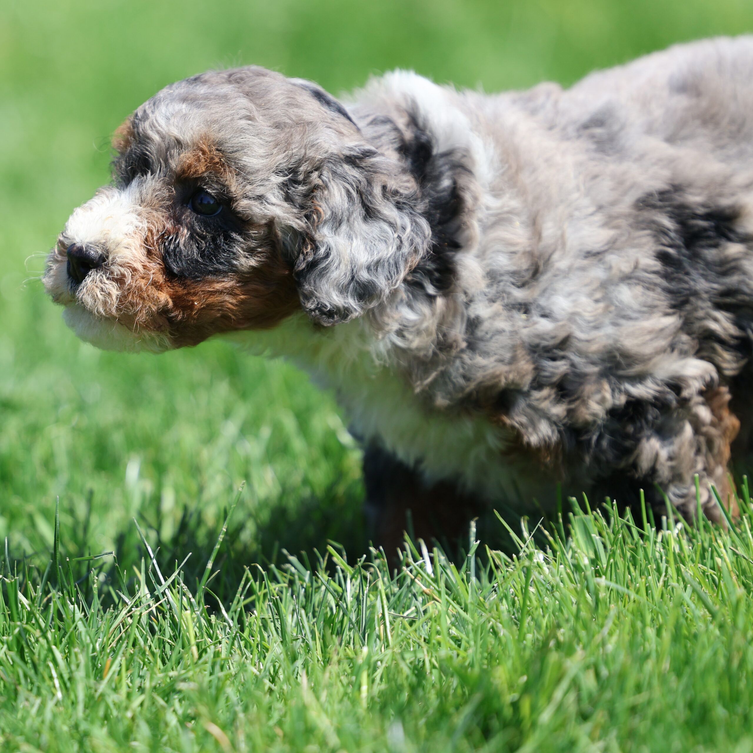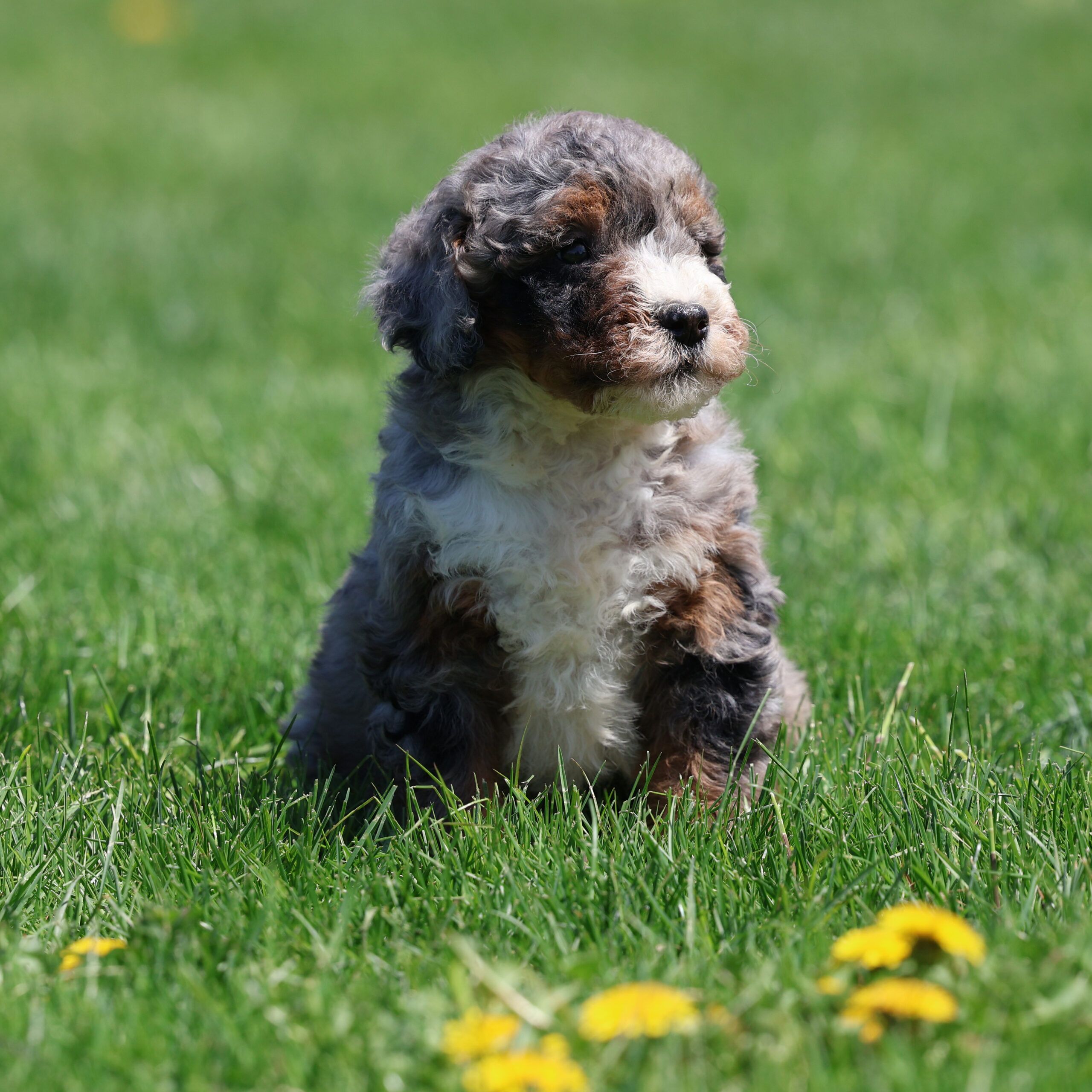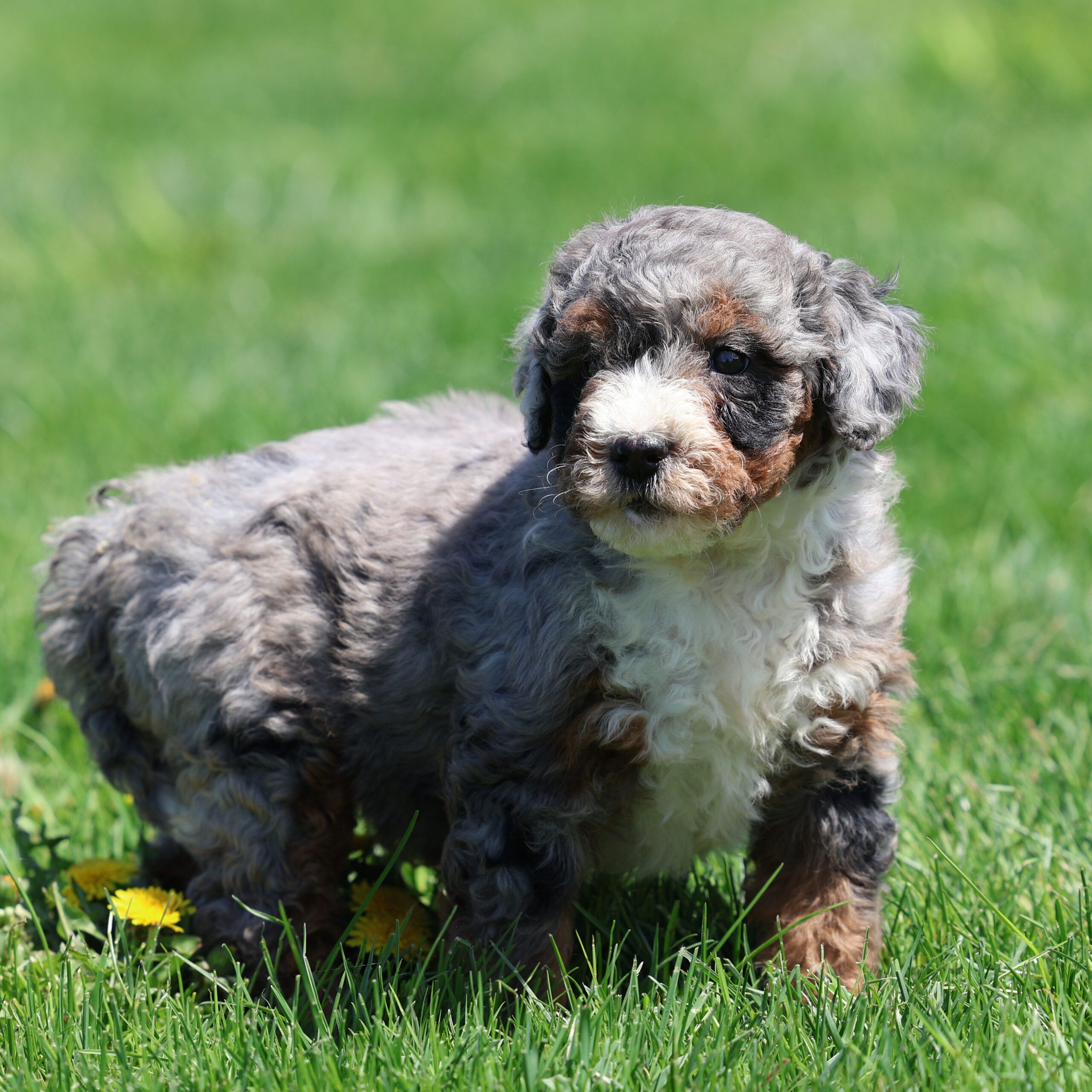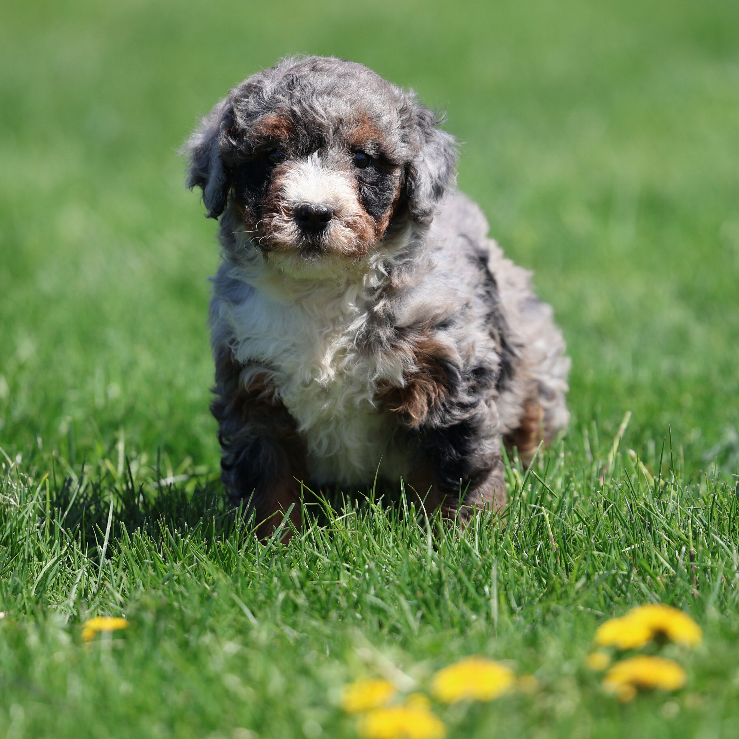 Tina, a devoted Bernedoodle mom, is a vision with her striking blue merle coat, a swirling tapestry of greys, blacks, and hints of white. Her curly fleece is soft to the touch, providing comfort for her precious pups. Tina embodies gentle care, showering her offspring with unwavering attention and affection. You’ll often find her nudging them close, ensuring their safety and warmth. Her loving nature and distinctive coat make her an exceptional mother and a truly beautiful Bernedoodle.