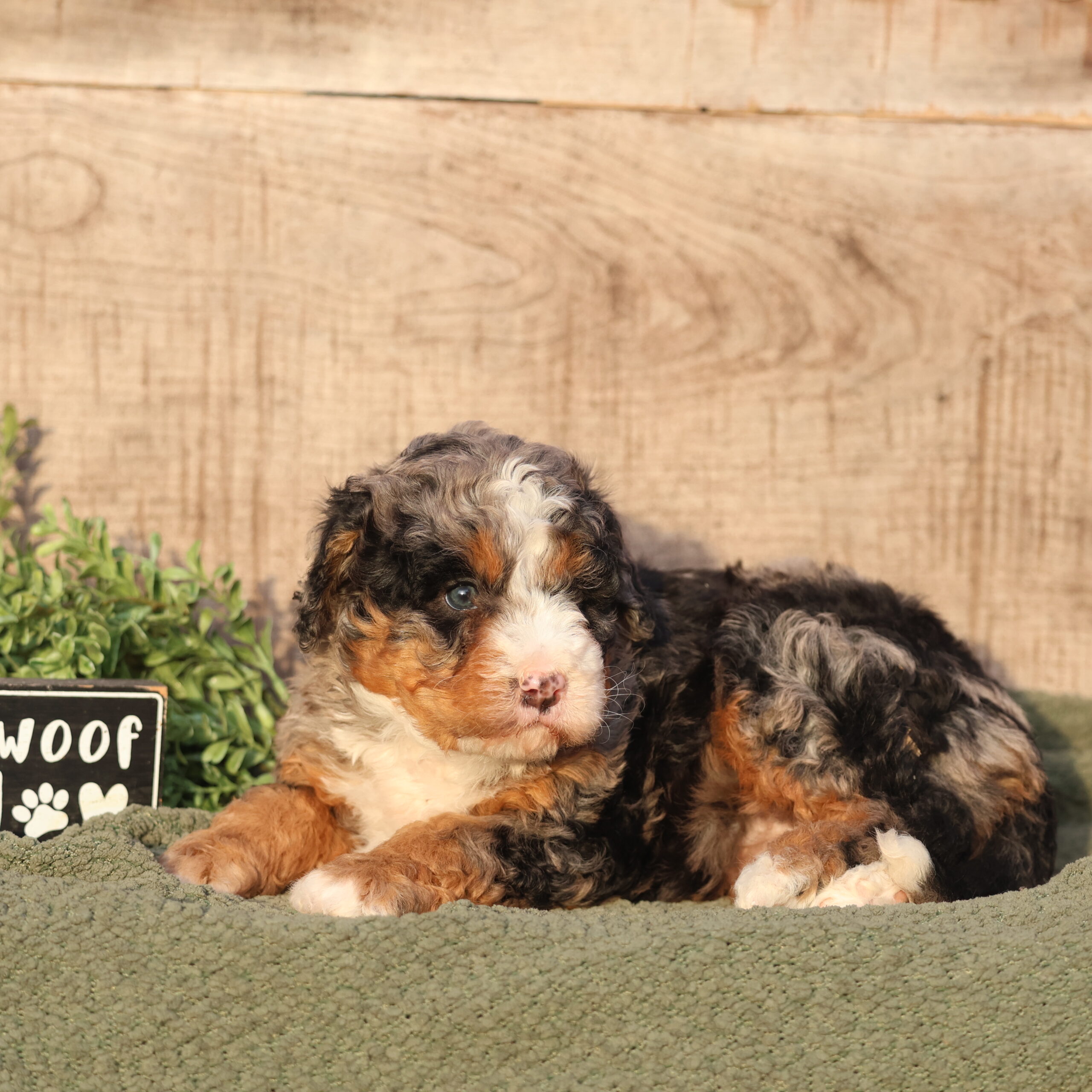 Meet Mr. Blue, the Bernedoodle dad with a coat dreams are made of! His dreamy merle curly coat shimmers with unique shades of silver, slate, and charcoal, each curl a testament to his stunning genetics. Beyond his captivating looks, Mr. Blue is pure joy. He approaches every day with an infectious enthusiasm, his tail wagging a happy rhythm. Whether he’s romping in the park, enjoying a cuddle, or just observing the world with a gentle gaze, his joy for life is undeniable. He’s a magnificent boy, inside and out.