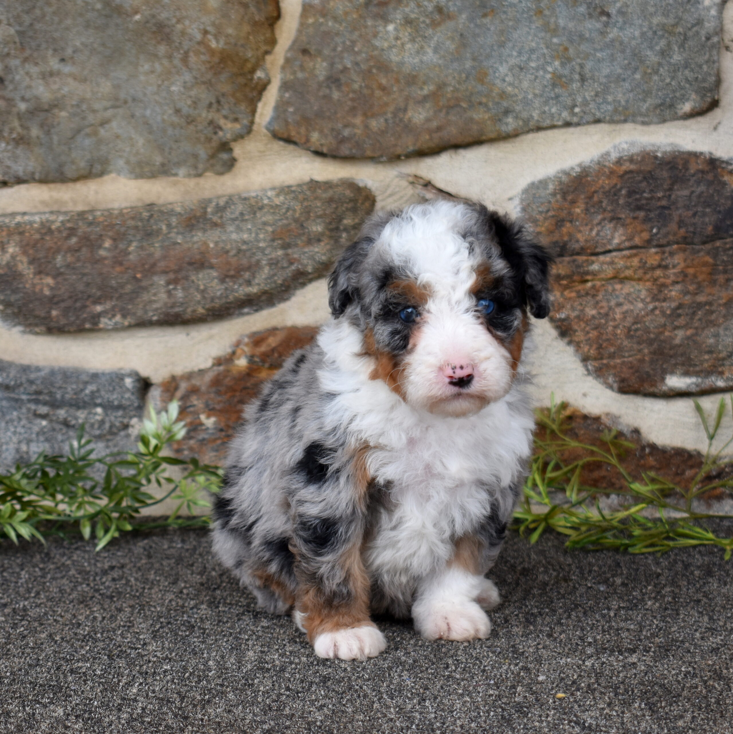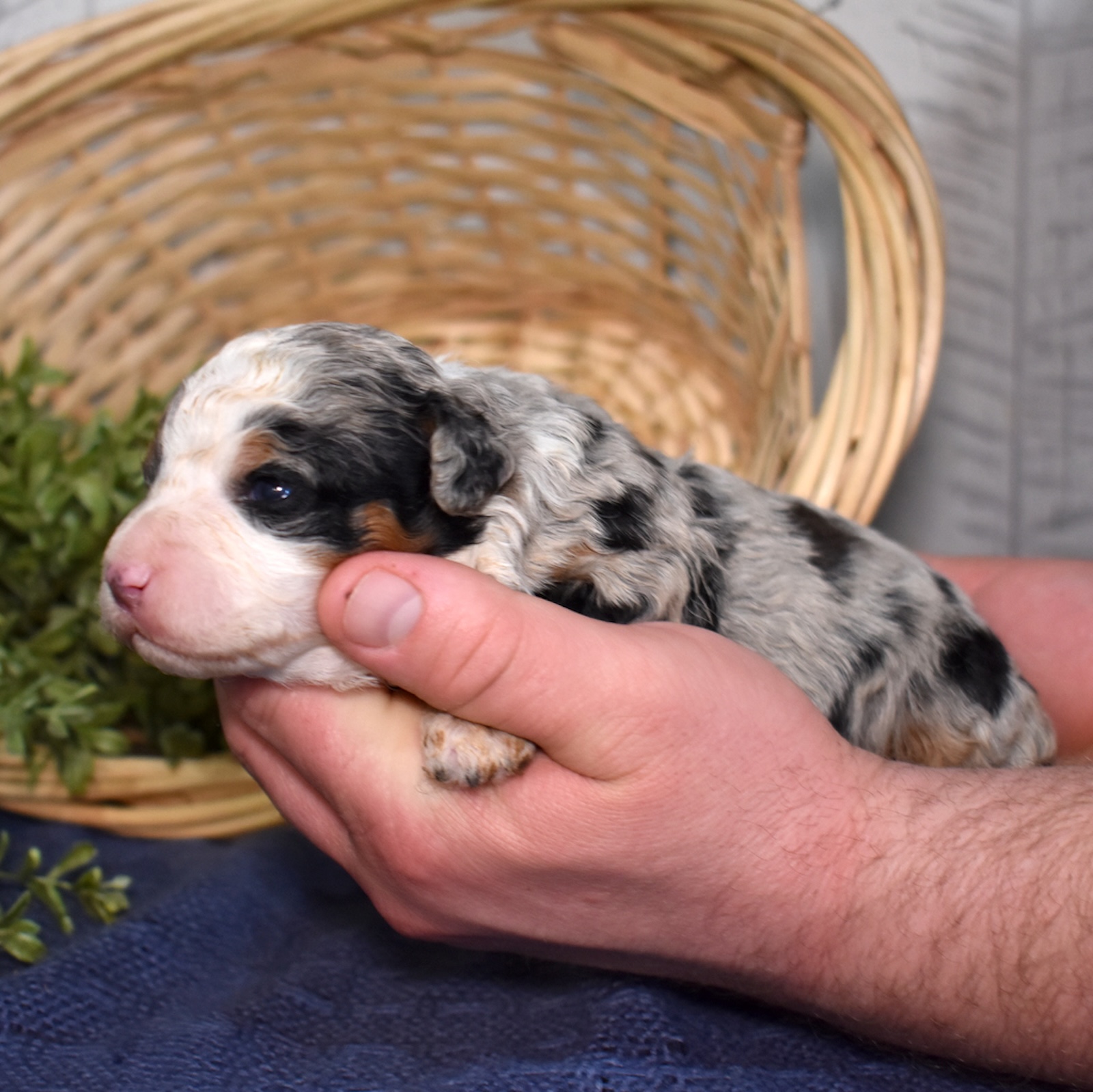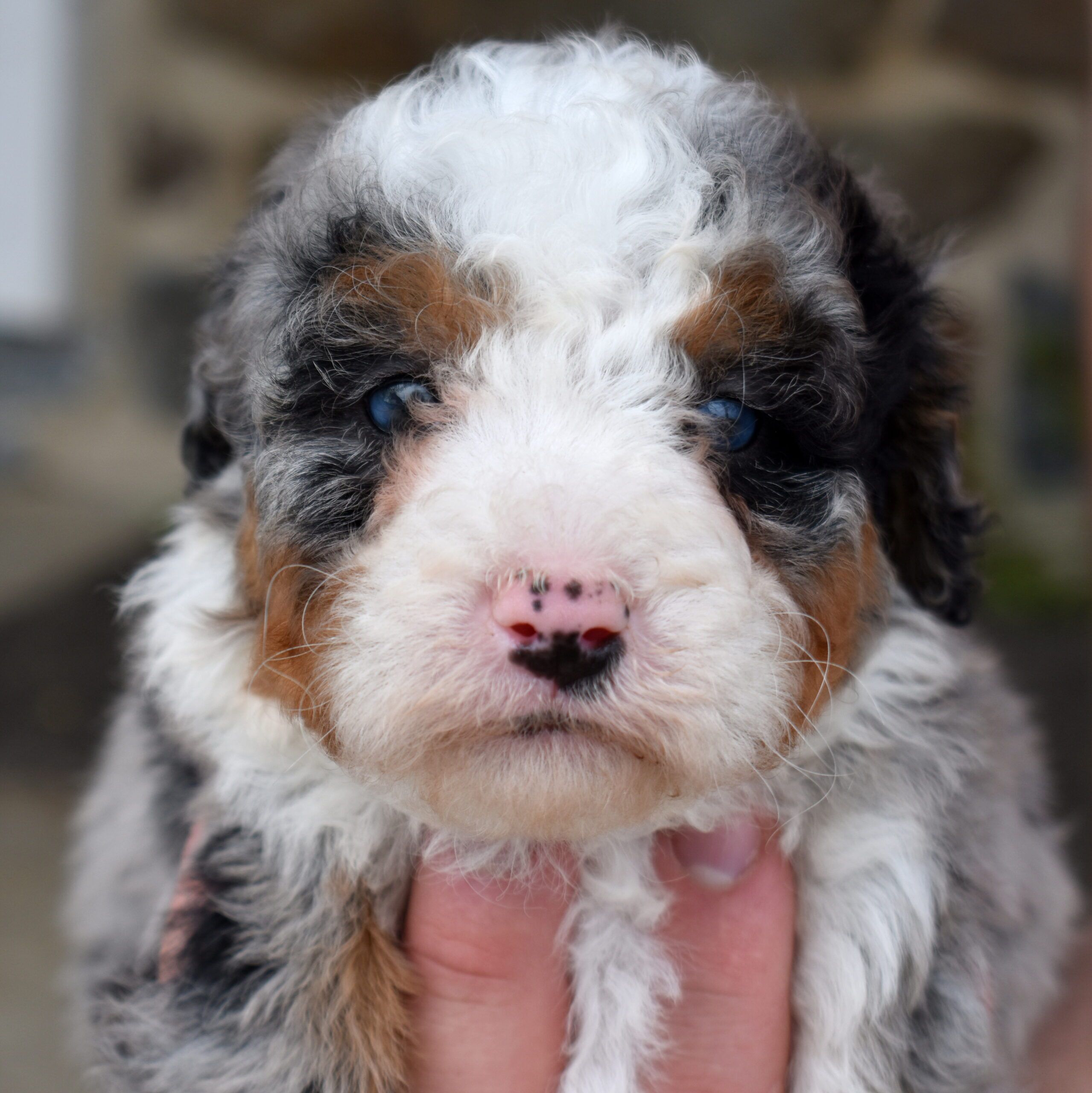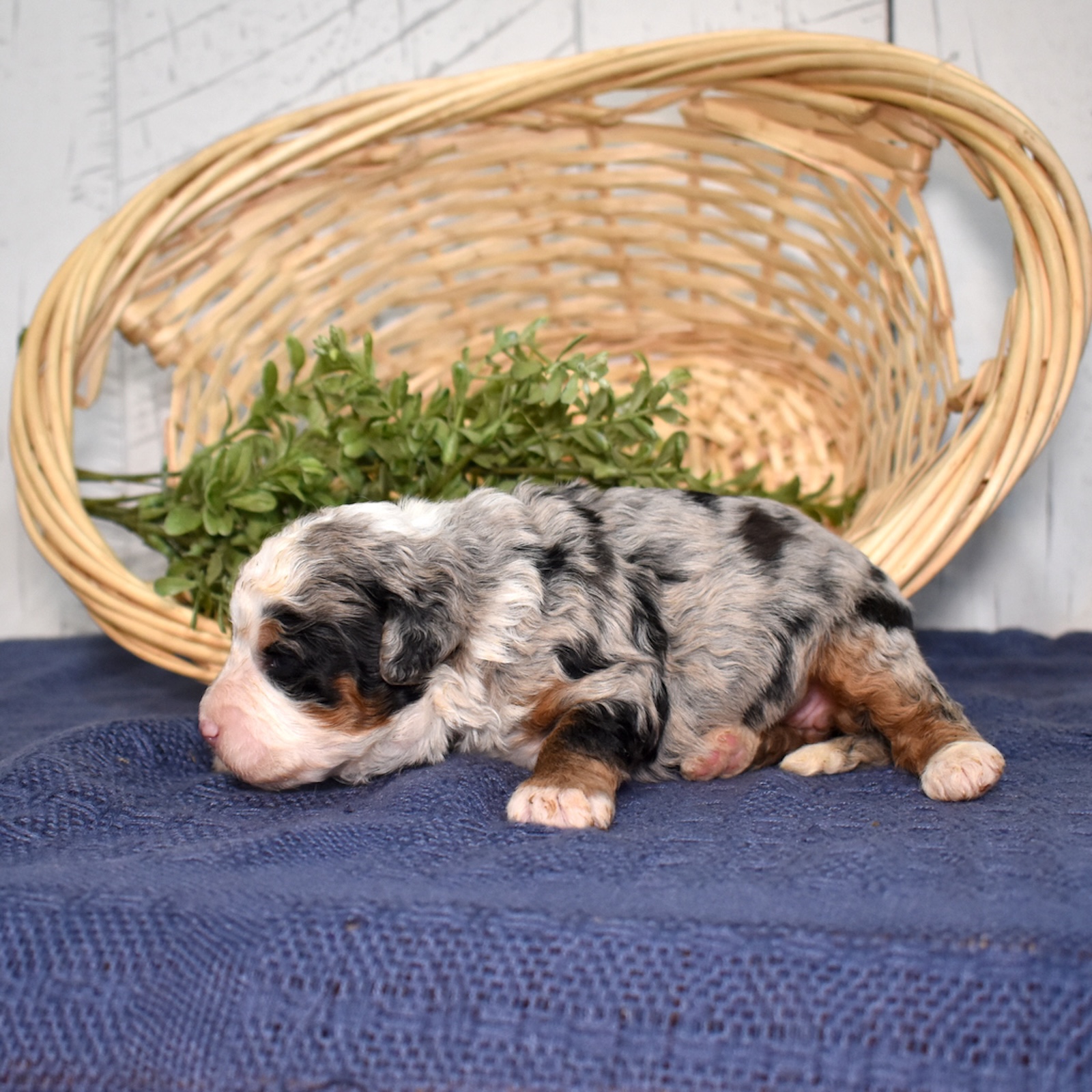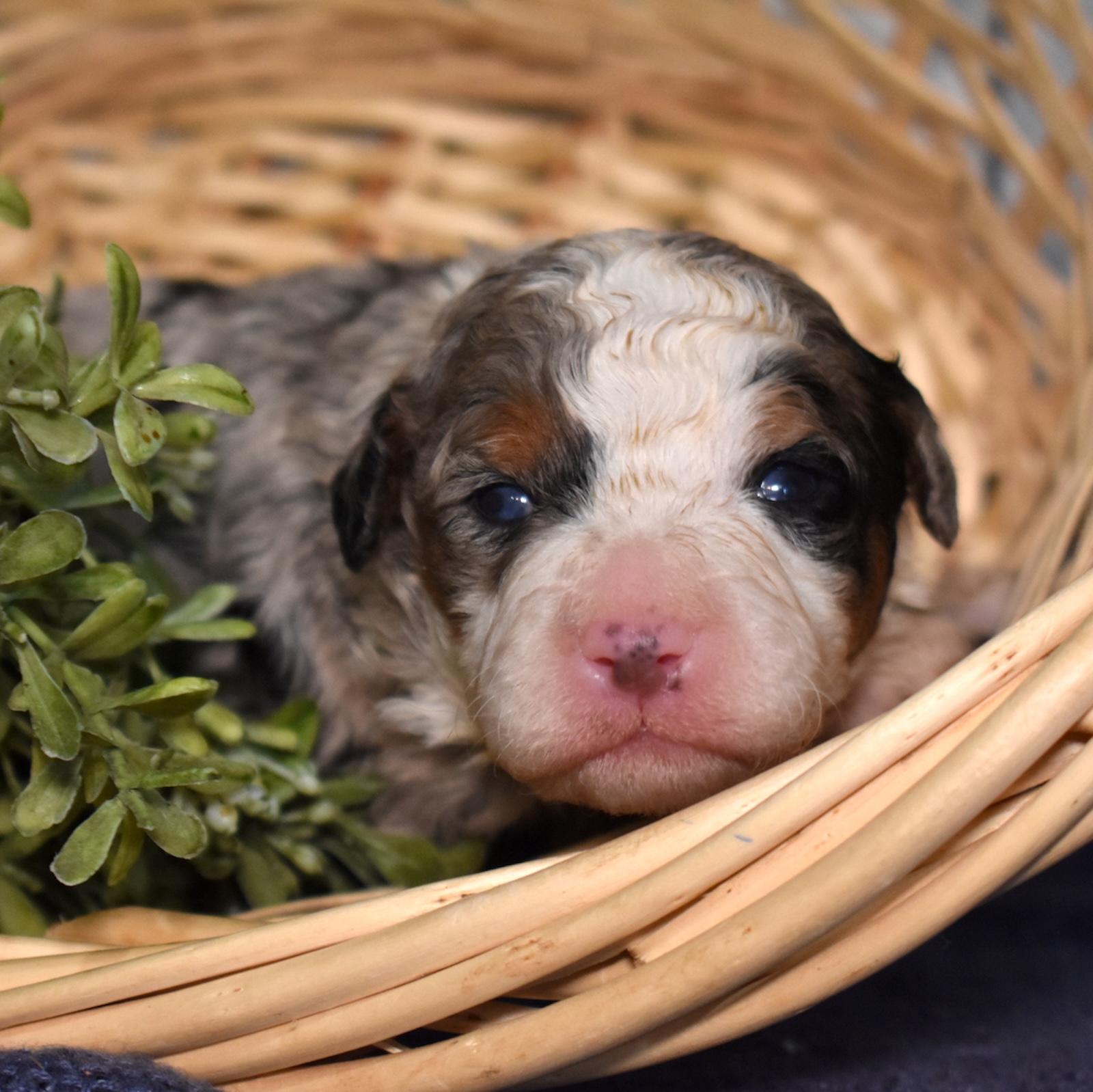 Coco is a striking merle girl with a beautifully patterned coat and a calm, sweet presence. For families looking for a mini bernadoodle for sale, Coco is part of a very promising Cuddles x Mr. Blue litter. We are eager to see her personality come to life as she grows. Cuddles brings her laid-back and affectionate 30-pound temperament, while Mr. Blue offers a steady, observant nature at 40 pounds—both genetically tested. Coco is expected to have a curlier, allergy-friendly coat.