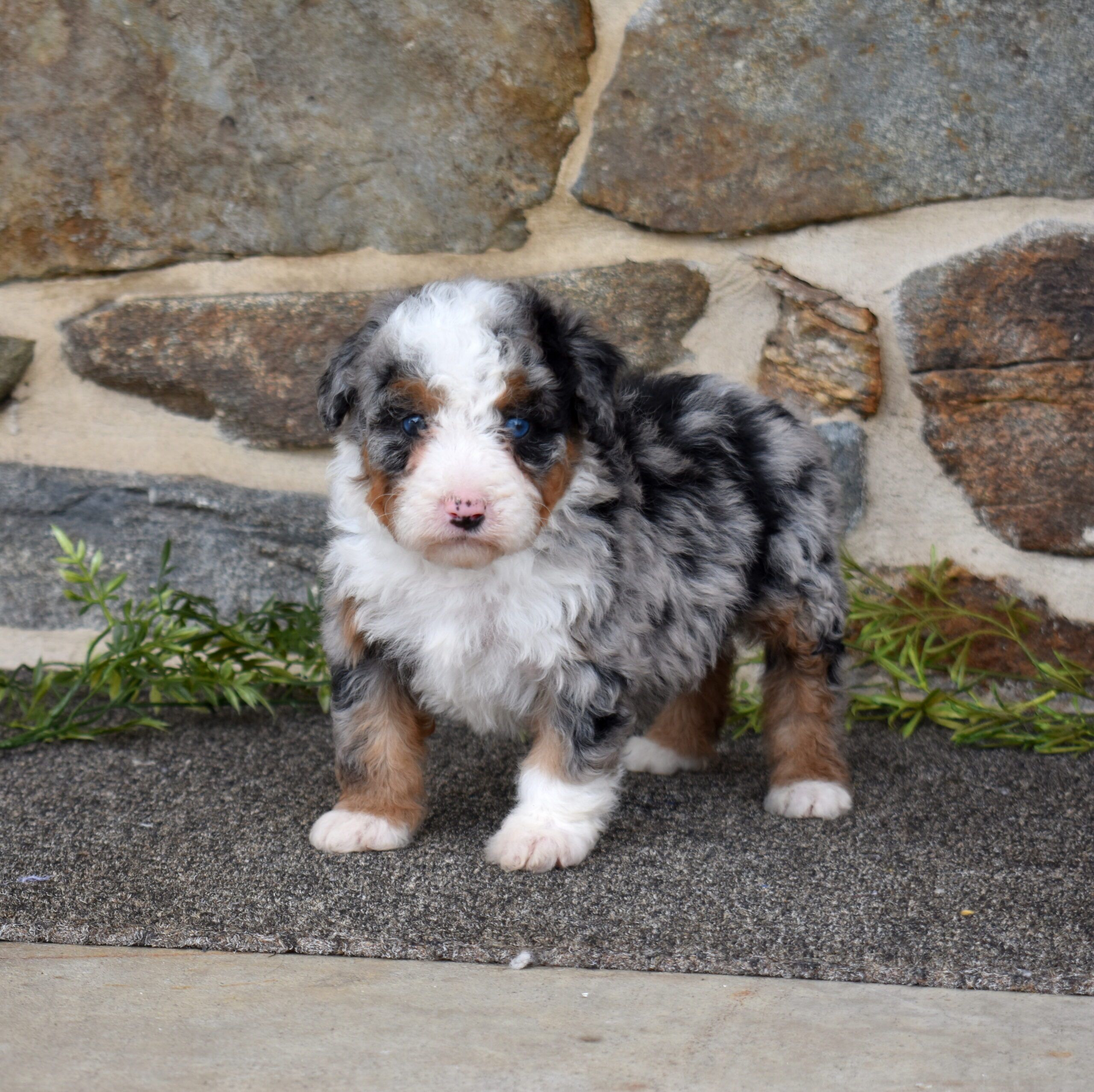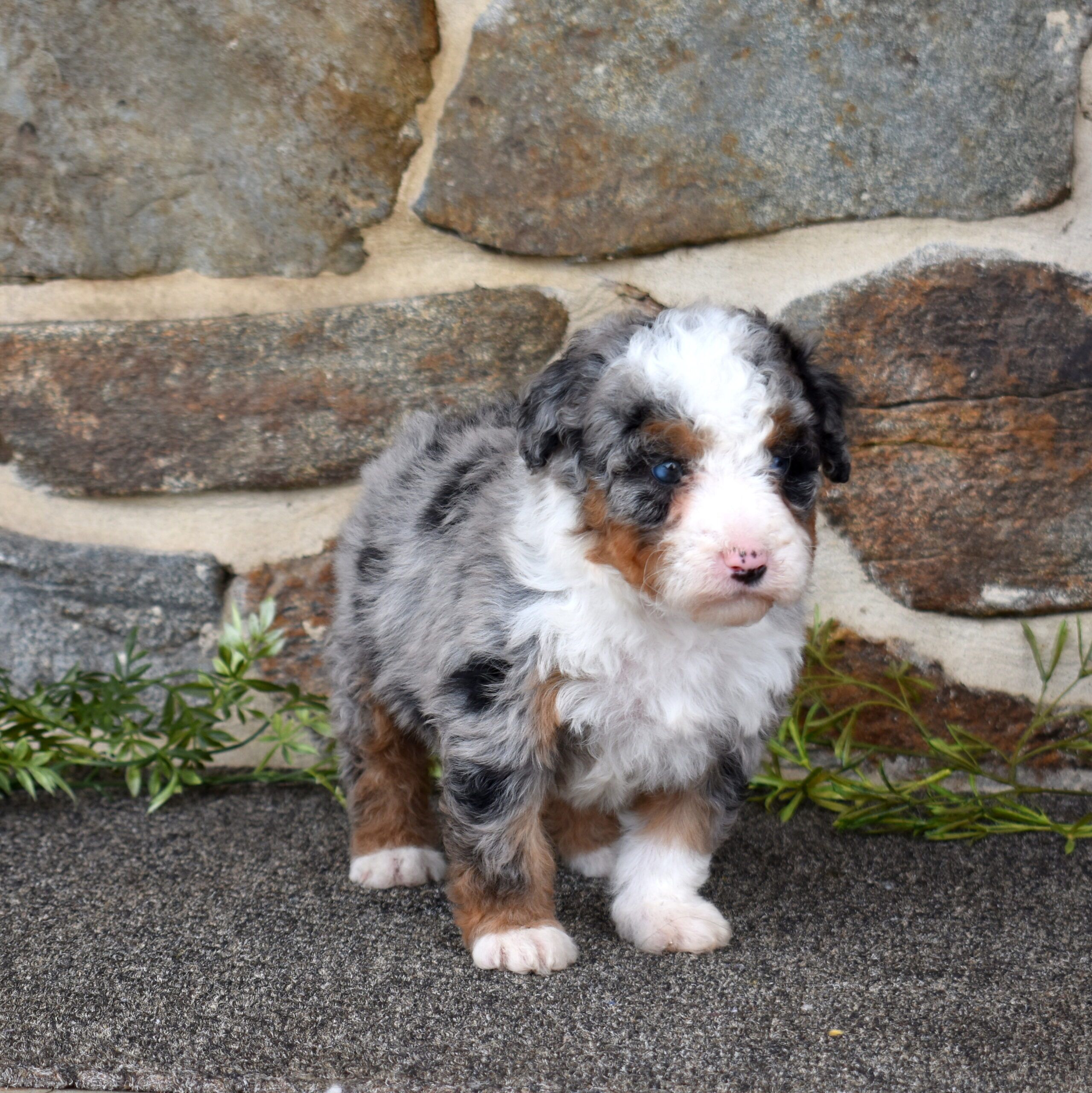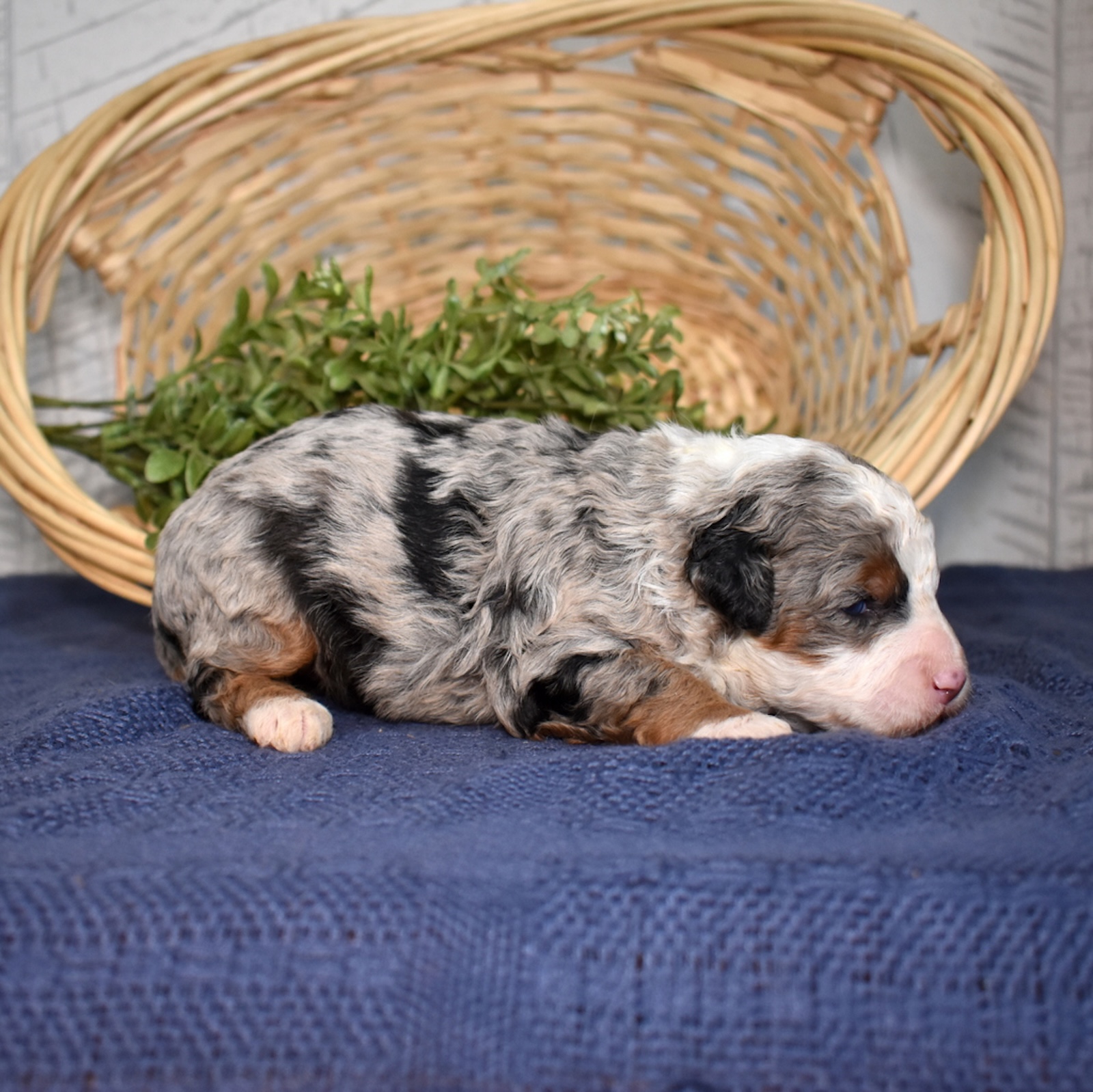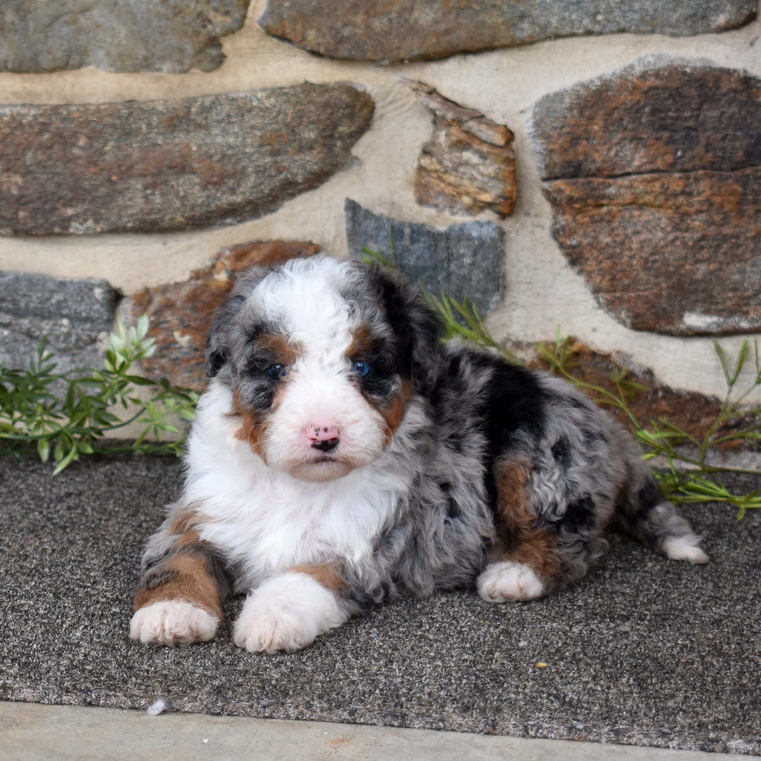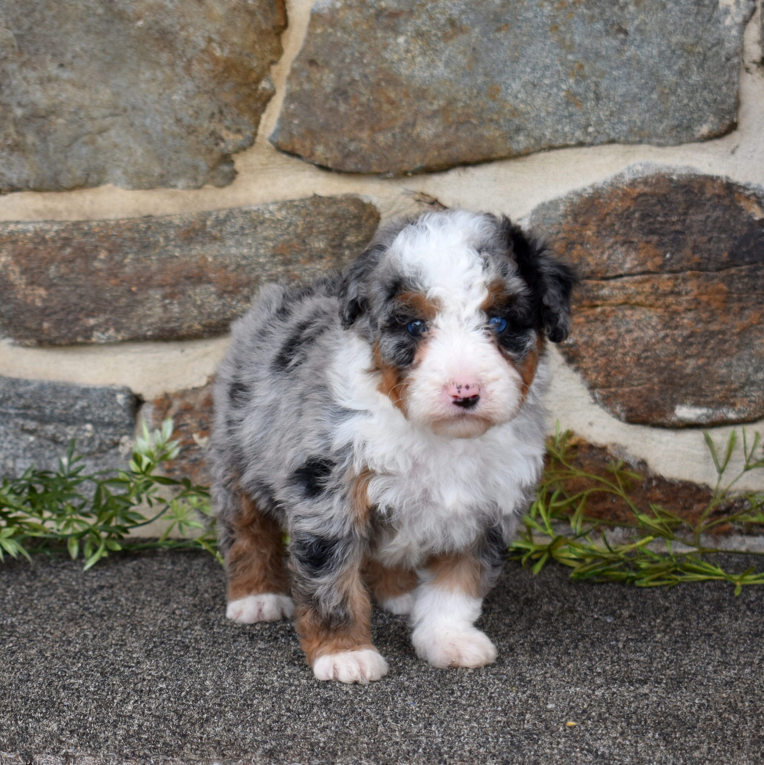 Coco is a striking merle girl with a beautifully patterned coat and a calm, sweet presence. For families looking for a mini bernadoodle for sale, Coco is part of a very promising Cuddles x Mr. Blue litter. We are eager to see her personality come to life as she grows. Cuddles brings her laid-back and affectionate 30-pound temperament, while Mr. Blue offers a steady, observant nature at 40 pounds—both genetically tested. Coco is expected to have a curlier, allergy-friendly coat.