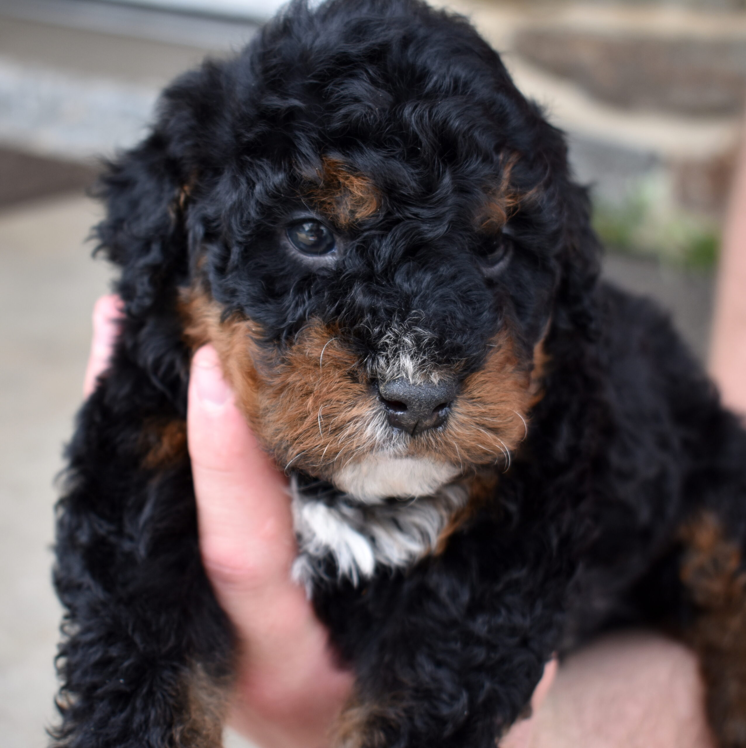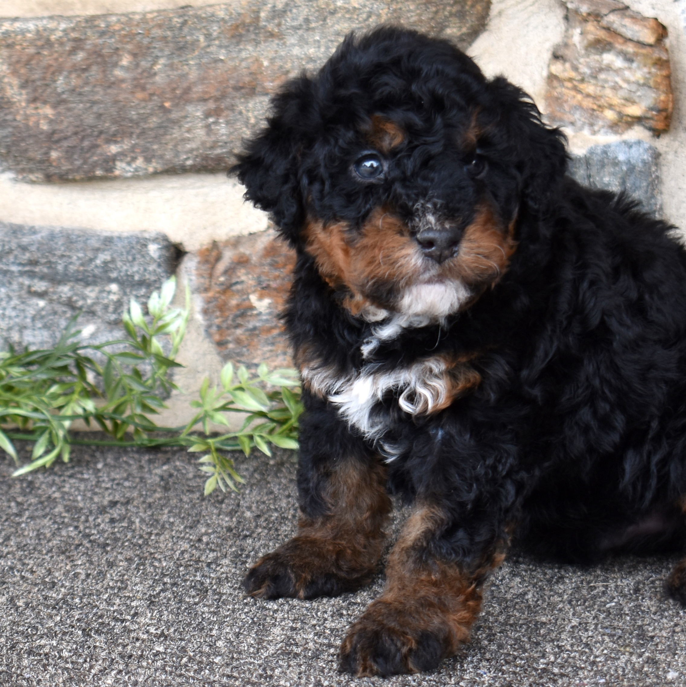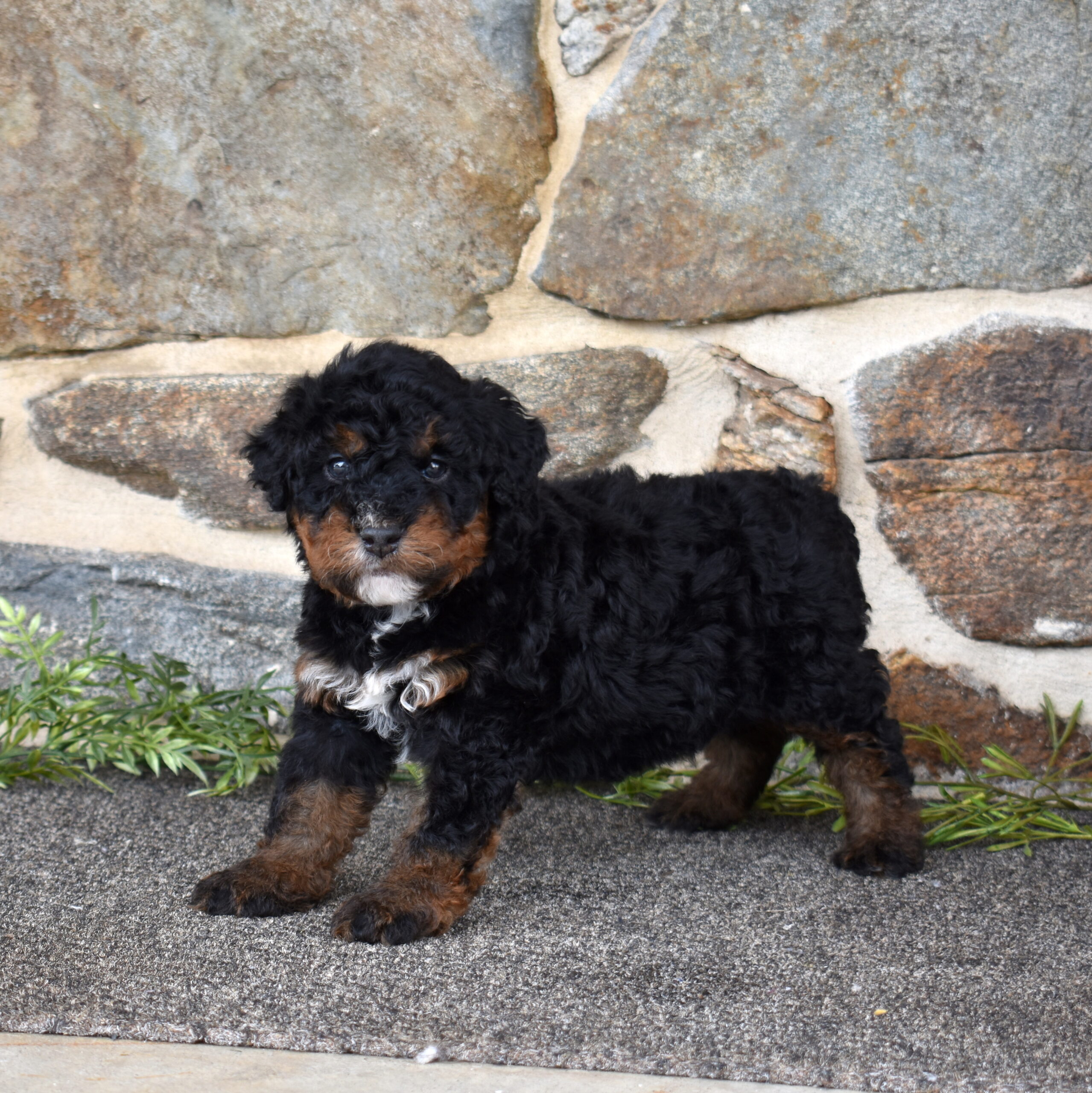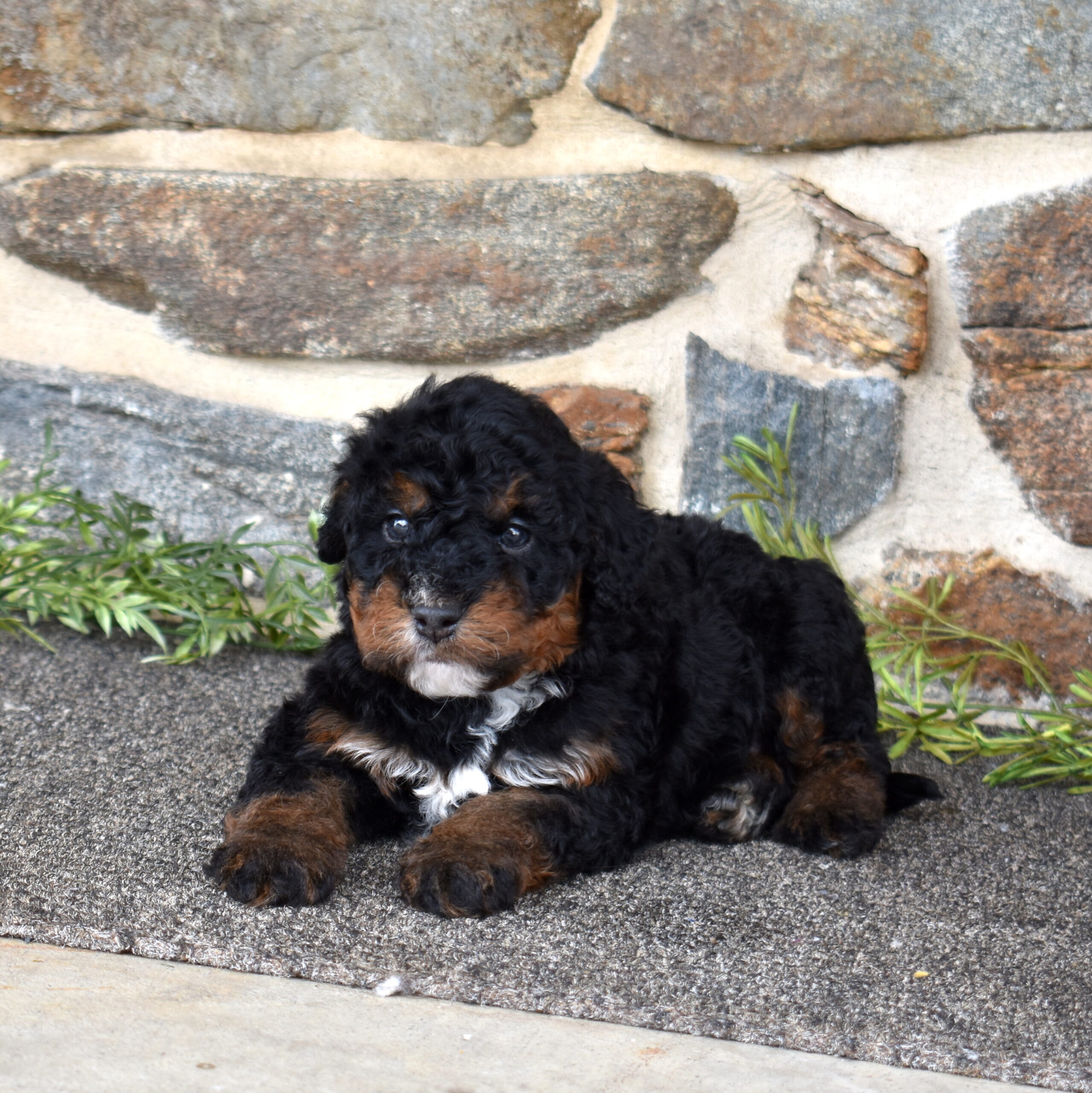 Lucky is a handsome tri color boy with a soft, curly coat and a calm, steady presence. If you’ve been searching for Mini bernadoodles for sale, Lucky is a great example of this thoughtfully bred litter. We are excited to see his personality grow as he matures. His mom Cuddles is a 30-pound, laid-back and happy-to-please companion, while his dad Mr. Blue is a 40-pound reserved and calm observer—both genetically tested. Lucky is expected to have a curlier, allergy-friendly coat.