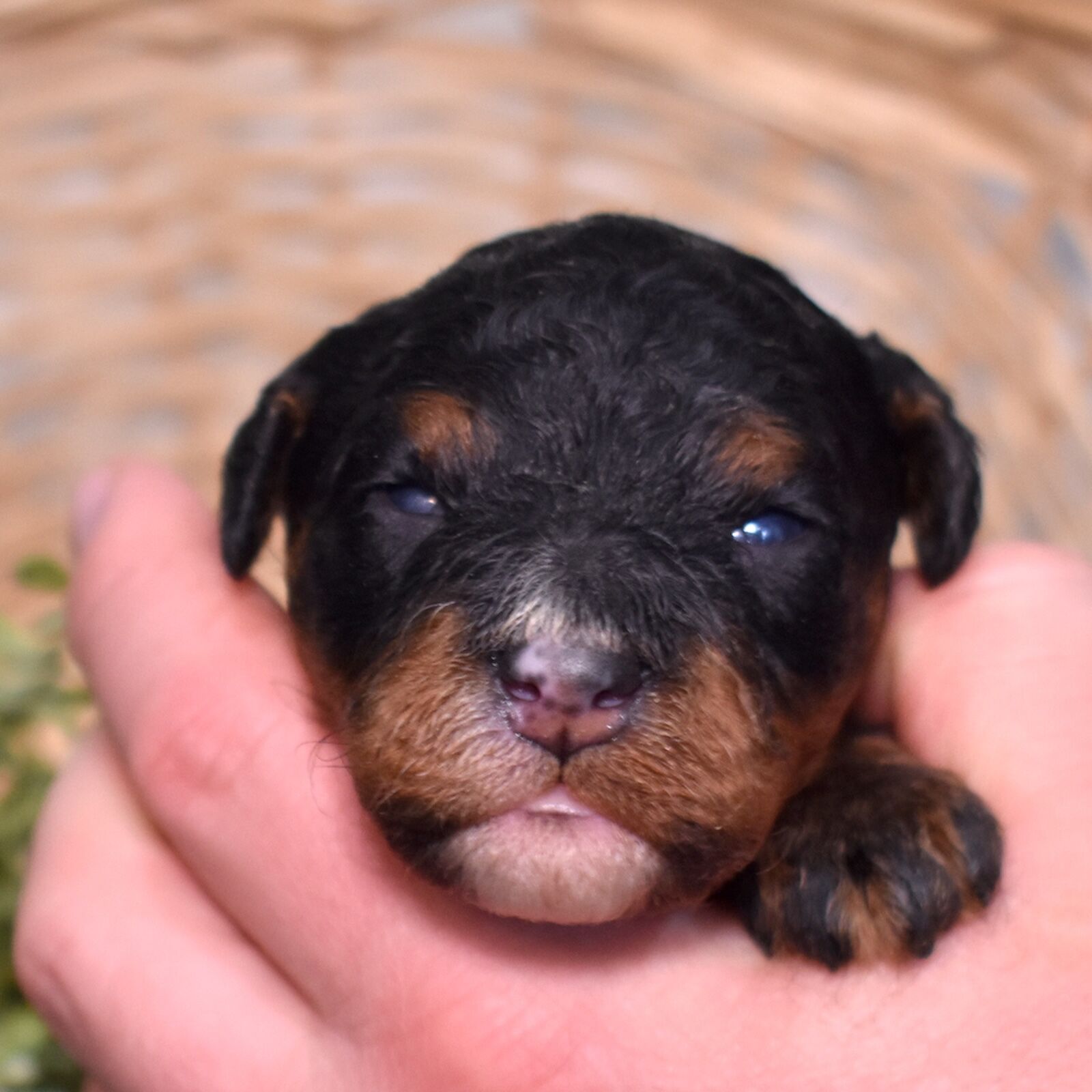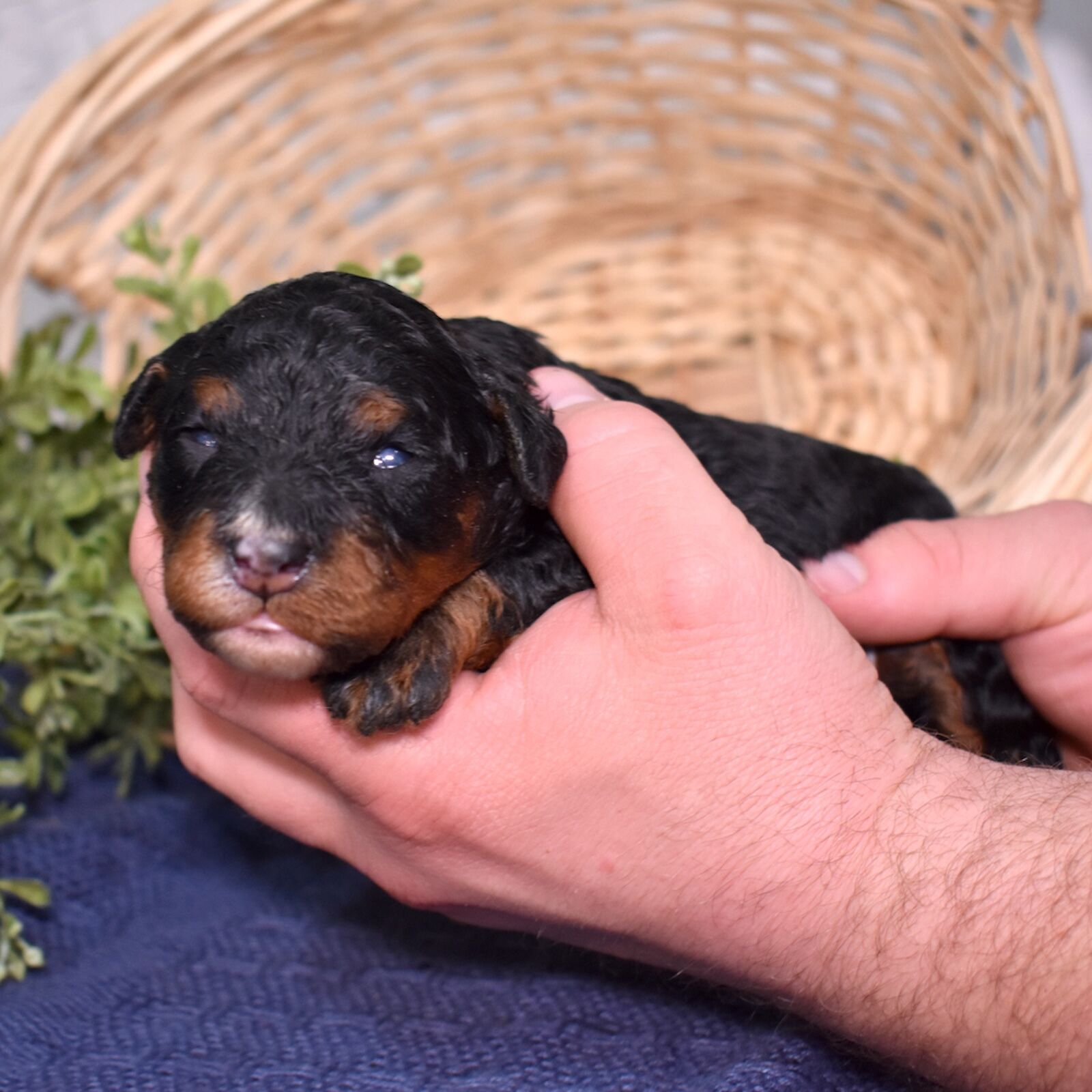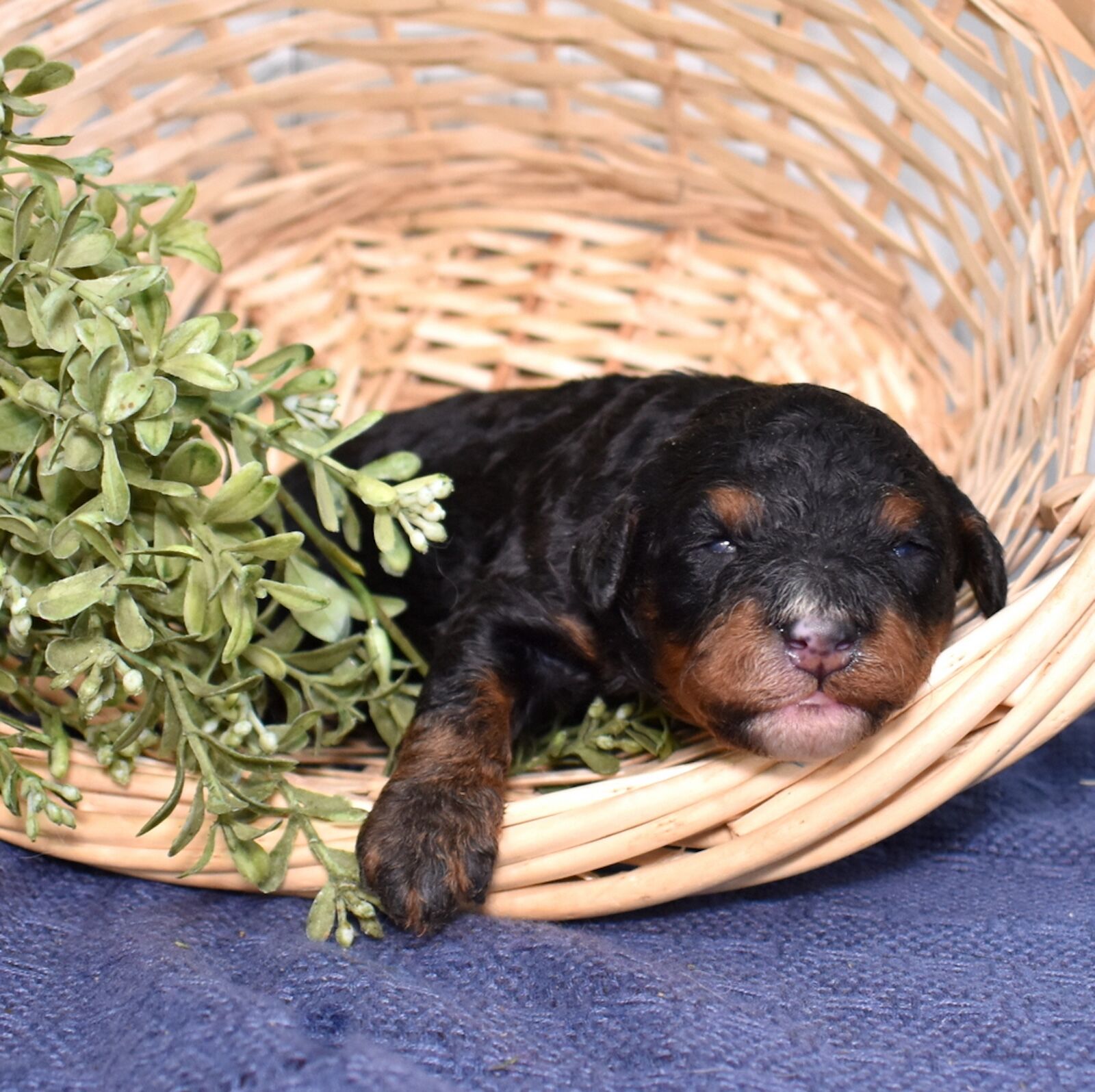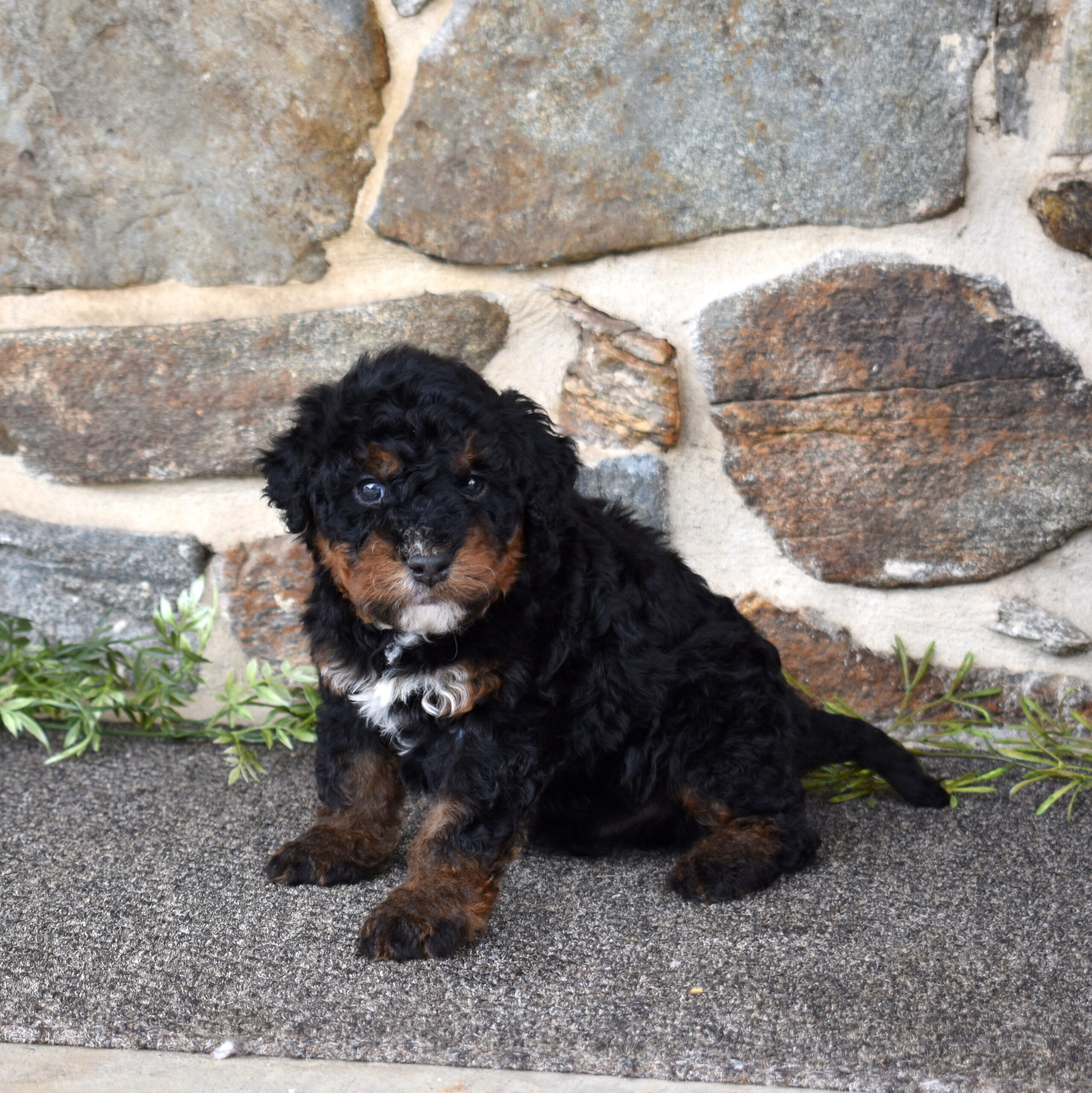 Lucky is a handsome tri color boy with a soft, curly coat and a calm, steady presence. If you’ve been searching for Mini bernadoodles for sale, Lucky is a great example of this thoughtfully bred litter. We are excited to see his personality grow as he matures. His mom Cuddles is a 30-pound, laid-back and happy-to-please companion, while his dad Mr. Blue is a 40-pound reserved and calm observer—both genetically tested. Lucky is expected to have a curlier, allergy-friendly coat.