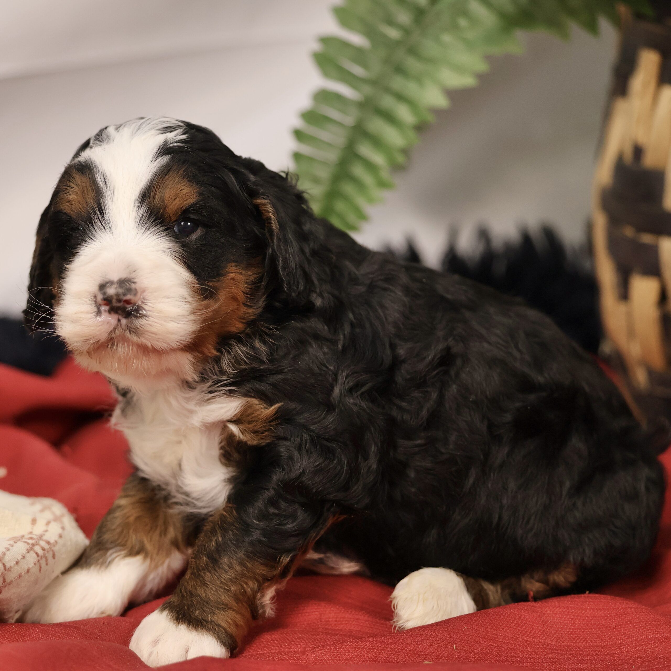 Panda is a beautiful Bernedoodle mom with a black tri color coat. She is a gentle and loving dog who is always happy to see her puppies. Panda is a great mom who takes good care of her puppies. She is always there to feed them, clean them, and play with them. Panda is a great example of a loving and caring mother. Panda is a very intelligent dog. She is quick to learn new things and is always eager to please. Panda is a great companion and is always happy to go for walks or play in the yard. Panda is a very healthy dog. She has been genetically tested and is clear of all common Bernedoodle health problems.