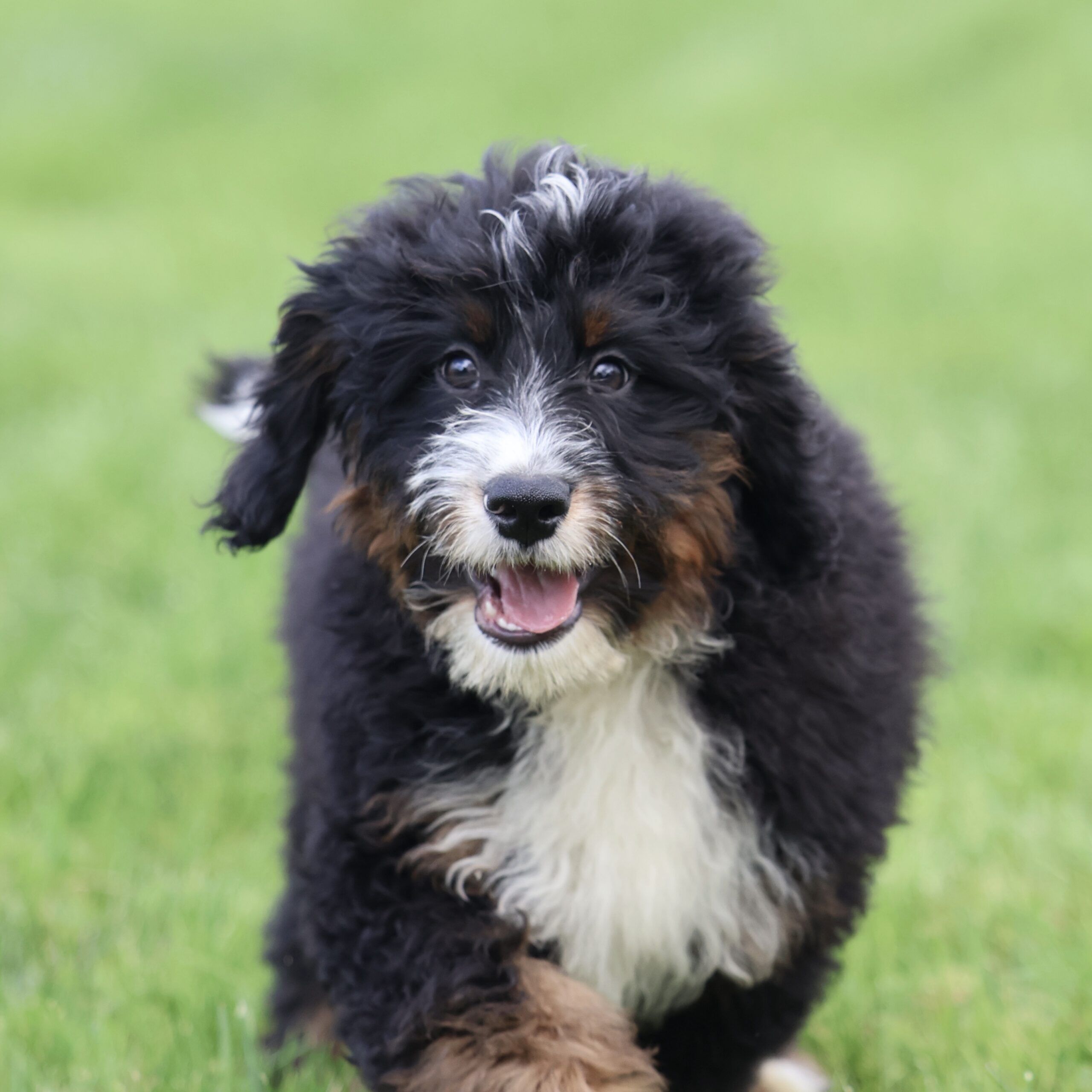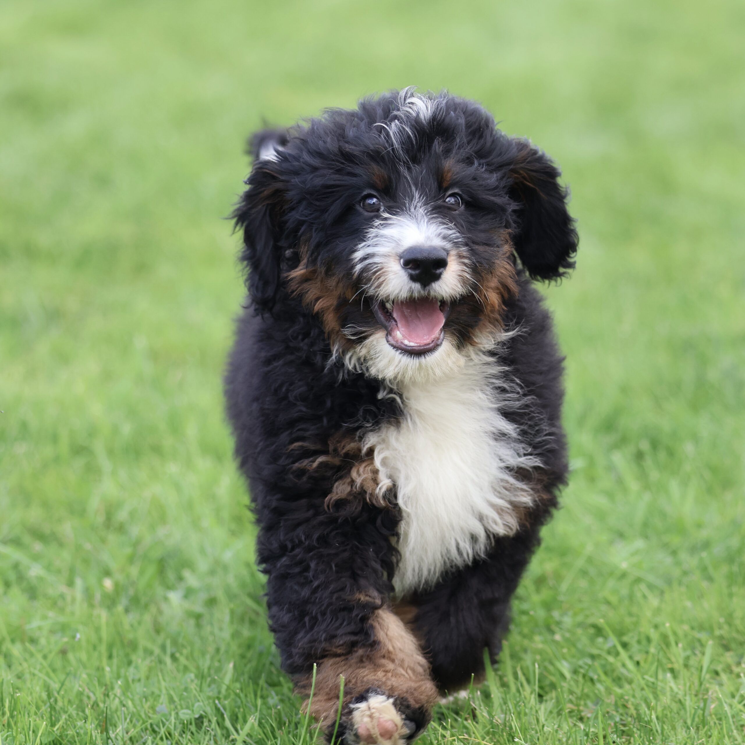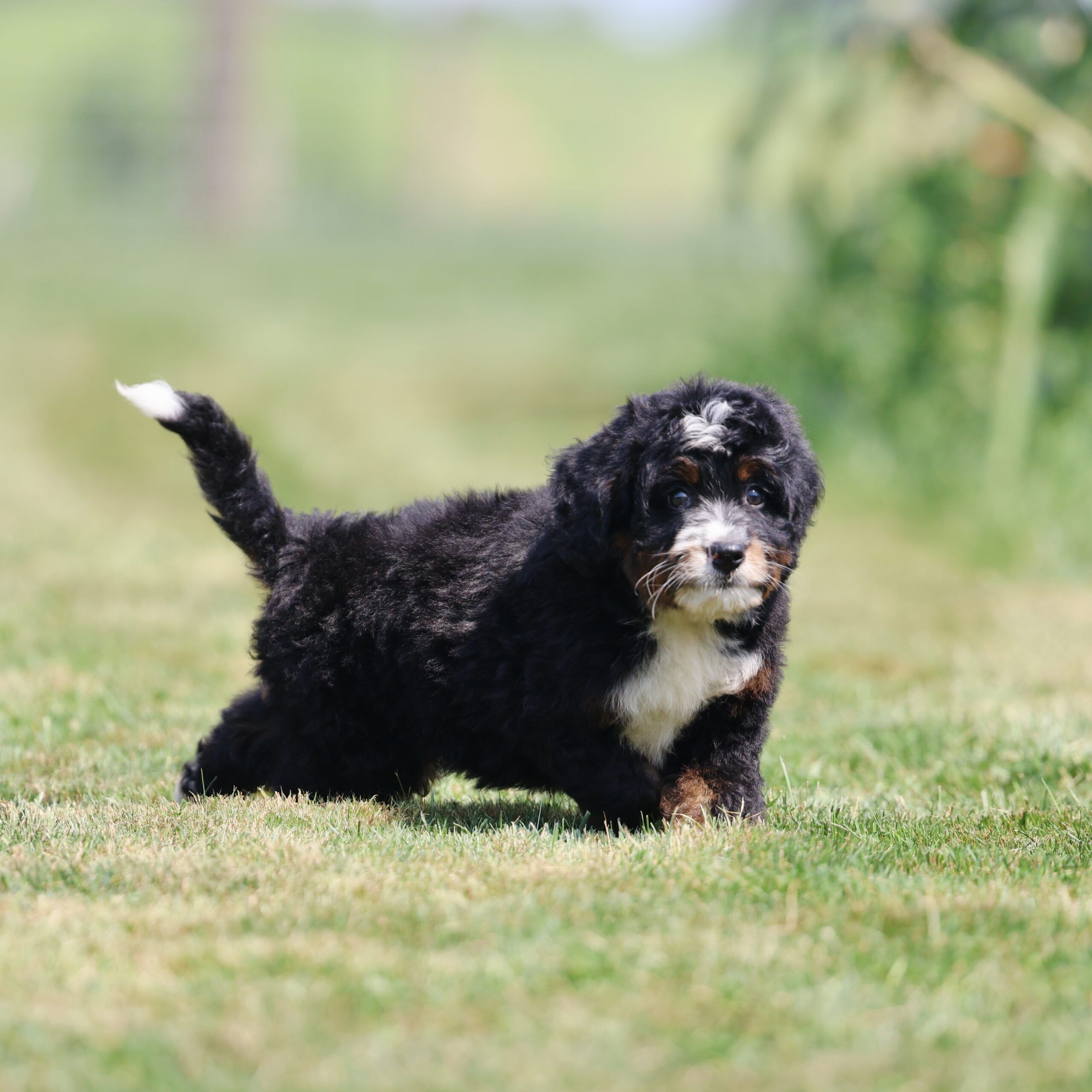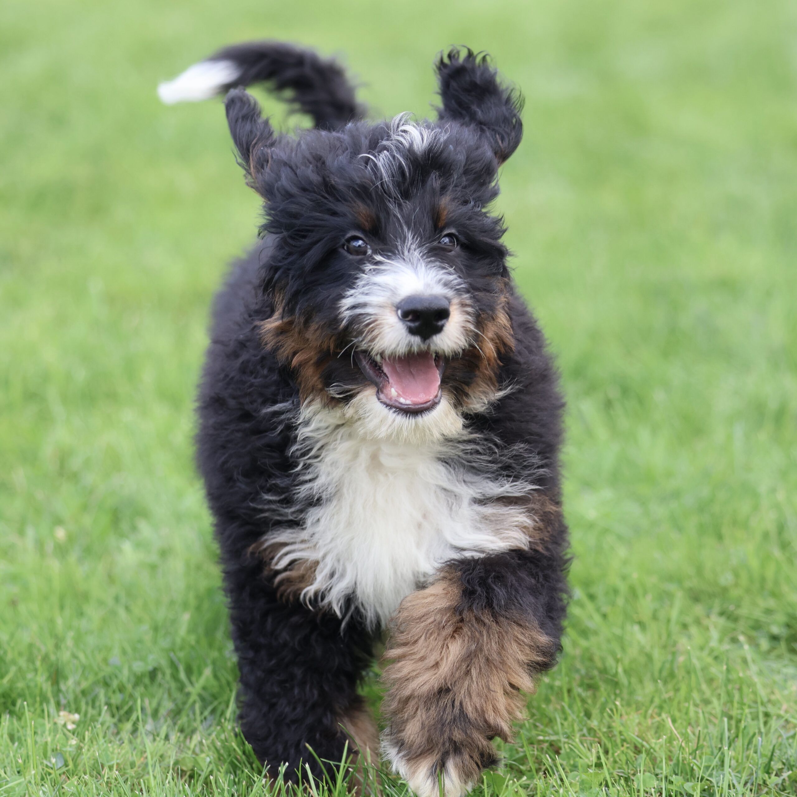 Searching for mini bernedoodles hypoallergenic? Welcome to Berry Patch Puppies, home of Quigley, a perfect tri-color,  male mini bernedoodle pup!