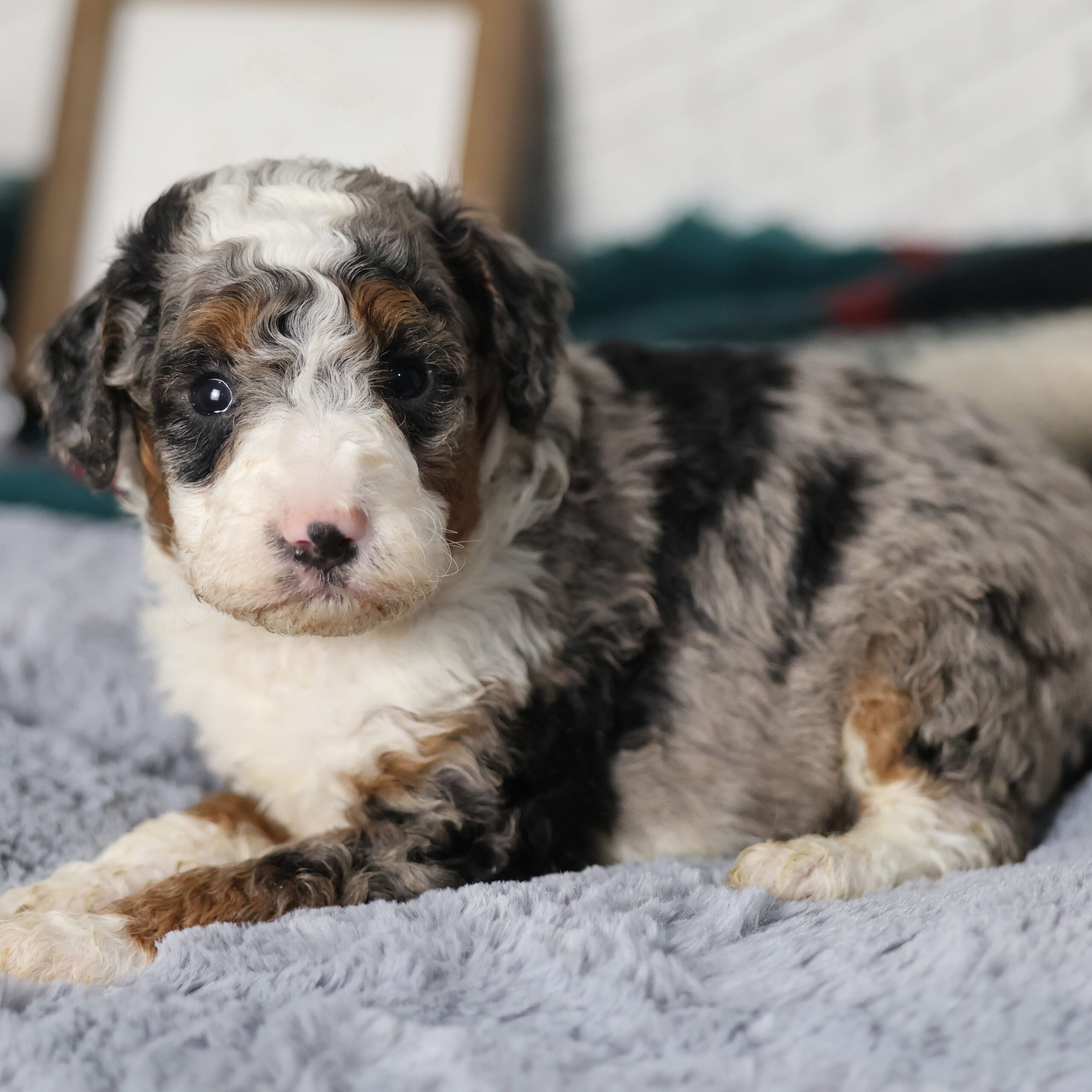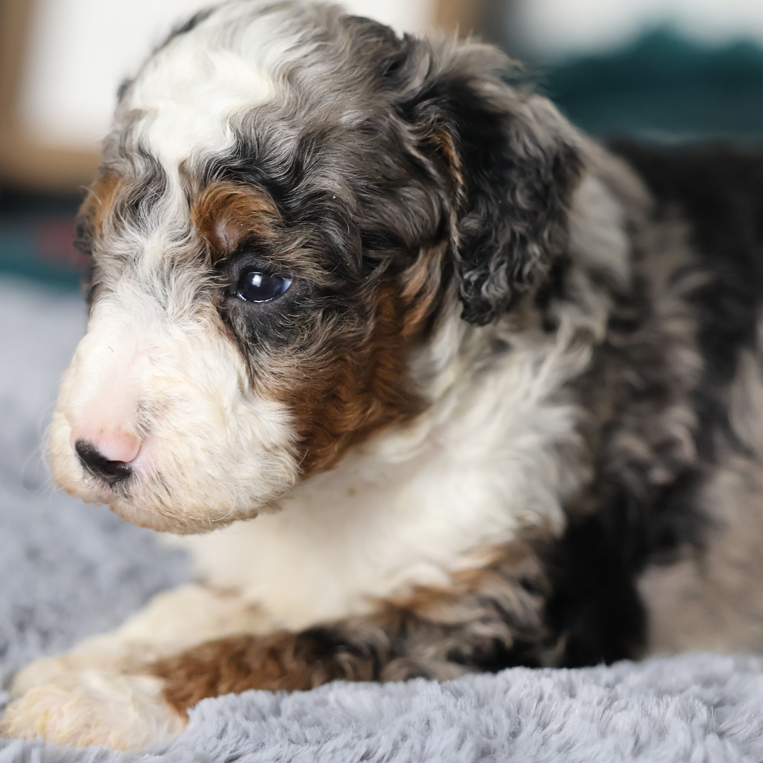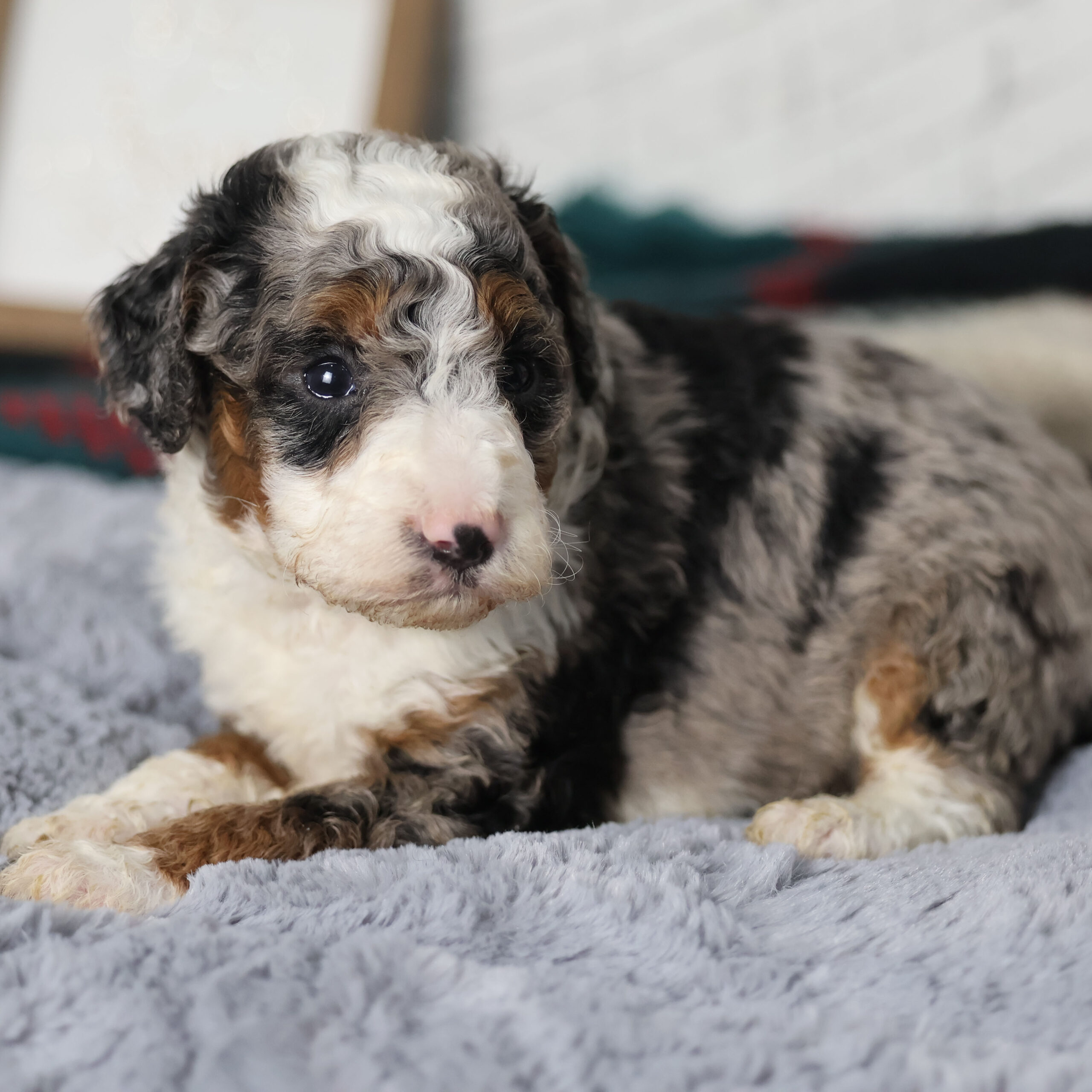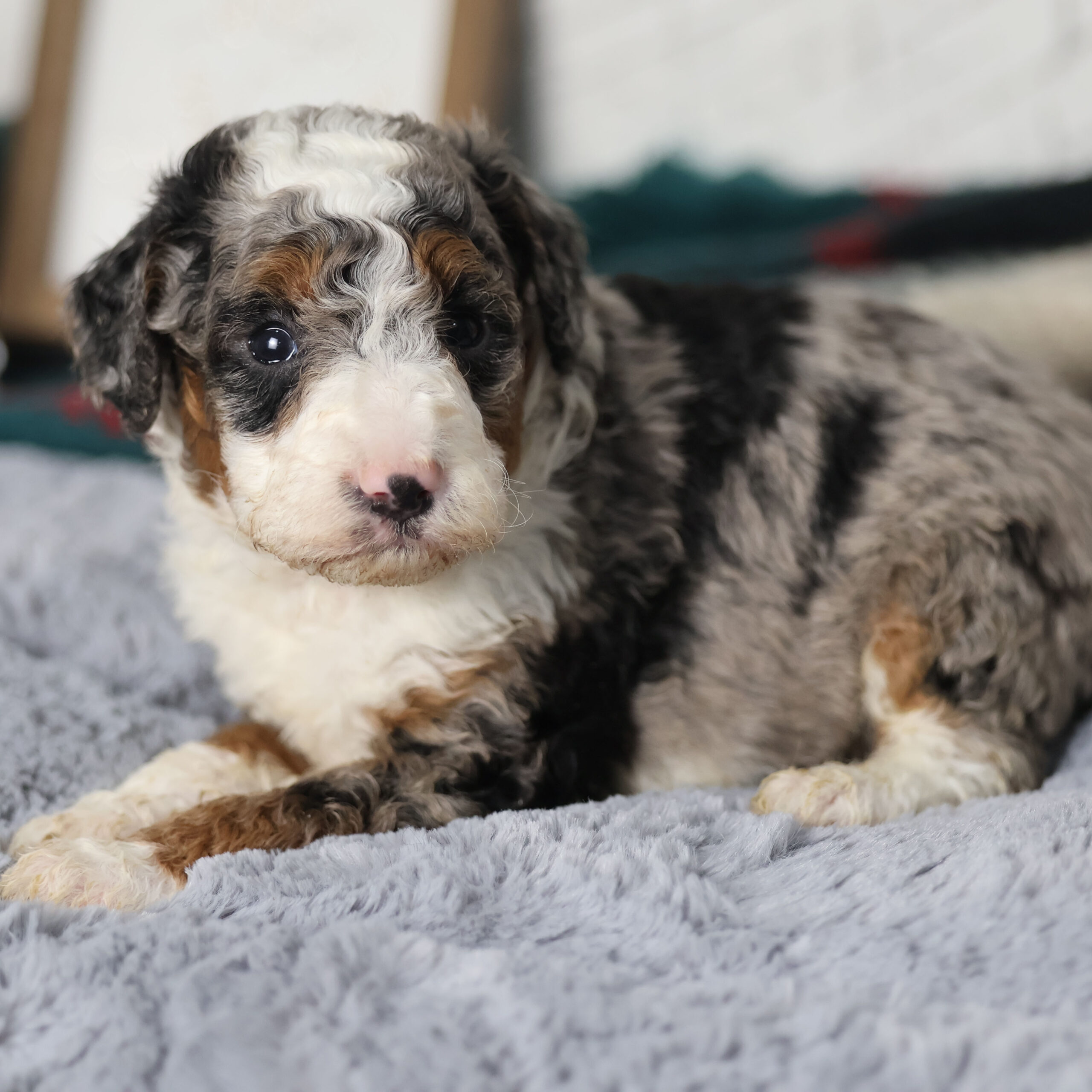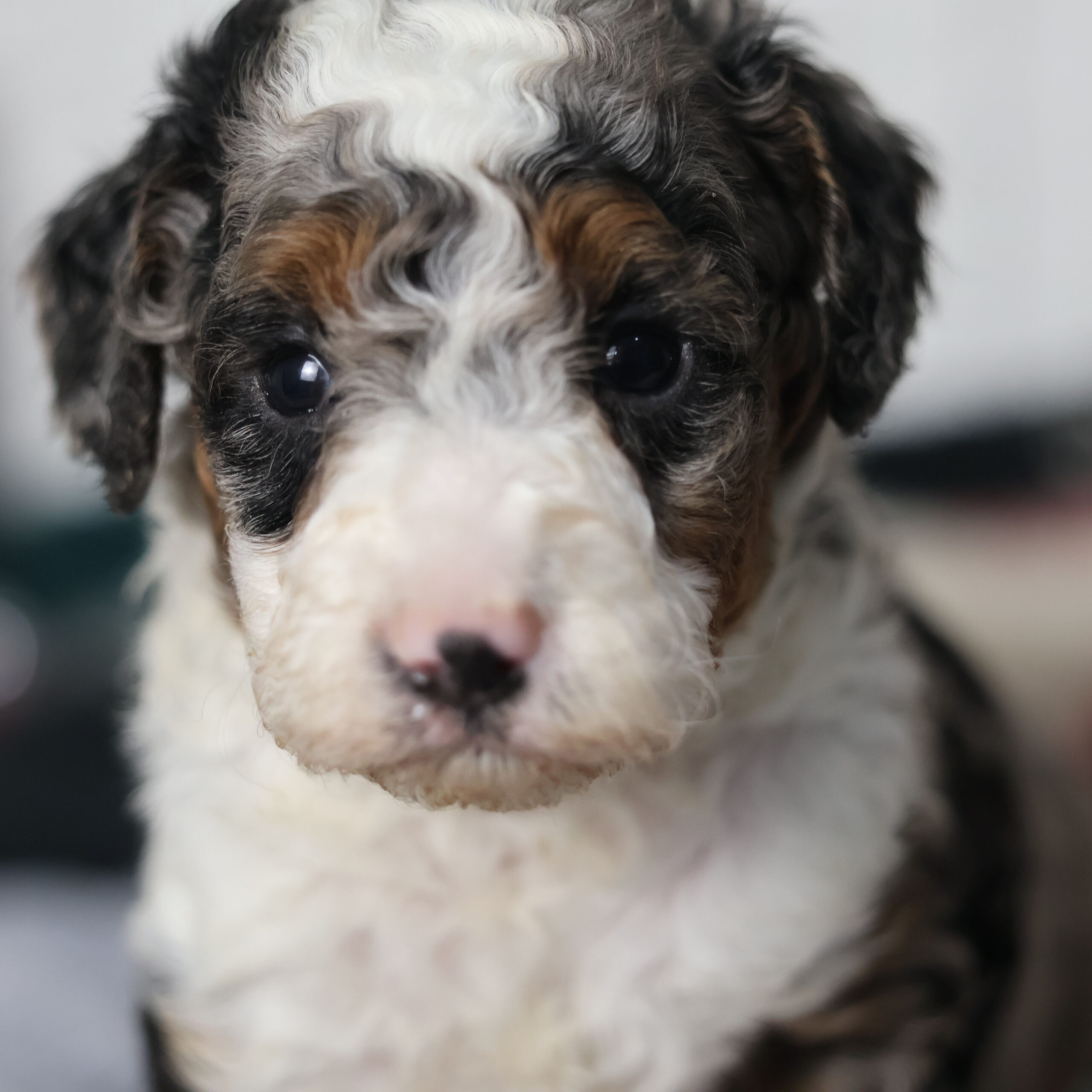 Meet Mr. Blue, the Bernedoodle dad with a coat dreams are made of! His dreamy merle curly coat shimmers with unique shades of silver, slate, and charcoal, each curl a testament to his stunning genetics. Beyond his captivating looks, Mr. Blue is pure joy. He approaches every day with an infectious enthusiasm, his tail wagging a happy rhythm. Whether he’s romping in the park, enjoying a cuddle, or just observing the world with a gentle gaze, his joy for life is undeniable. He’s a magnificent boy, inside and out.