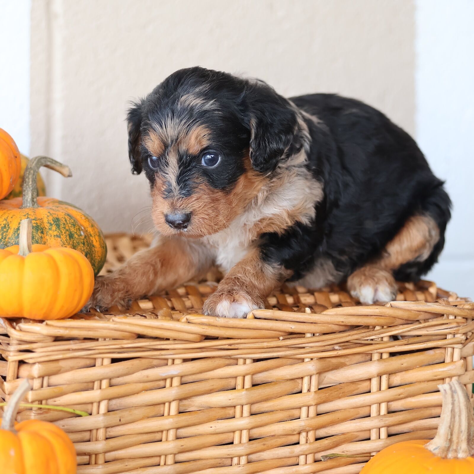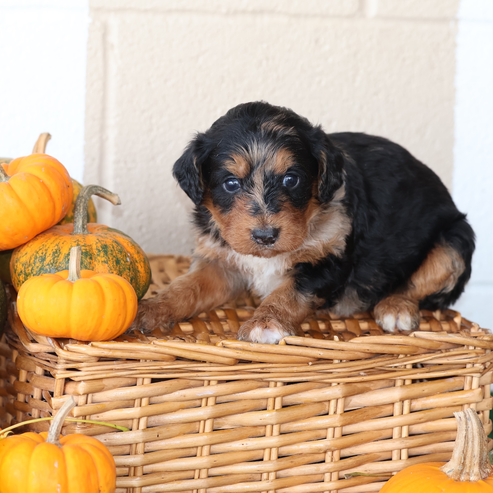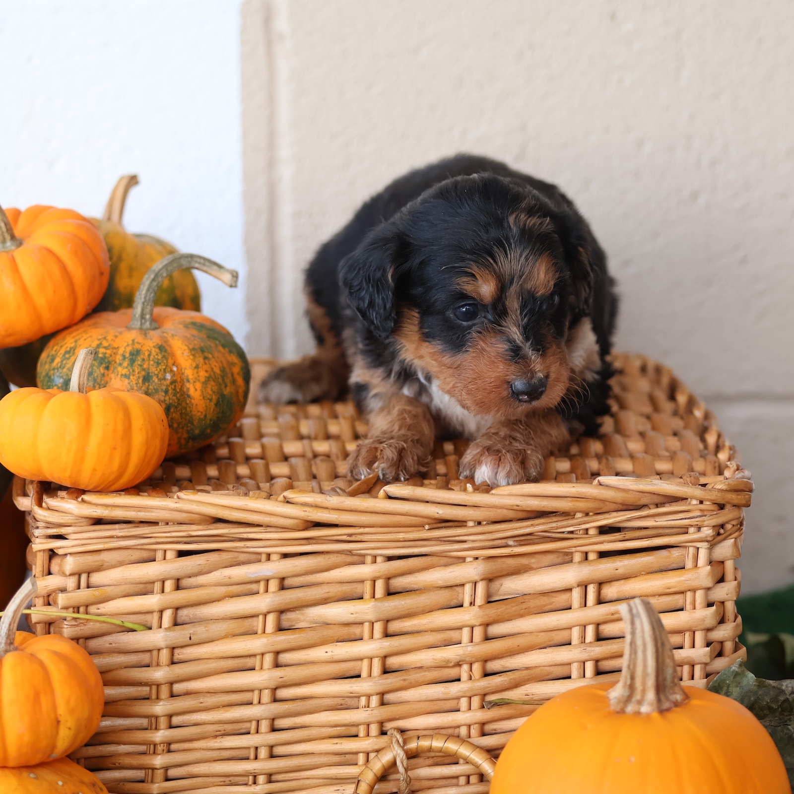 Tammy is a stunning F1 Bernedoodle mom whose charm is impossible to overlook. Her traditional black tri-color coat is a perfect blend of silky black, warm rust, and crisp white — a timeless Bernedoodle look that feels both classic and comforting. What makes Tammy truly stand out, though, is the texture of her coat. It’s beautifully curly yet incredibly soft to the touch, like a luxurious blanket that invites cuddles. Whether she’s trotting across the yard or lying in the sunshine, her curls bounce gently with every move, giving her an effortlessly elegant presence. Beyond her gorgeous appearance, Tammy has a personality that radiates pure joy. She’s a smiley girl through and through — always wearing a happy expression that makes everyone around her feel lighter. Whether she’s playing with her favorite toy, greeting visitors with enthusiasm, or simply lounging contentedly after a walk, her cheerful nature shines bright. She approaches everything she does with heart and a wagging tail, bringing warmth and laughter to every moment. Tammy’s gentle intelligence and affectionate spirit also make her an exceptional mom. She’s attentive, patient, and nurturing, always ensuring her puppies feel safe and loved. Her combination of beauty, kindness, and a joyful soul makes her a true treasure in every way. With her soft, curly coat and constant smile, Tammy embodies everything people adore about Bernedoodles — a perfect mix of elegance, sweetness, and genuine happiness.