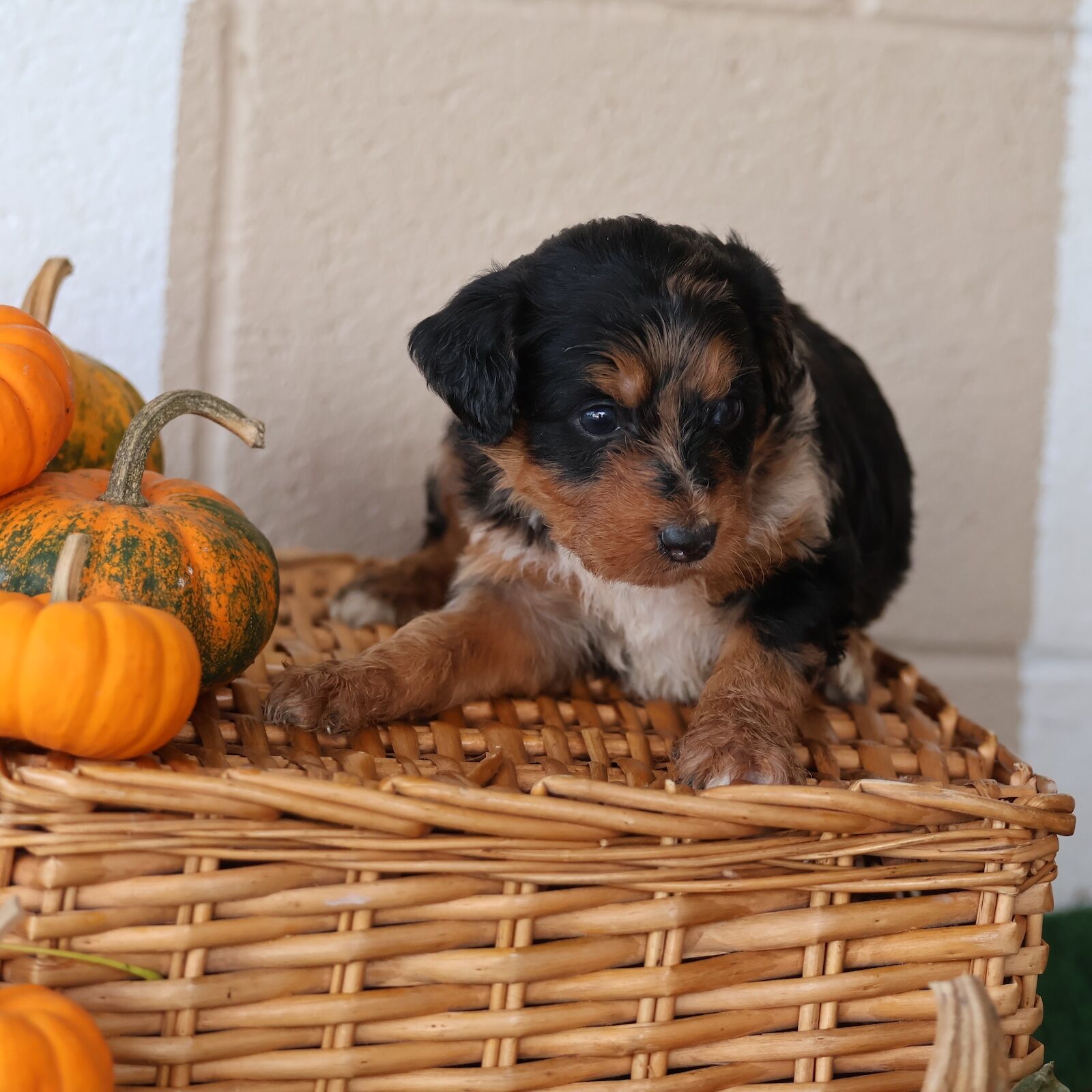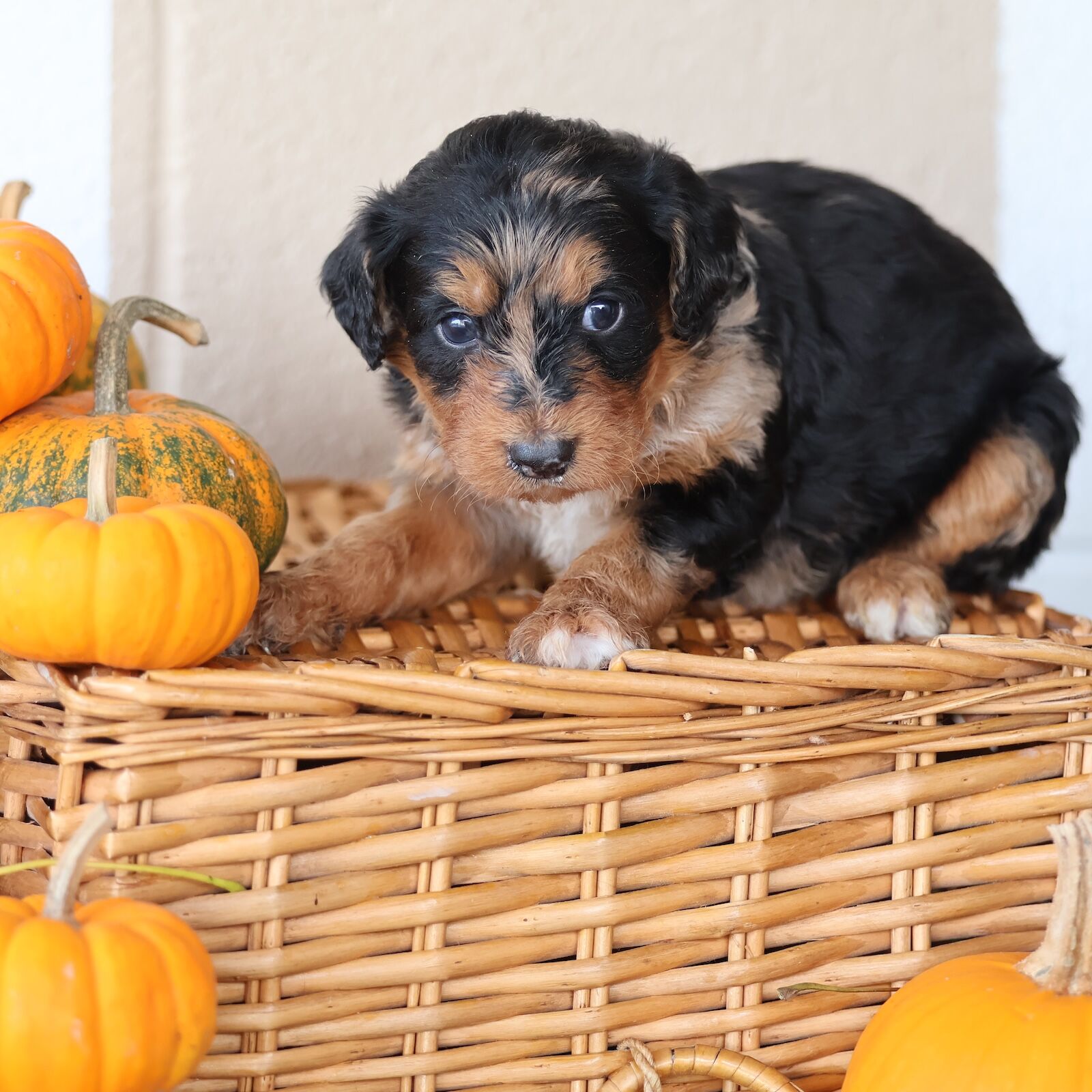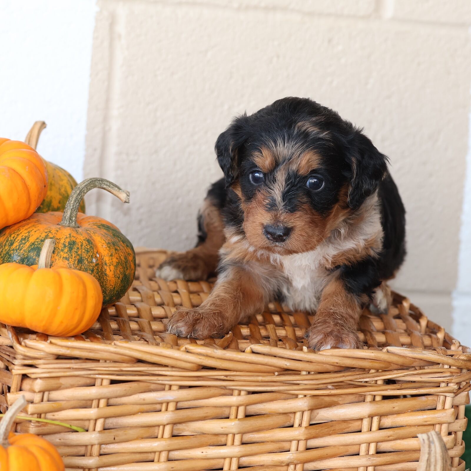 Tammy is a stunning F1 Bernedoodle mom whose charm is impossible to overlook. Her traditional black tri-color coat is a perfect blend of silky black, warm rust, and crisp white — a timeless Bernedoodle look that feels both classic and comforting. What makes Tammy truly stand out, though, is the texture of her coat. It’s beautifully curly yet incredibly soft to the touch, like a luxurious blanket that invites cuddles. Whether she’s trotting across the yard or lying in the sunshine, her curls bounce gently with every move, giving her an effortlessly elegant presence. Beyond her gorgeous appearance, Tammy has a personality that radiates pure joy. She’s a smiley girl through and through — always wearing a happy expression that makes everyone around her feel lighter. Whether she’s playing with her favorite toy, greeting visitors with enthusiasm, or simply lounging contentedly after a walk, her cheerful nature shines bright. She approaches everything she does with heart and a wagging tail, bringing warmth and laughter to every moment. Tammy’s gentle intelligence and affectionate spirit also make her an exceptional mom. She’s attentive, patient, and nurturing, always ensuring her puppies feel safe and loved. Her combination of beauty, kindness, and a joyful soul makes her a true treasure in every way. With her soft, curly coat and constant smile, Tammy embodies everything people adore about Bernedoodles — a perfect mix of elegance, sweetness, and genuine happiness.