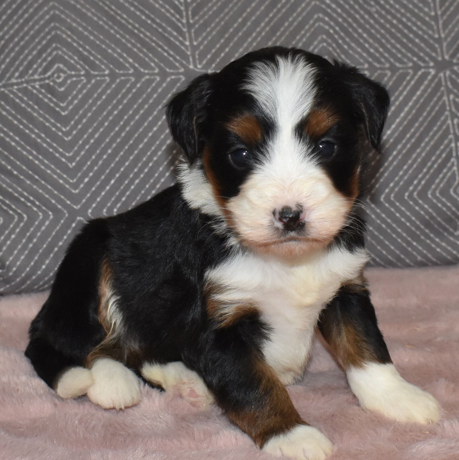 If you have been looking for the “quintessential” Bernedoodle look, meet Athena! This stunning girl is a traditional tricolor masterpiece. She features a lush, jet-black coat with perfectly symmetrical rust-colored “eyebrows” and cheeks, accented by a crisp white blaze and four white “socks.”