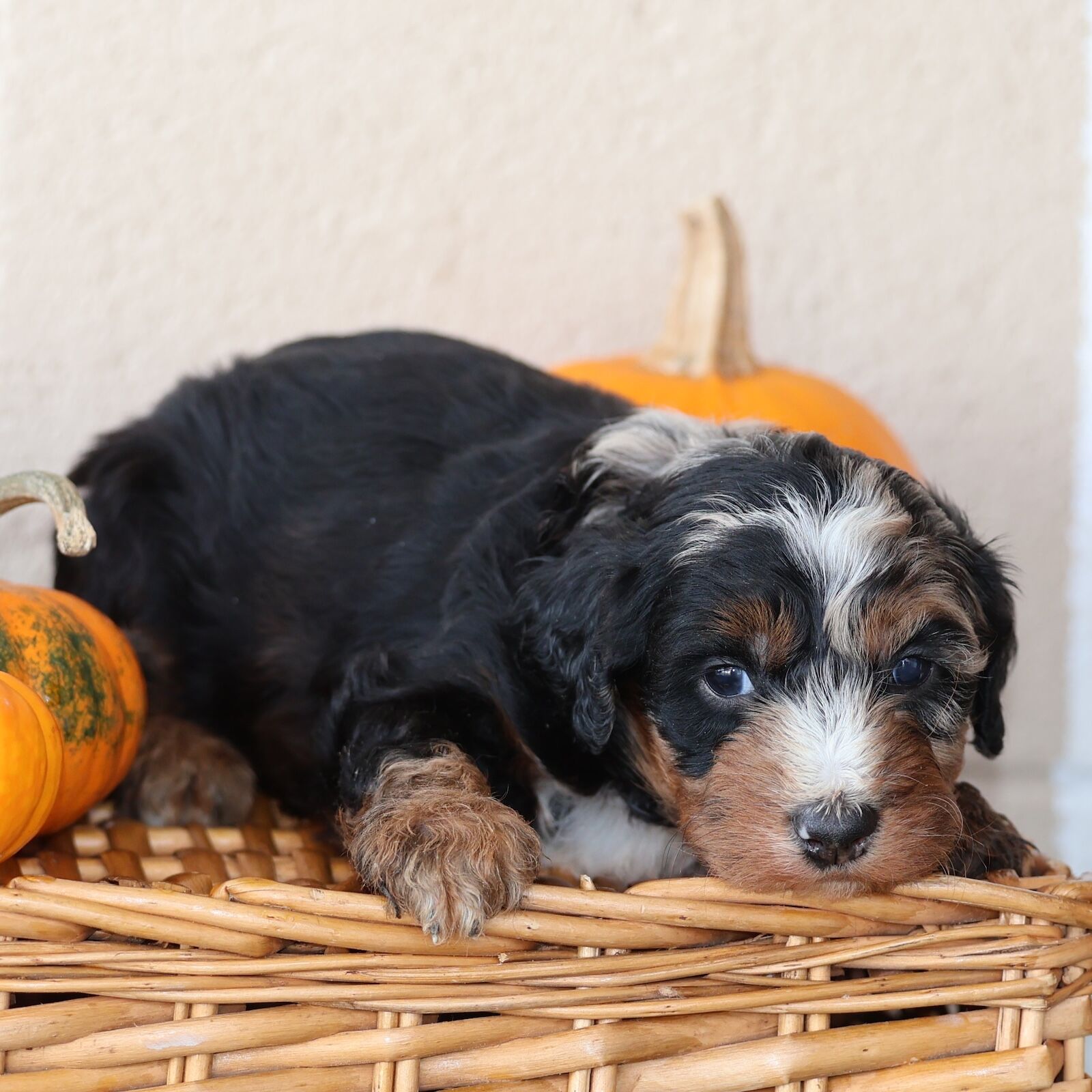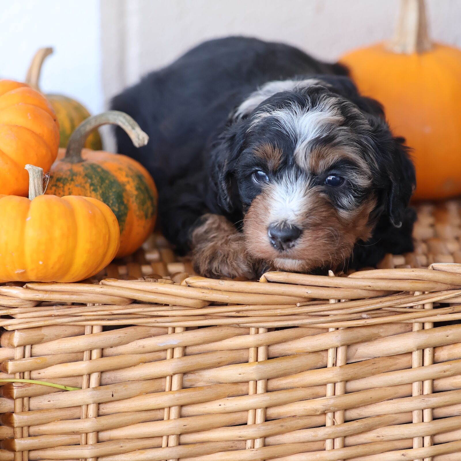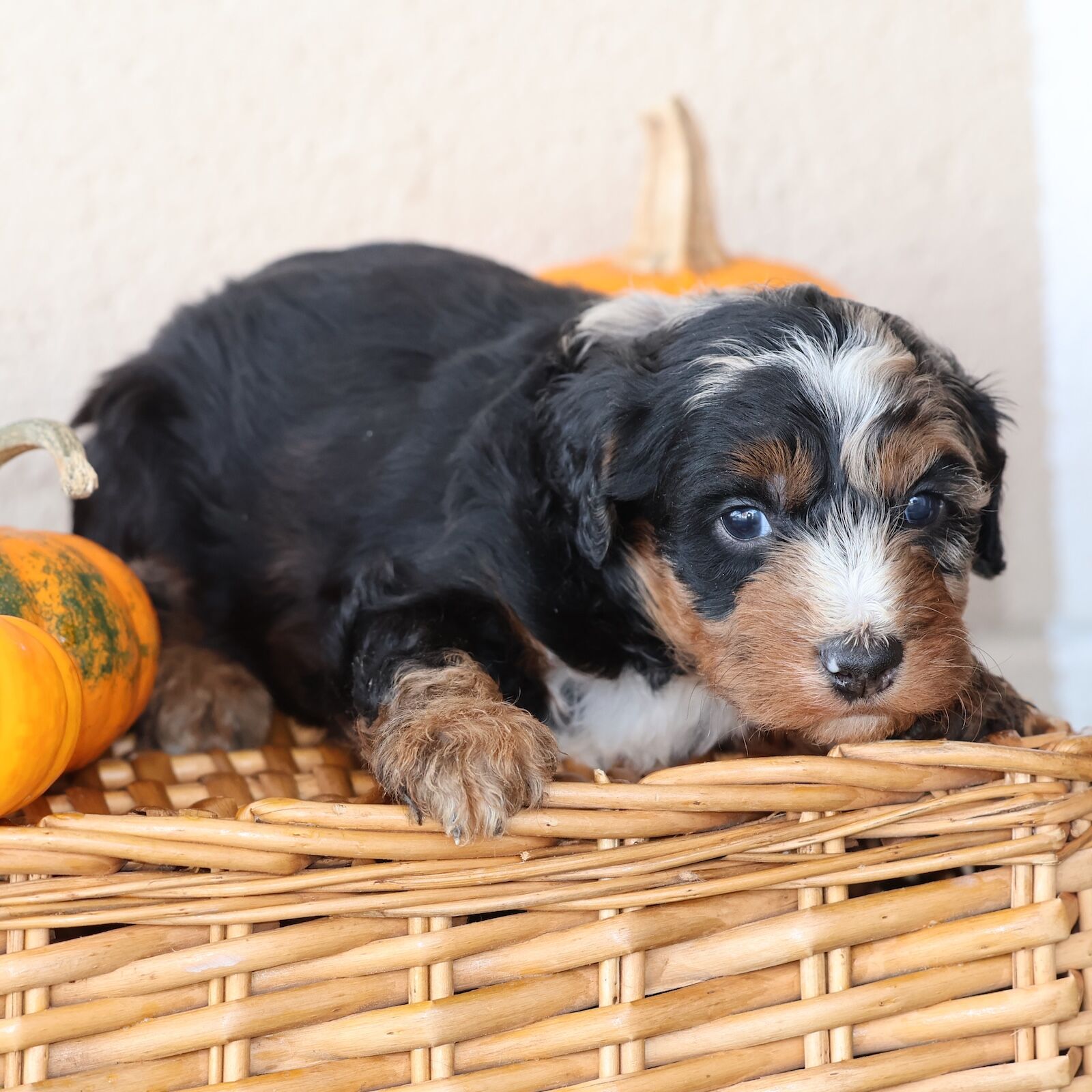 Tammy is a stunning F1 Bernedoodle mom whose charm is impossible to overlook. Her traditional black tri-color coat is a perfect blend of silky black, warm rust, and crisp white — a timeless Bernedoodle look that feels both classic and comforting. What makes Tammy truly stand out, though, is the texture of her coat. It’s beautifully curly yet incredibly soft to the touch, like a luxurious blanket that invites cuddles. Whether she’s trotting across the yard or lying in the sunshine, her curls bounce gently with every move, giving her an effortlessly elegant presence. Beyond her gorgeous appearance, Tammy has a personality that radiates pure joy. She’s a smiley girl through and through — always wearing a happy expression that makes everyone around her feel lighter. Whether she’s playing with her favorite toy, greeting visitors with enthusiasm, or simply lounging contentedly after a walk, her cheerful nature shines bright. She approaches everything she does with heart and a wagging tail, bringing warmth and laughter to every moment. Tammy’s gentle intelligence and affectionate spirit also make her an exceptional mom. She’s attentive, patient, and nurturing, always ensuring her puppies feel safe and loved. Her combination of beauty, kindness, and a joyful soul makes her a true treasure in every way. With her soft, curly coat and constant smile, Tammy embodies everything people adore about Bernedoodles — a perfect mix of elegance, sweetness, and genuine happiness.