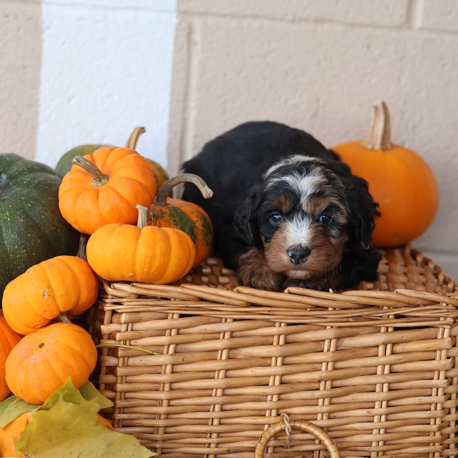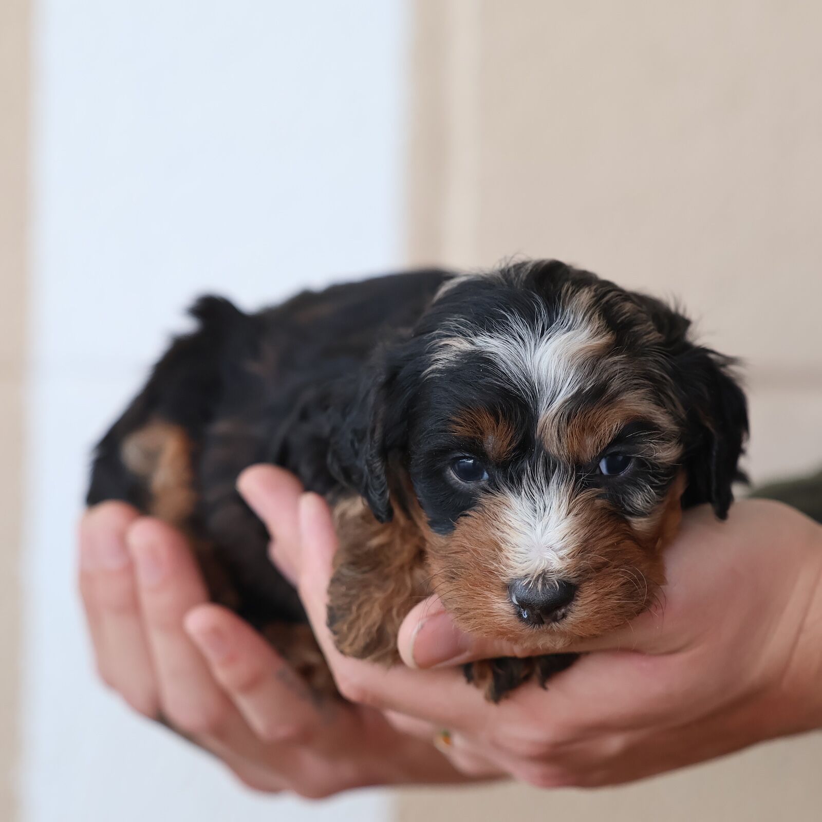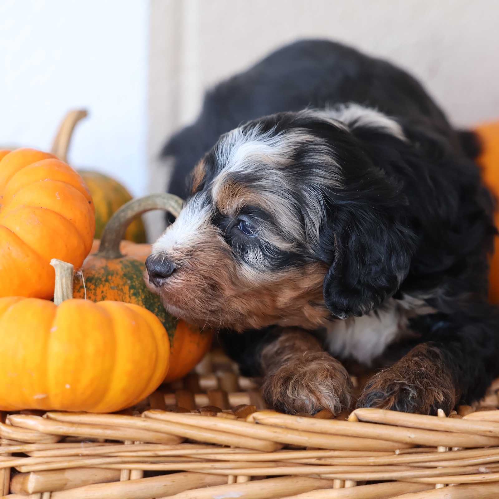 Tammy is a stunning F1 Bernedoodle mom whose charm is impossible to overlook. Her traditional black tri-color coat is a perfect blend of silky black, warm rust, and crisp white — a timeless Bernedoodle look that feels both classic and comforting. What makes Tammy truly stand out, though, is the texture of her coat. It’s beautifully curly yet incredibly soft to the touch, like a luxurious blanket that invites cuddles. Whether she’s trotting across the yard or lying in the sunshine, her curls bounce gently with every move, giving her an effortlessly elegant presence. Beyond her gorgeous appearance, Tammy has a personality that radiates pure joy. She’s a smiley girl through and through — always wearing a happy expression that makes everyone around her feel lighter. Whether she’s playing with her favorite toy, greeting visitors with enthusiasm, or simply lounging contentedly after a walk, her cheerful nature shines bright. She approaches everything she does with heart and a wagging tail, bringing warmth and laughter to every moment. Tammy’s gentle intelligence and affectionate spirit also make her an exceptional mom. She’s attentive, patient, and nurturing, always ensuring her puppies feel safe and loved. Her combination of beauty, kindness, and a joyful soul makes her a true treasure in every way. With her soft, curly coat and constant smile, Tammy embodies everything people adore about Bernedoodles — a perfect mix of elegance, sweetness, and genuine happiness.