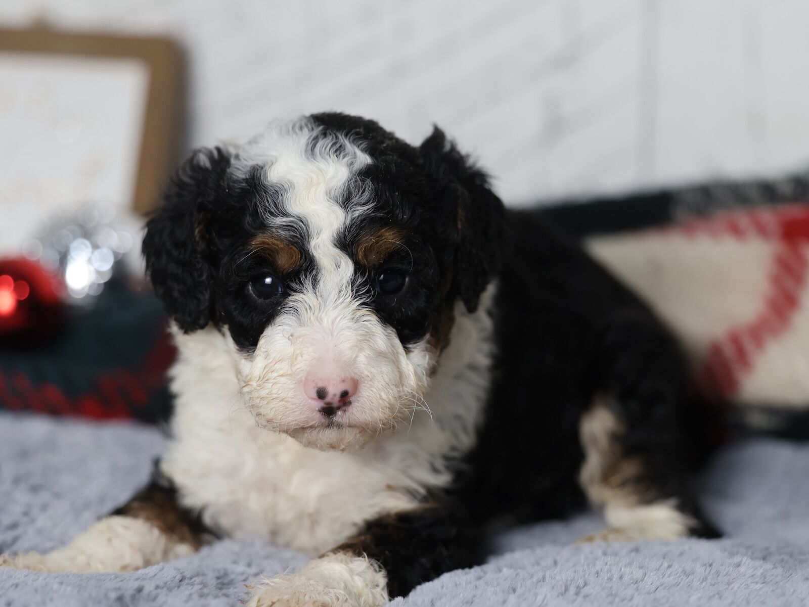 Meet Mr. Blue, the Bernedoodle dad with a coat dreams are made of! His dreamy merle curly coat shimmers with unique shades of silver, slate, and charcoal, each curl a testament to his stunning genetics. Beyond his captivating looks, Mr. Blue is pure joy. He approaches every day with an infectious enthusiasm, his tail wagging a happy rhythm. Whether he’s romping in the park, enjoying a cuddle, or just observing the world with a gentle gaze, his joy for life is undeniable. He’s a magnificent boy, inside and out.