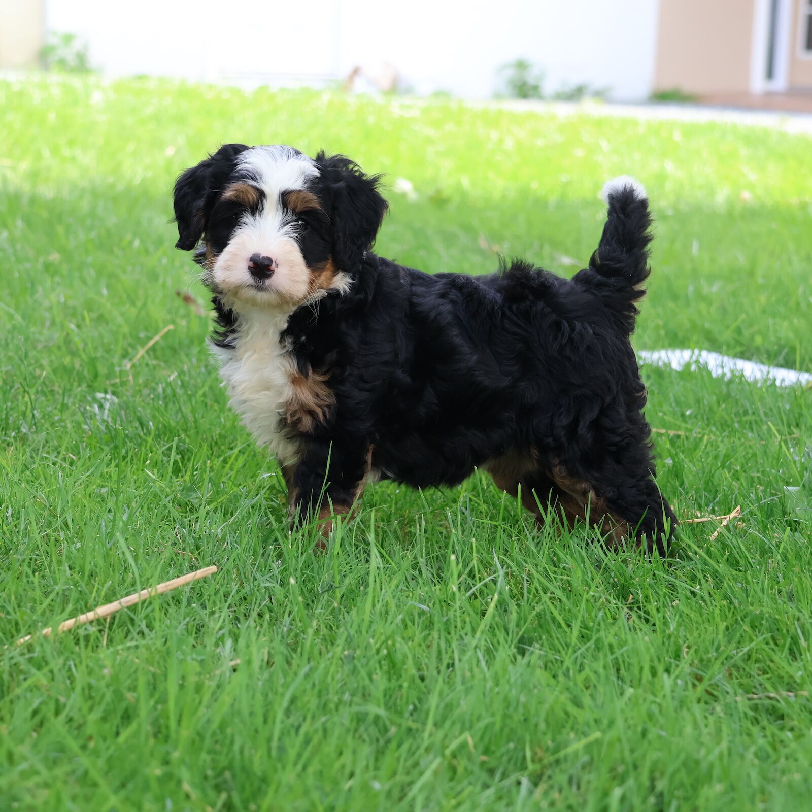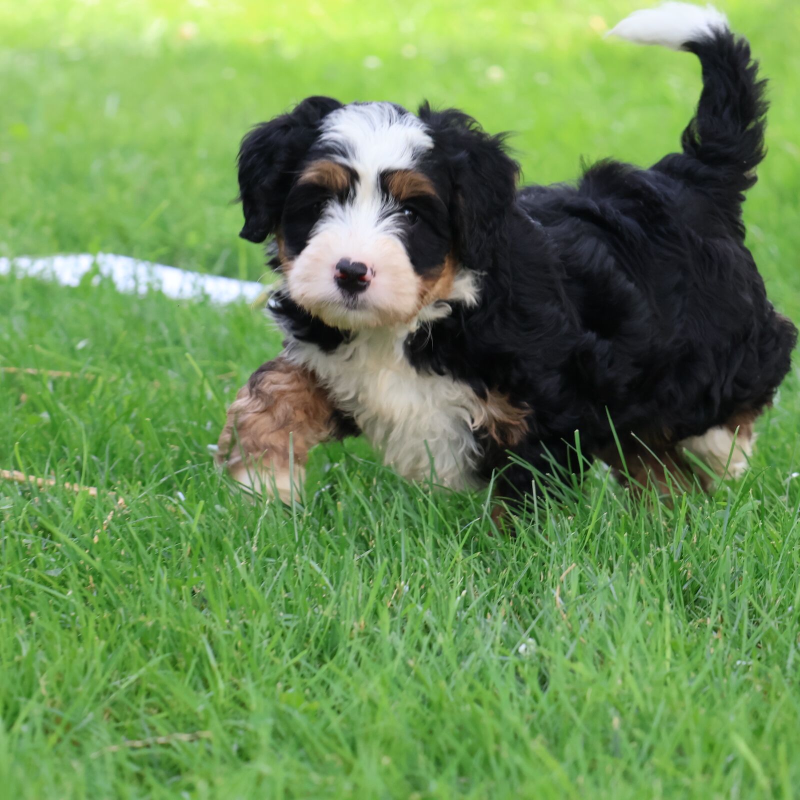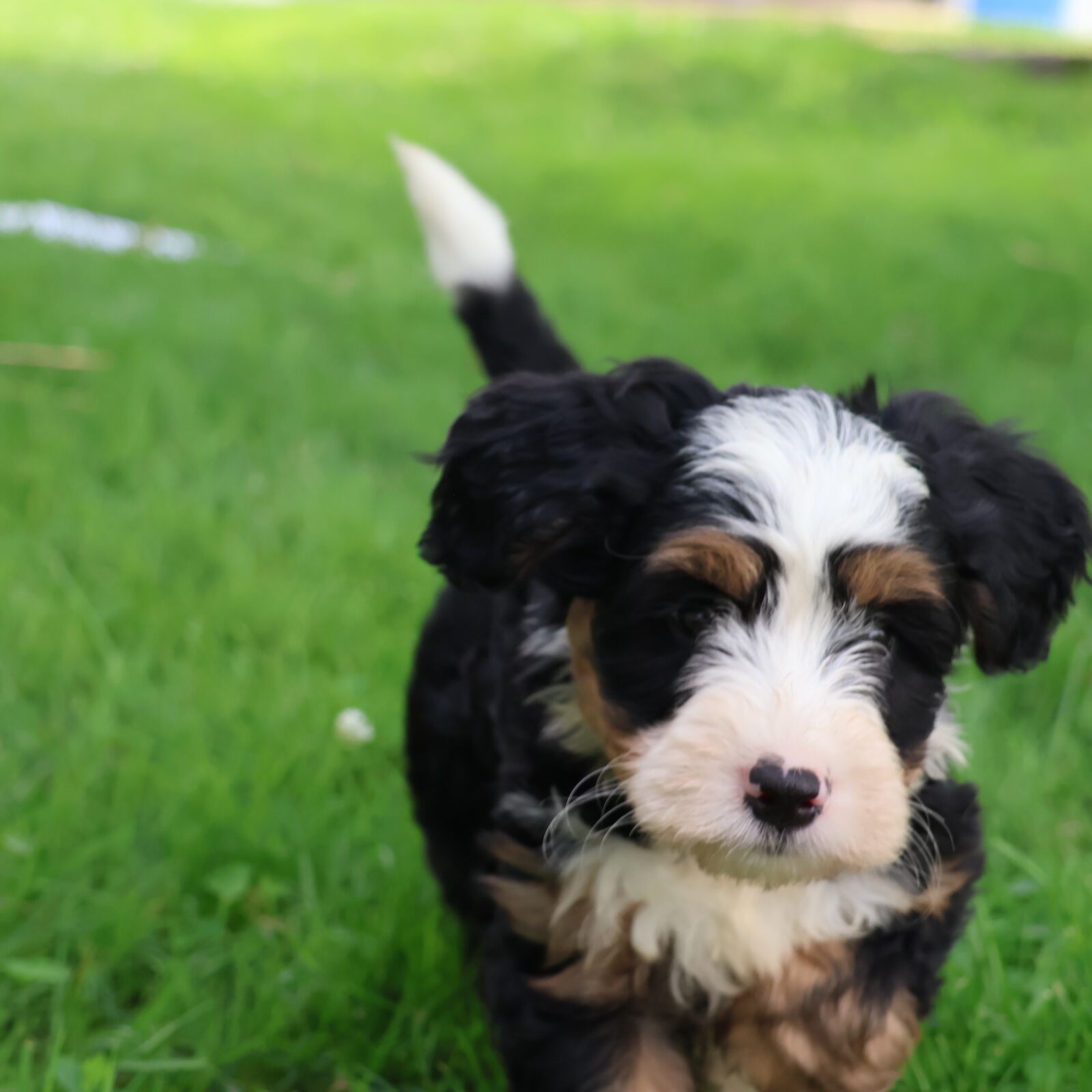 Meet Tulip, our stunning Bernedoodle mom whose joyful nature and gorgeous looks are truly captivating! Tulip boasts a magnificent, curly black tri coat that’s a testament to her excellent lineage. Her vibrant personality shines through in everything she does, from her playful antics to her loving cuddles. We’re so proud to see her wonderful traits, especially that beautiful coat and happy-go-lucky disposition, passed down to her adorable puppies. If you’re looking for a pup with a fantastic temperament and a show-stopping look, Tulip’s pups are sure to steal your heart!
