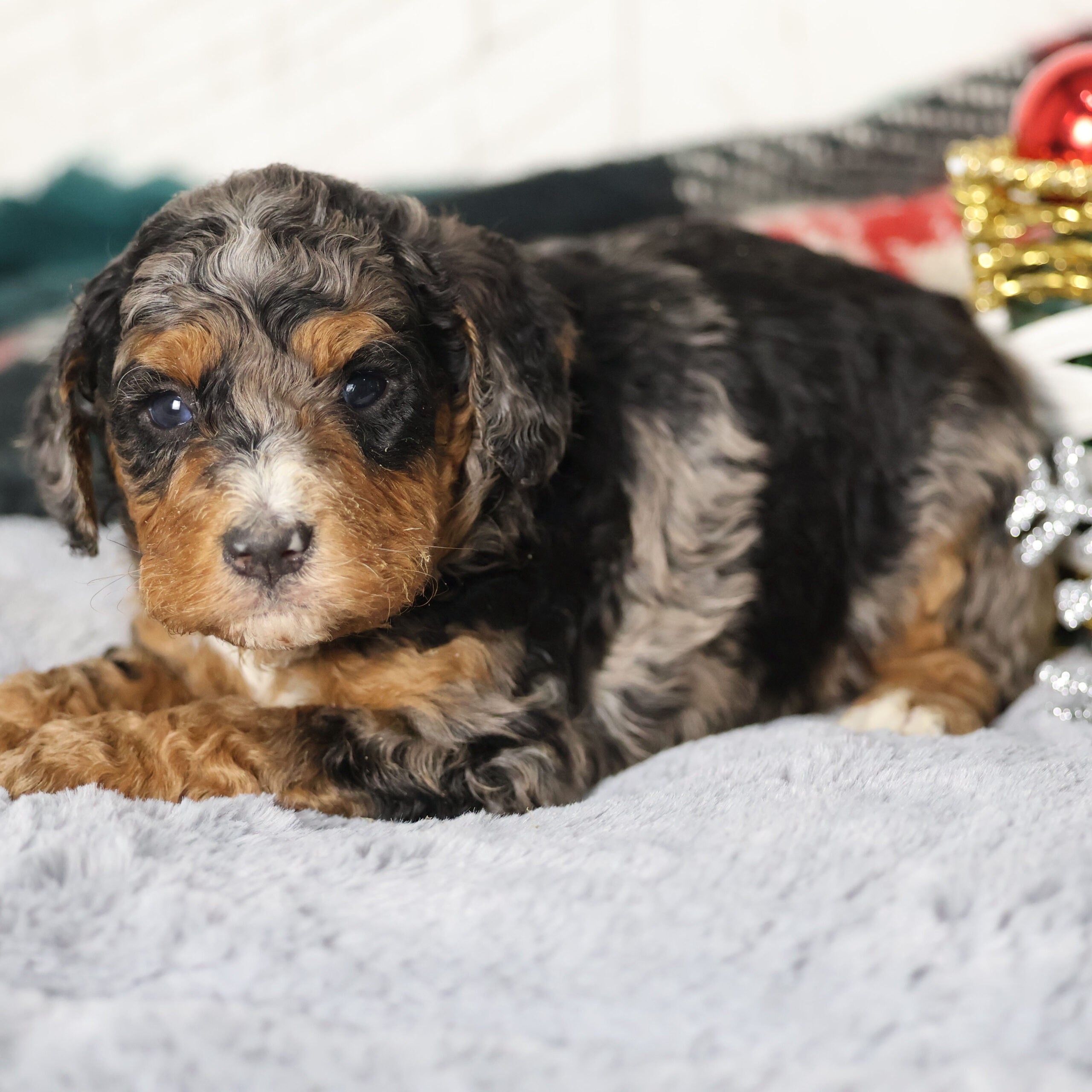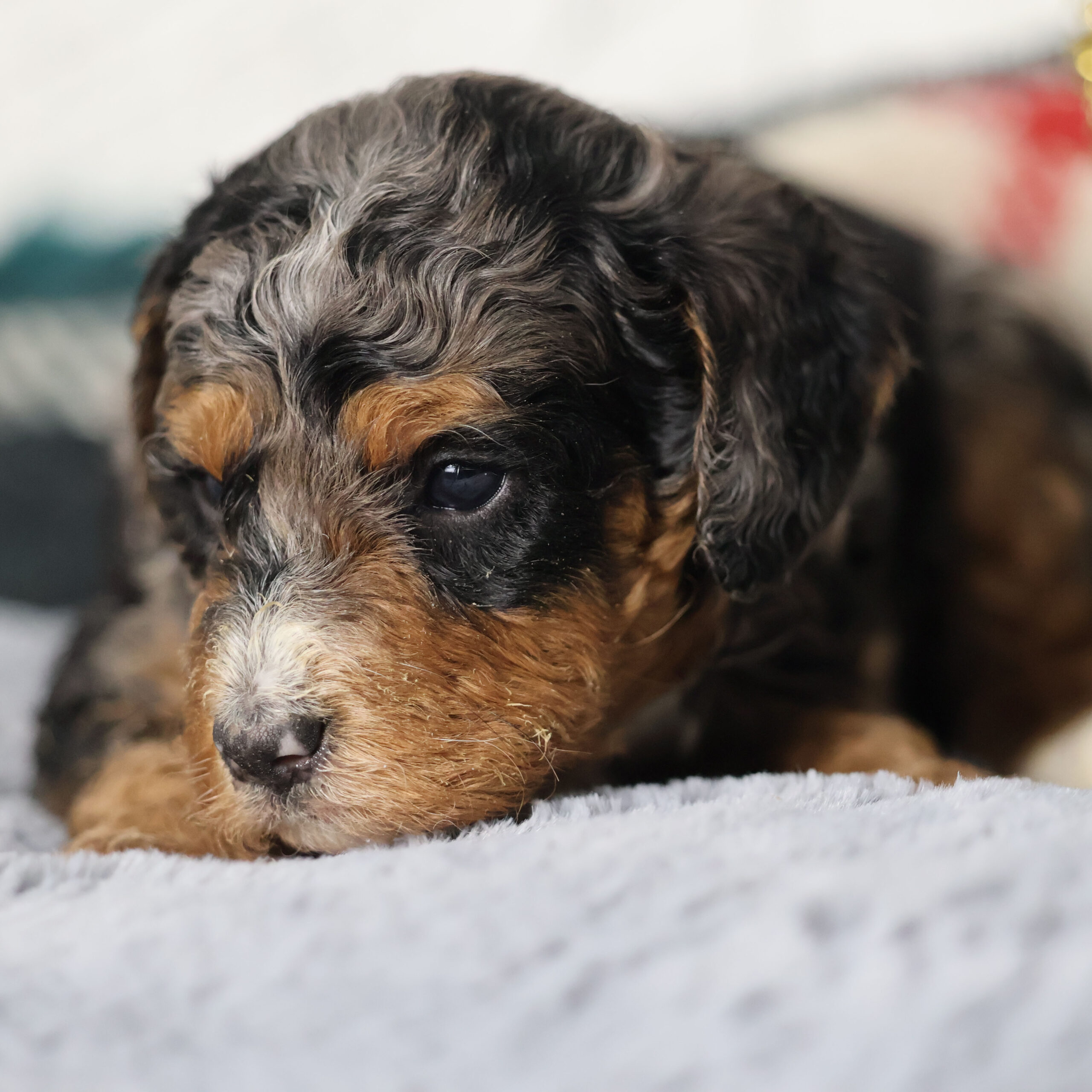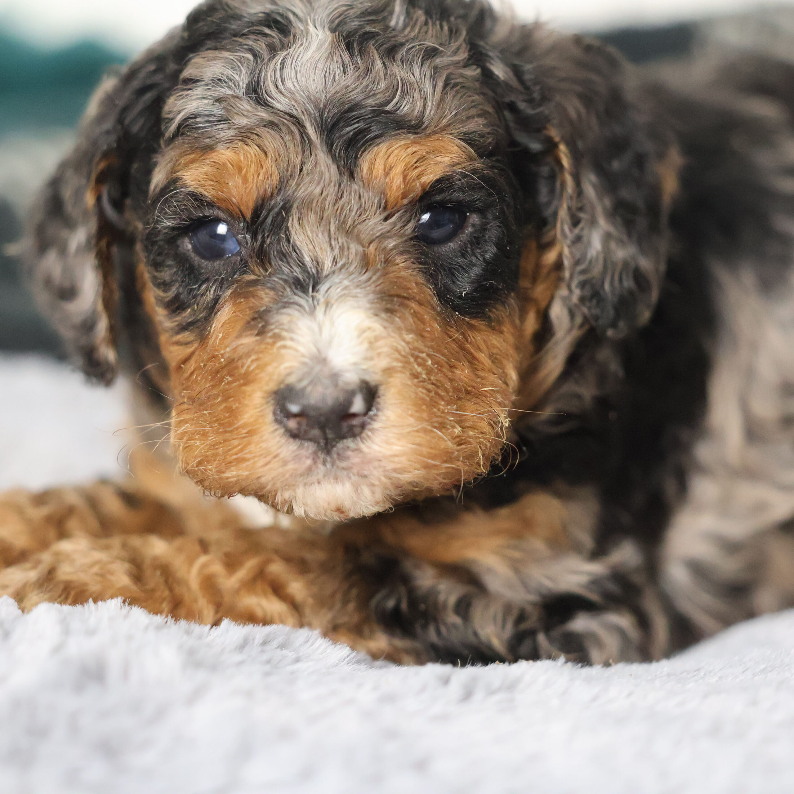 Meet Mr. Blue, the Bernedoodle dad with a coat dreams are made of! His dreamy merle curly coat shimmers with unique shades of silver, slate, and charcoal, each curl a testament to his stunning genetics. Beyond his captivating looks, Mr. Blue is pure joy. He approaches every day with an infectious enthusiasm, his tail wagging a happy rhythm. Whether he’s romping in the park, enjoying a cuddle, or just observing the world with a gentle gaze, his joy for life is undeniable. He’s a magnificent boy, inside and out.