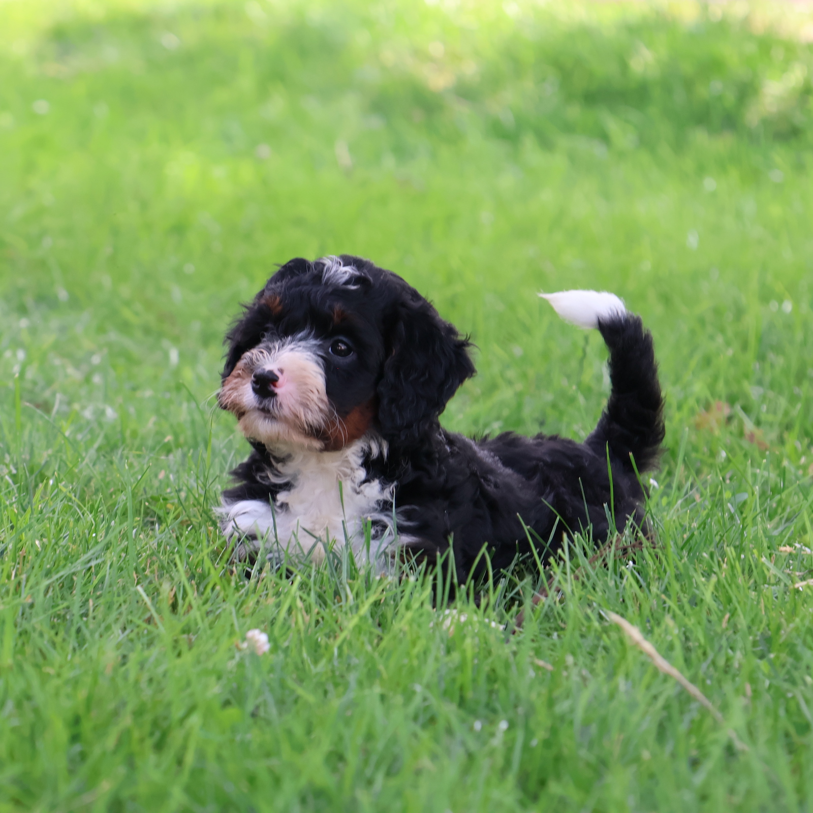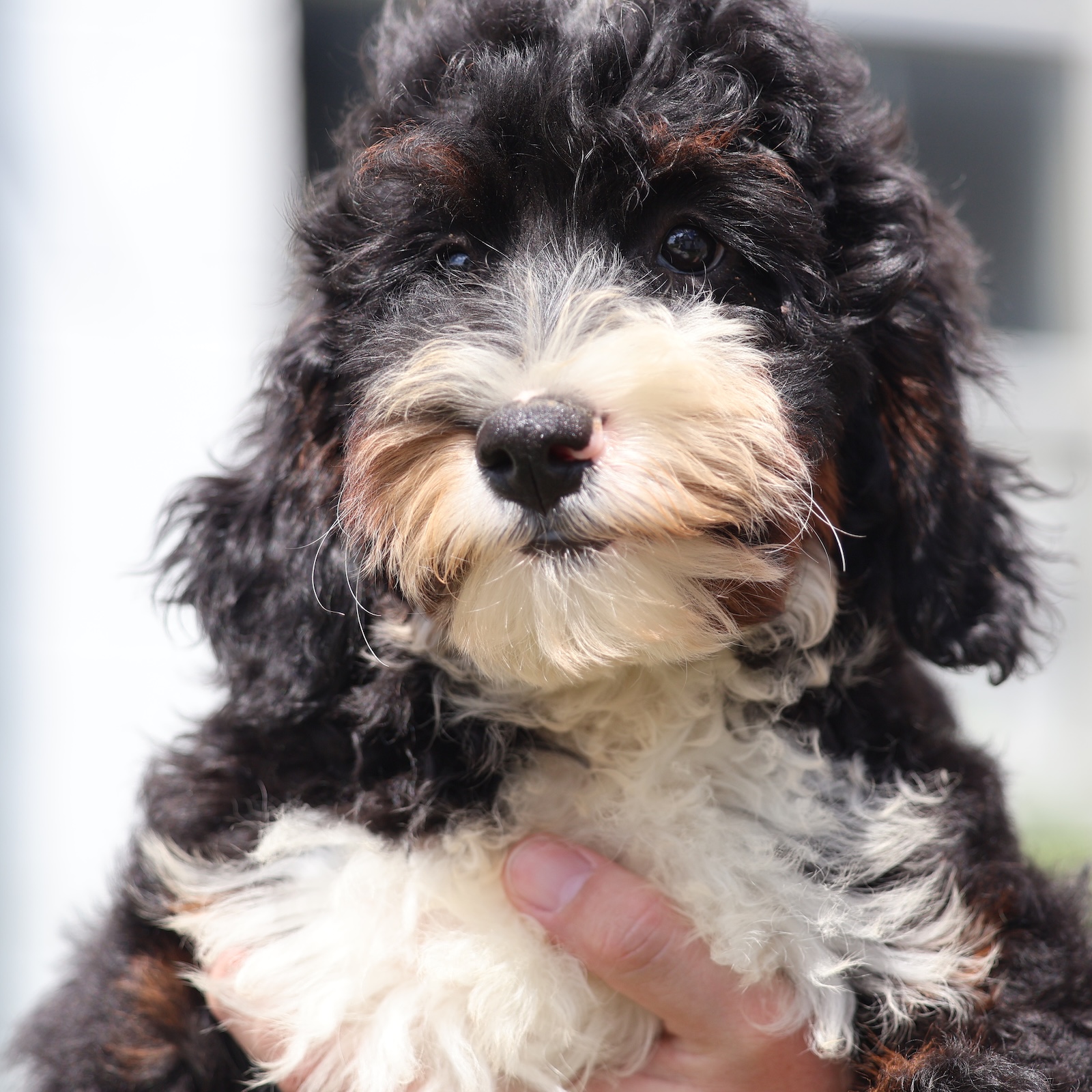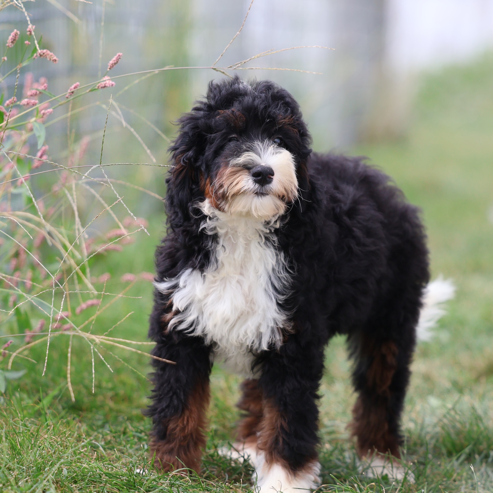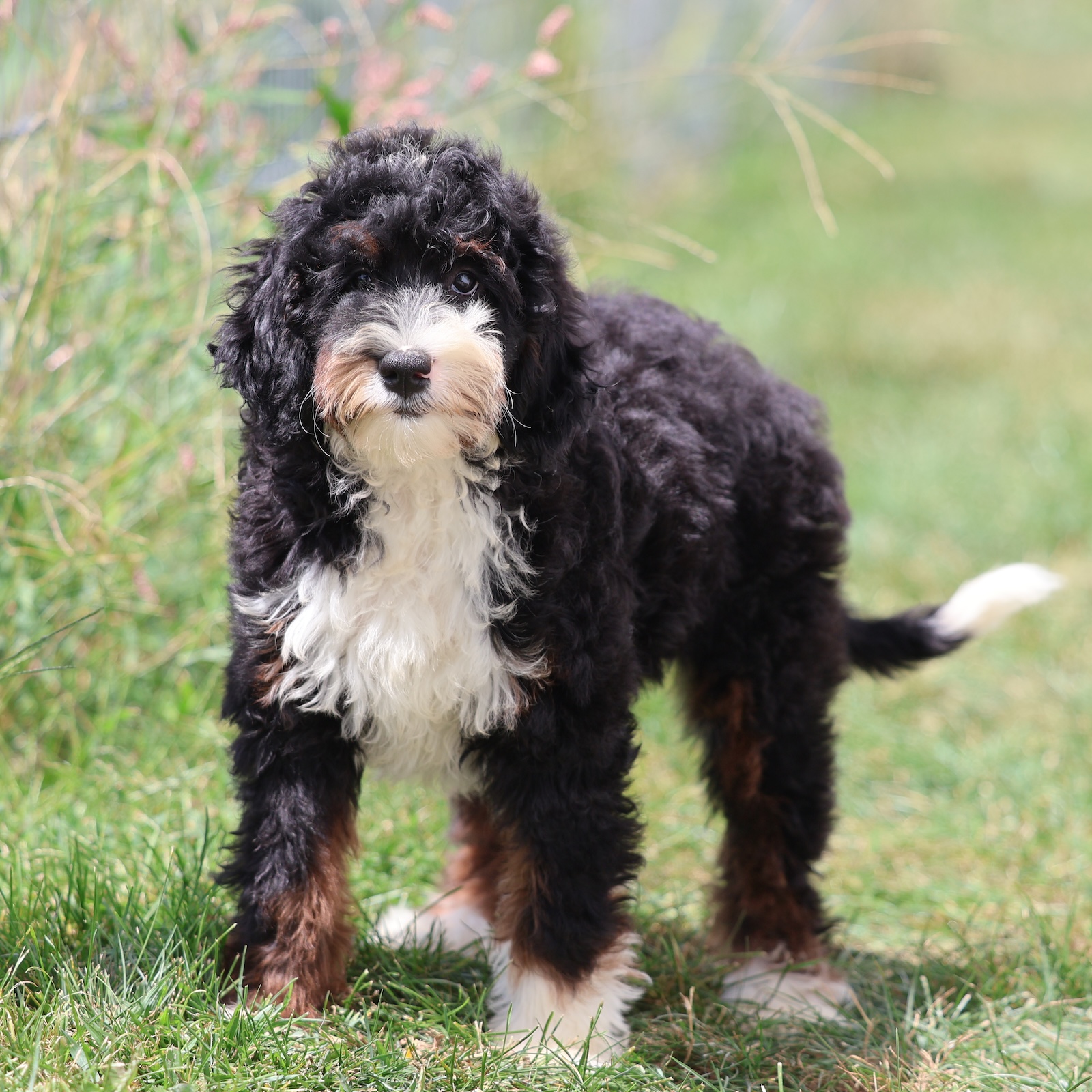 Meet Tulip, our stunning Bernedoodle mom whose joyful nature and gorgeous looks are truly captivating! Tulip boasts a magnificent, curly black tri coat that’s a testament to her excellent lineage. Her vibrant personality shines through in everything she does, from her playful antics to her loving cuddles. We’re so proud to see her wonderful traits, especially that beautiful coat and happy-go-lucky disposition, passed down to her adorable puppies. If you’re looking for a pup with a fantastic temperament and a show-stopping look, Tulip’s pups are sure to steal your heart!
