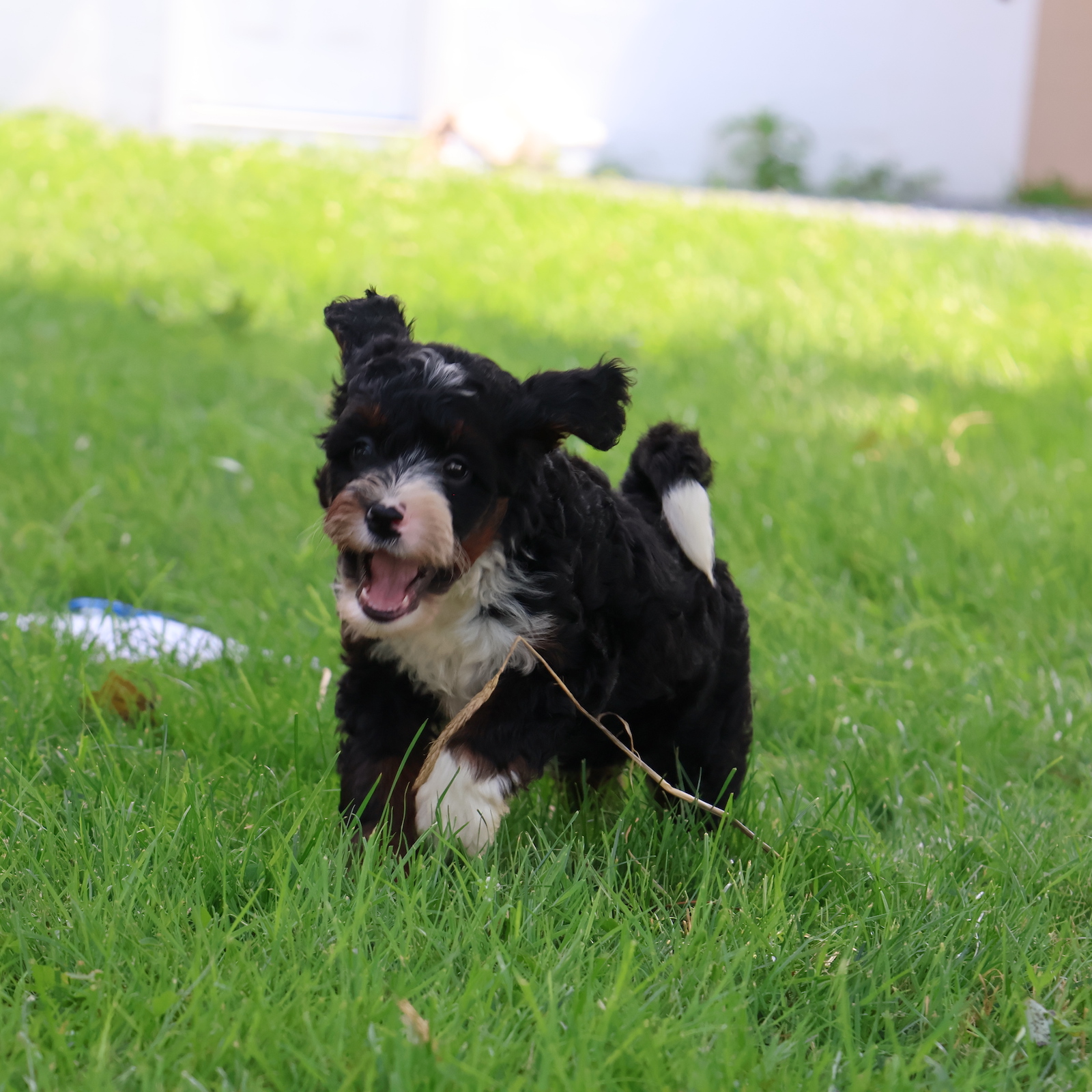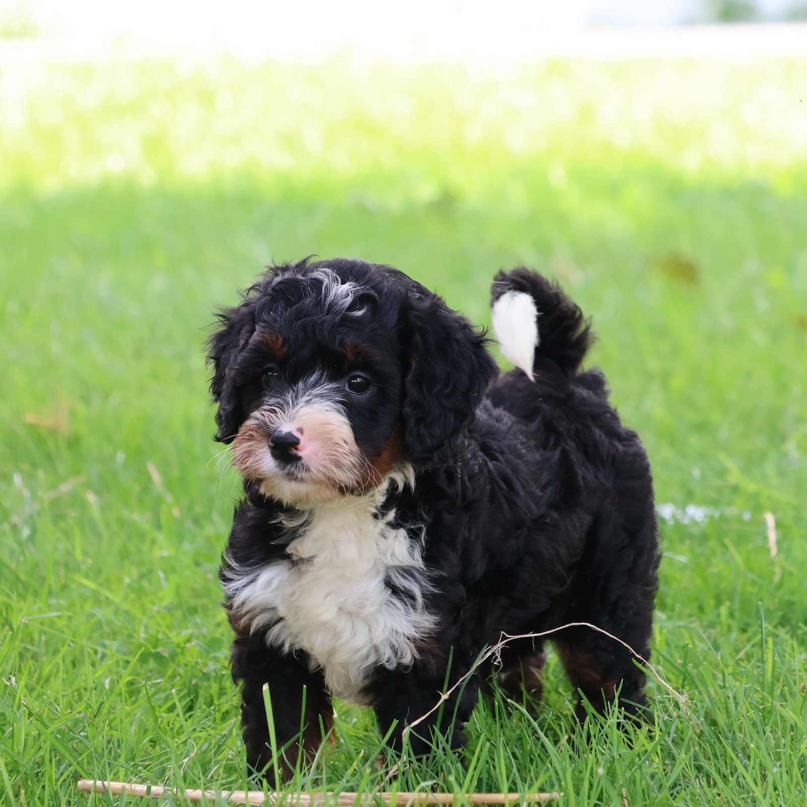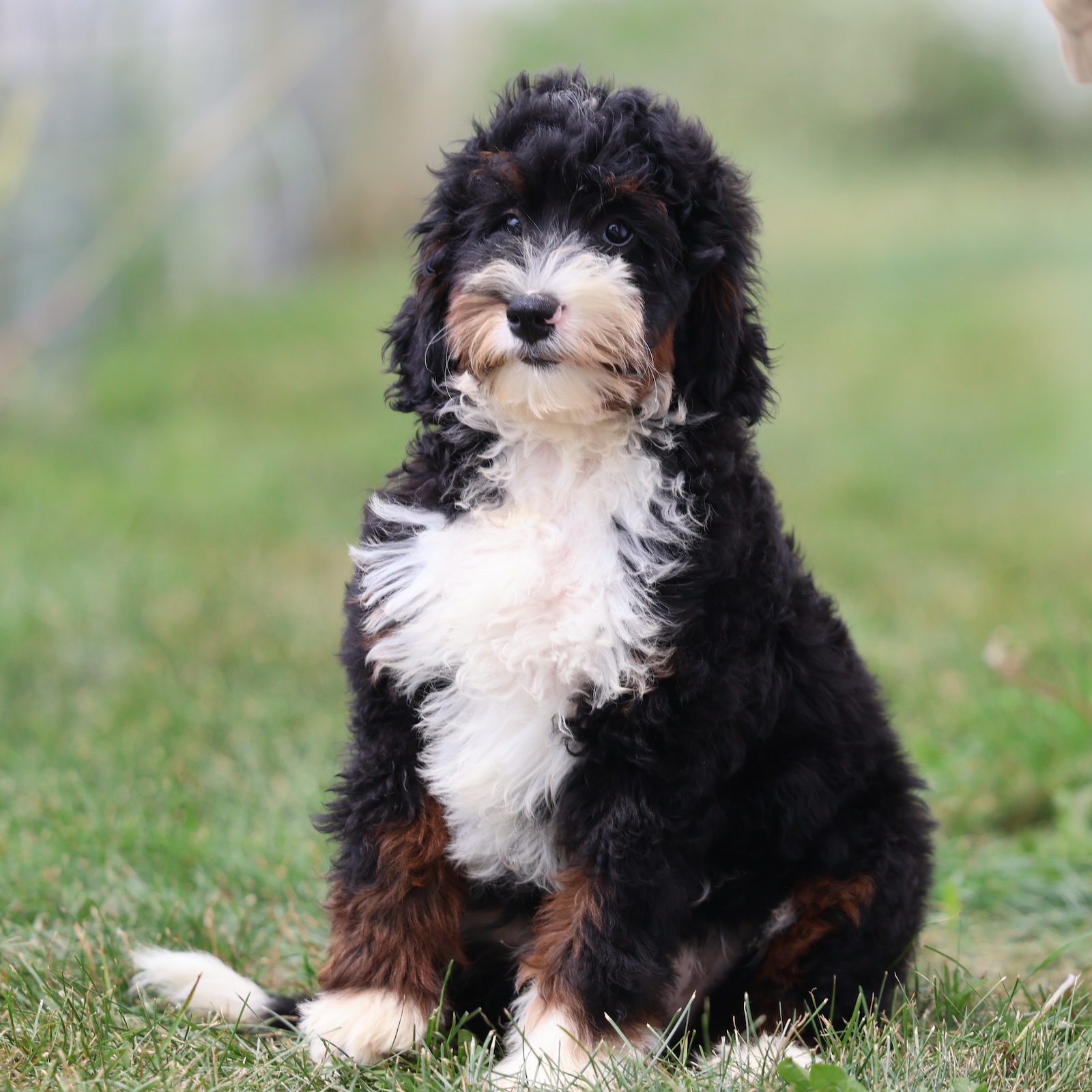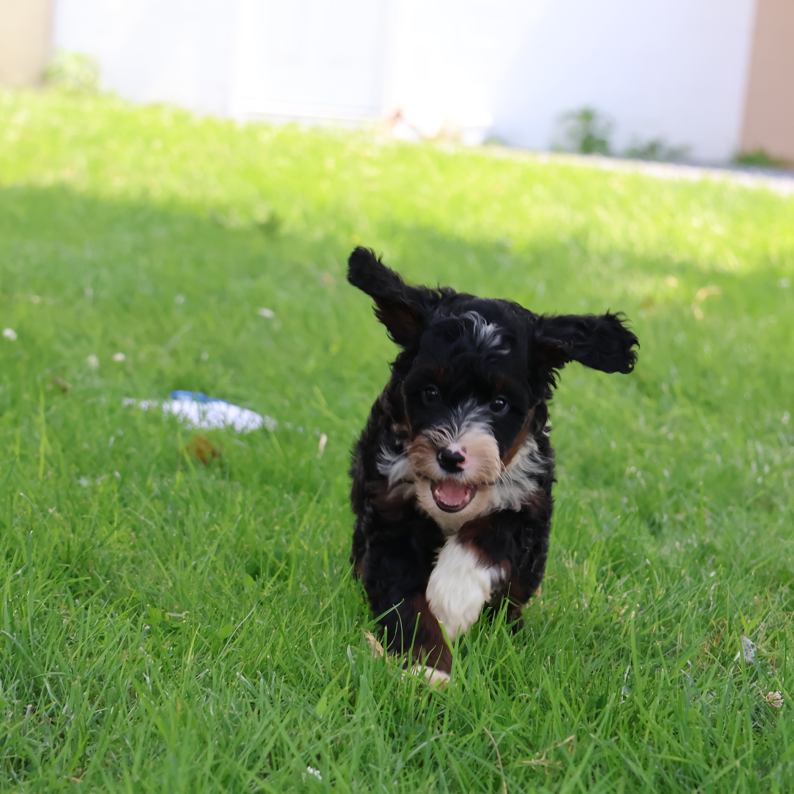 Meet Tulip, our stunning Bernedoodle mom whose joyful nature and gorgeous looks are truly captivating! Tulip boasts a magnificent, curly black tri coat that’s a testament to her excellent lineage. Her vibrant personality shines through in everything she does, from her playful antics to her loving cuddles. We’re so proud to see her wonderful traits, especially that beautiful coat and happy-go-lucky disposition, passed down to her adorable puppies. If you’re looking for a pup with a fantastic temperament and a show-stopping look, Tulip’s pups are sure to steal your heart!