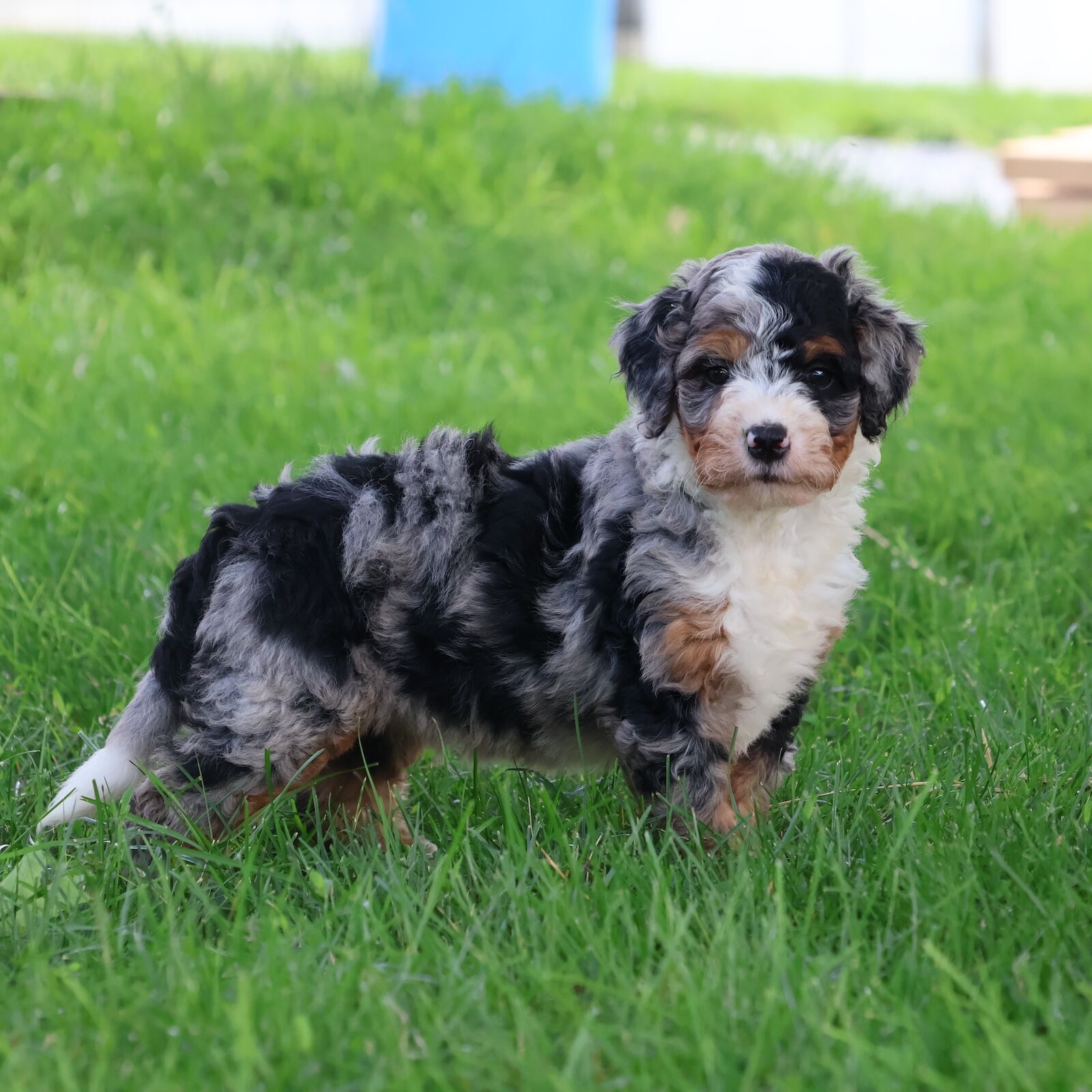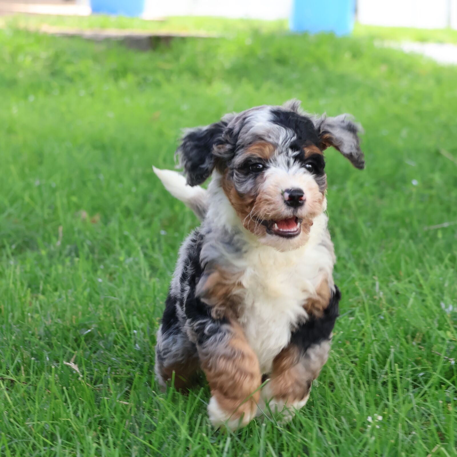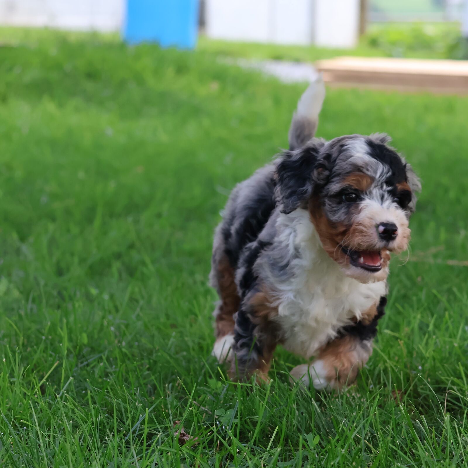 Meet Mr. Blue, the Bernedoodle dad with a coat dreams are made of! His dreamy merle curly coat shimmers with unique shades of silver, slate, and charcoal, each curl a testament to his stunning genetics. Beyond his captivating looks, Mr. Blue is pure joy. He approaches every day with an infectious enthusiasm, his tail wagging a happy rhythm. Whether he’s romping in the park, enjoying a cuddle, or just observing the world with a gentle gaze, his joy for life is undeniable. He’s a magnificent boy, inside and out.