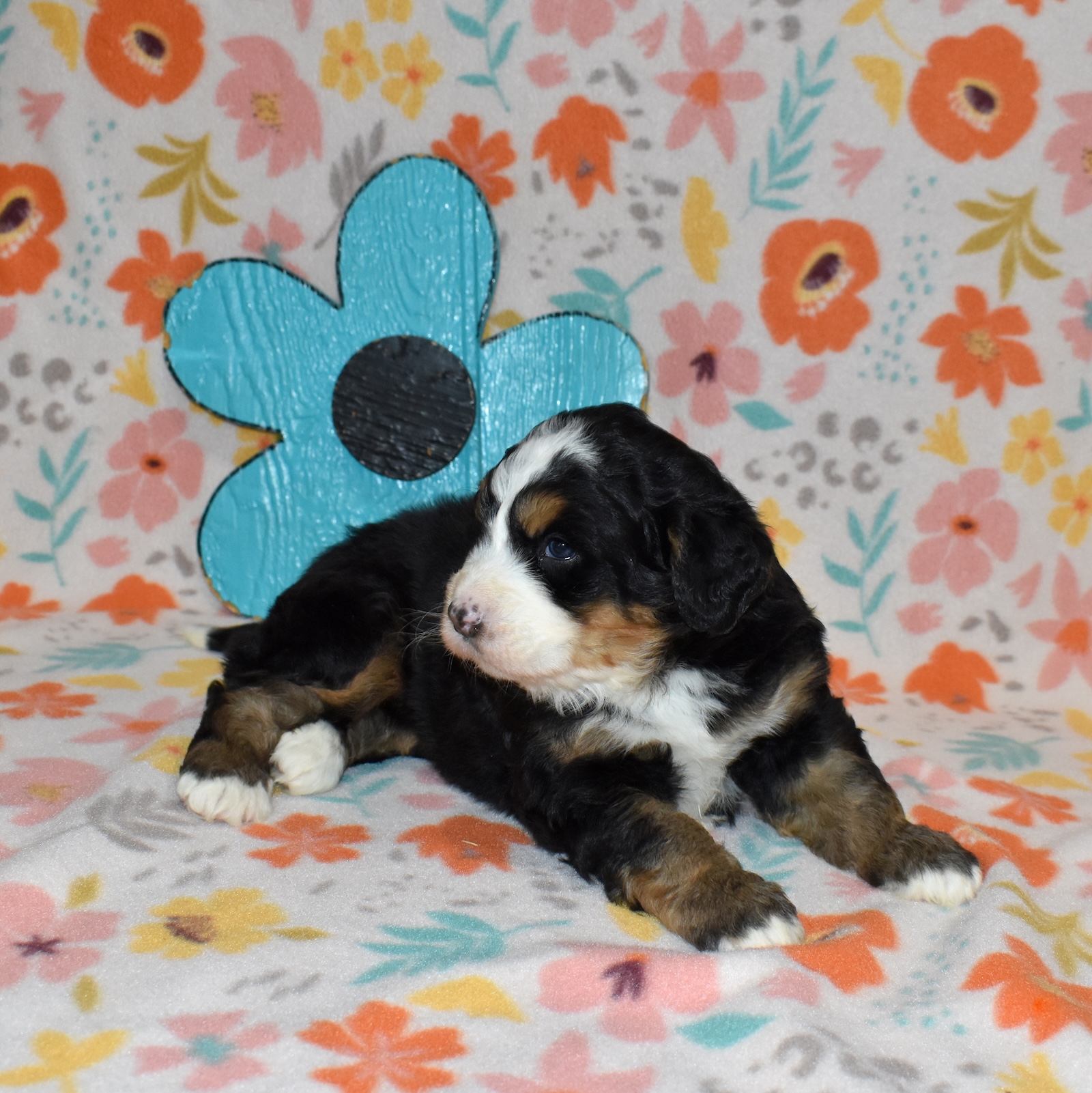 If you are looking for the ultimate “Classic Berner” look with a heart of gold, meet Fiesta! This stunning Ultra Bernedoodle female is a true show-stopper. She features a deep, jet-black coat, perfectly symmetrical rust markings, and a crisp white blaze that makes her look like she stepped right out of a painting.